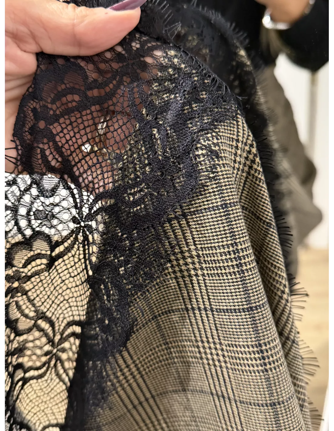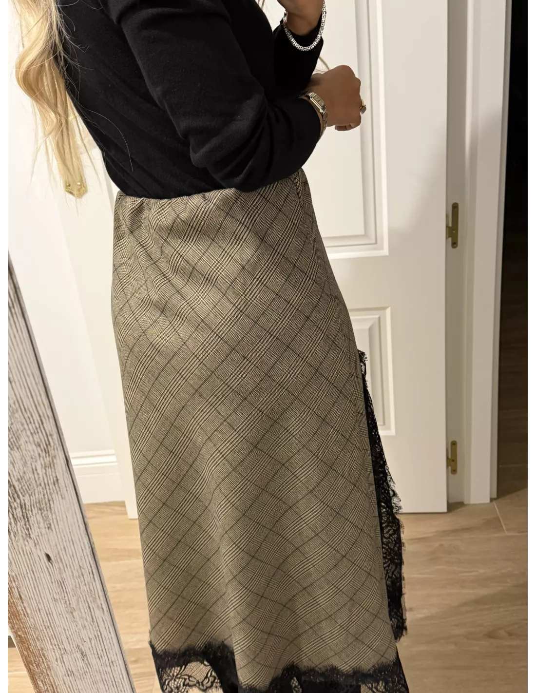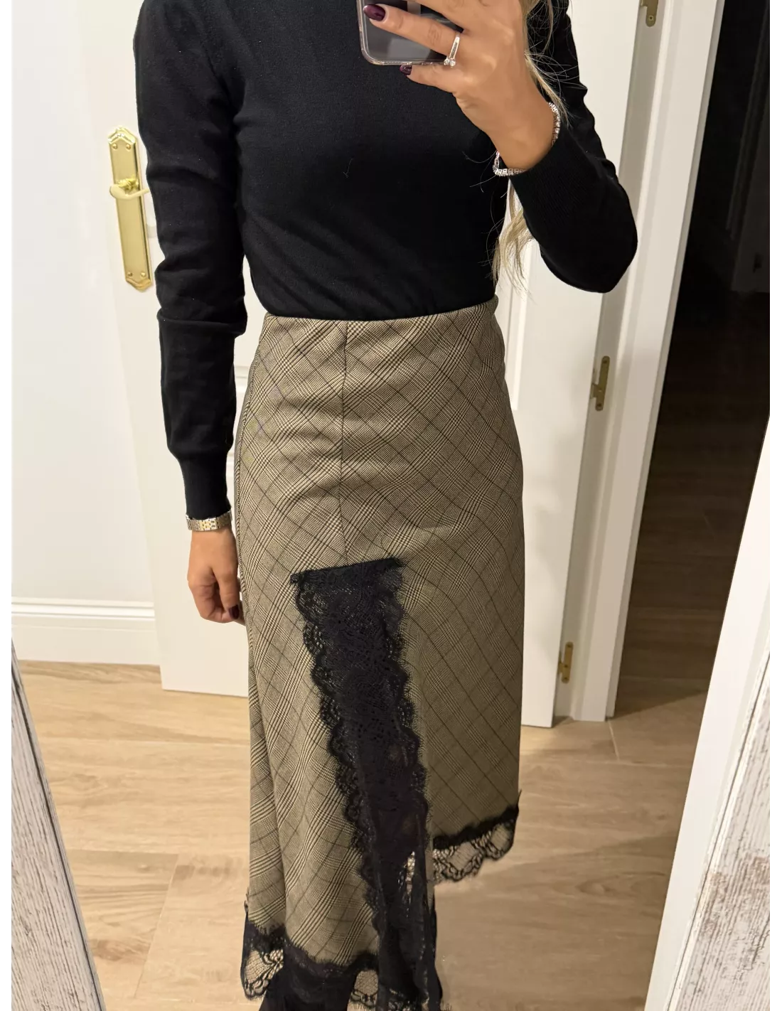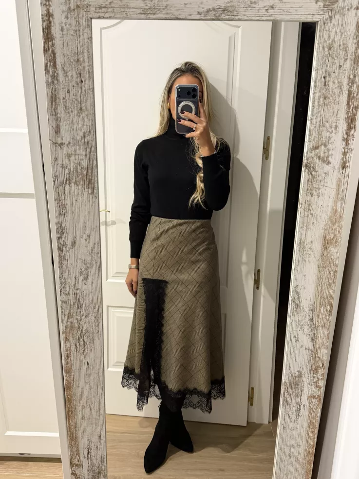 Falda de cuadros que va combinada con puntilla. No va forrada. Es un tejido no marca ni se transparenta. Lleva goma en la cintura.