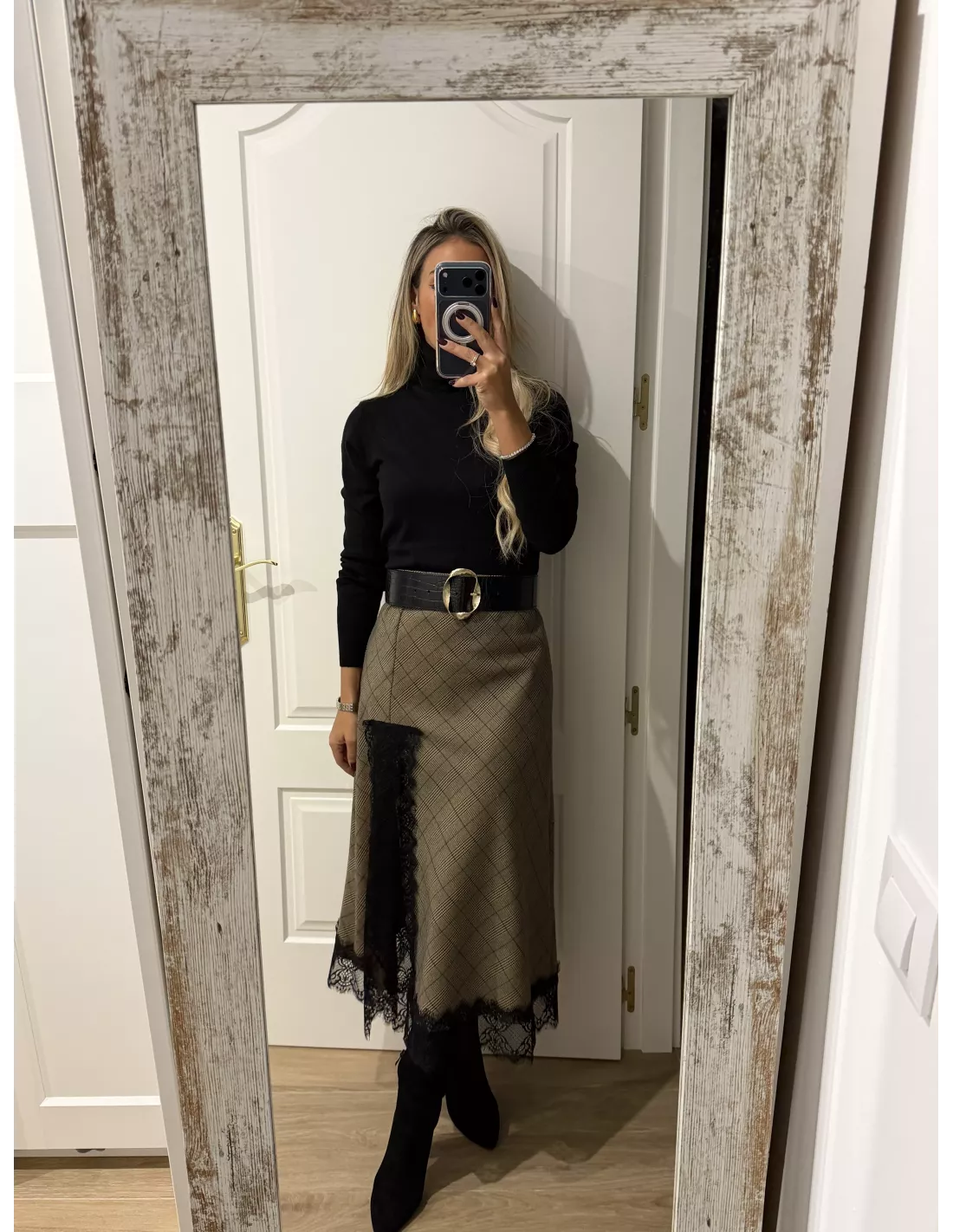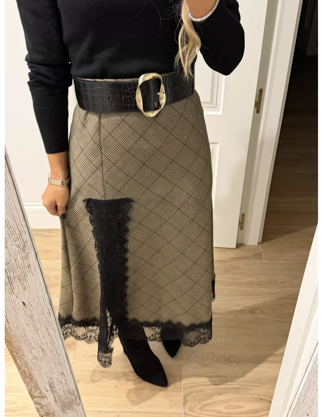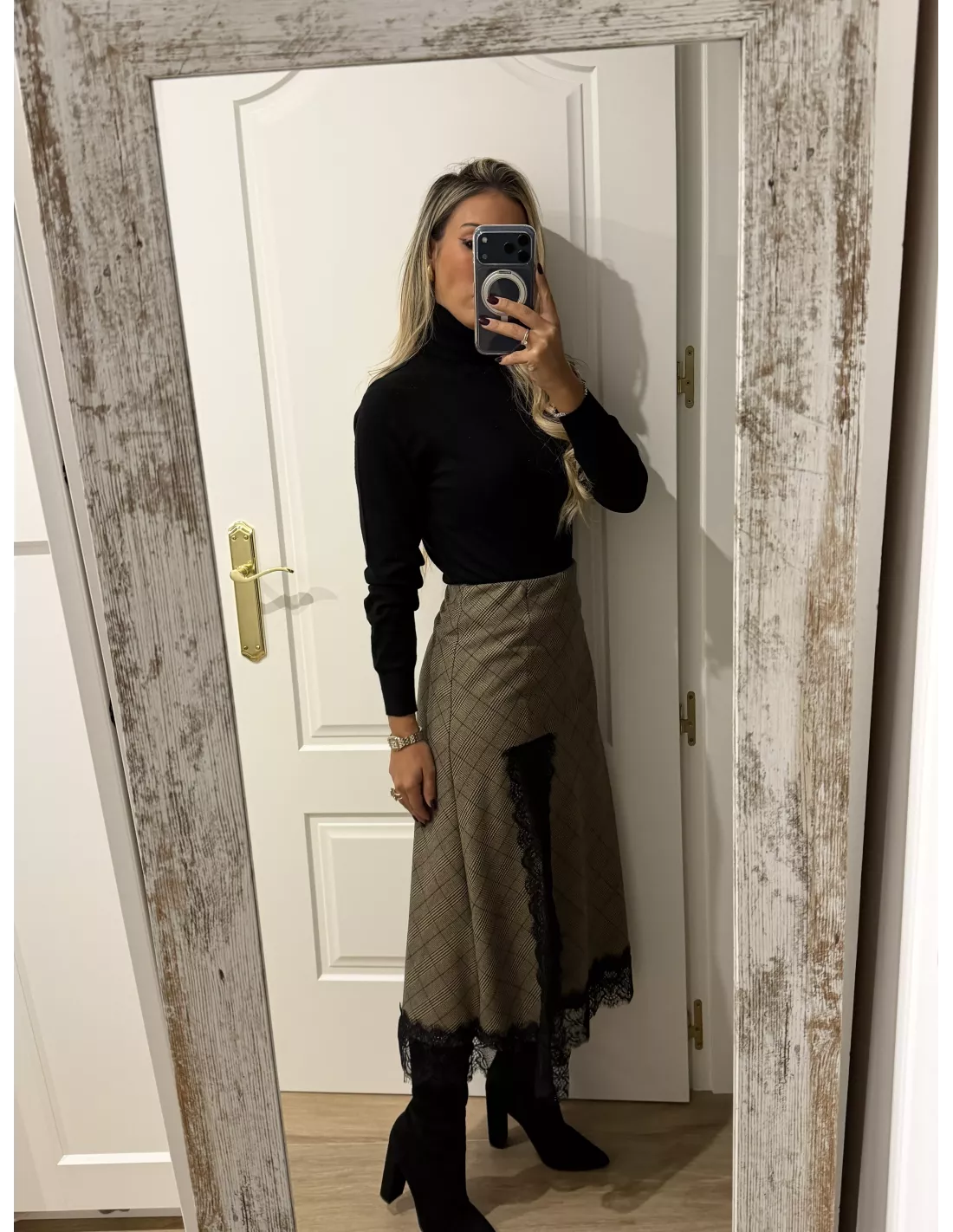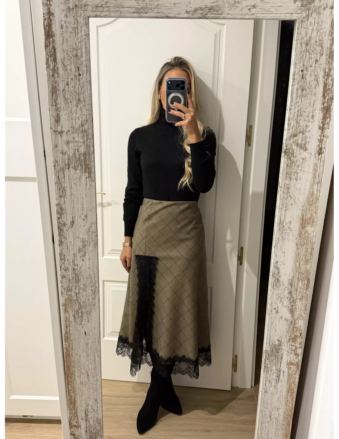 Falda de cuadros que va combinada con puntilla. No va forrada. Es un tejido no marca ni se transparenta. Lleva goma en la cintura.