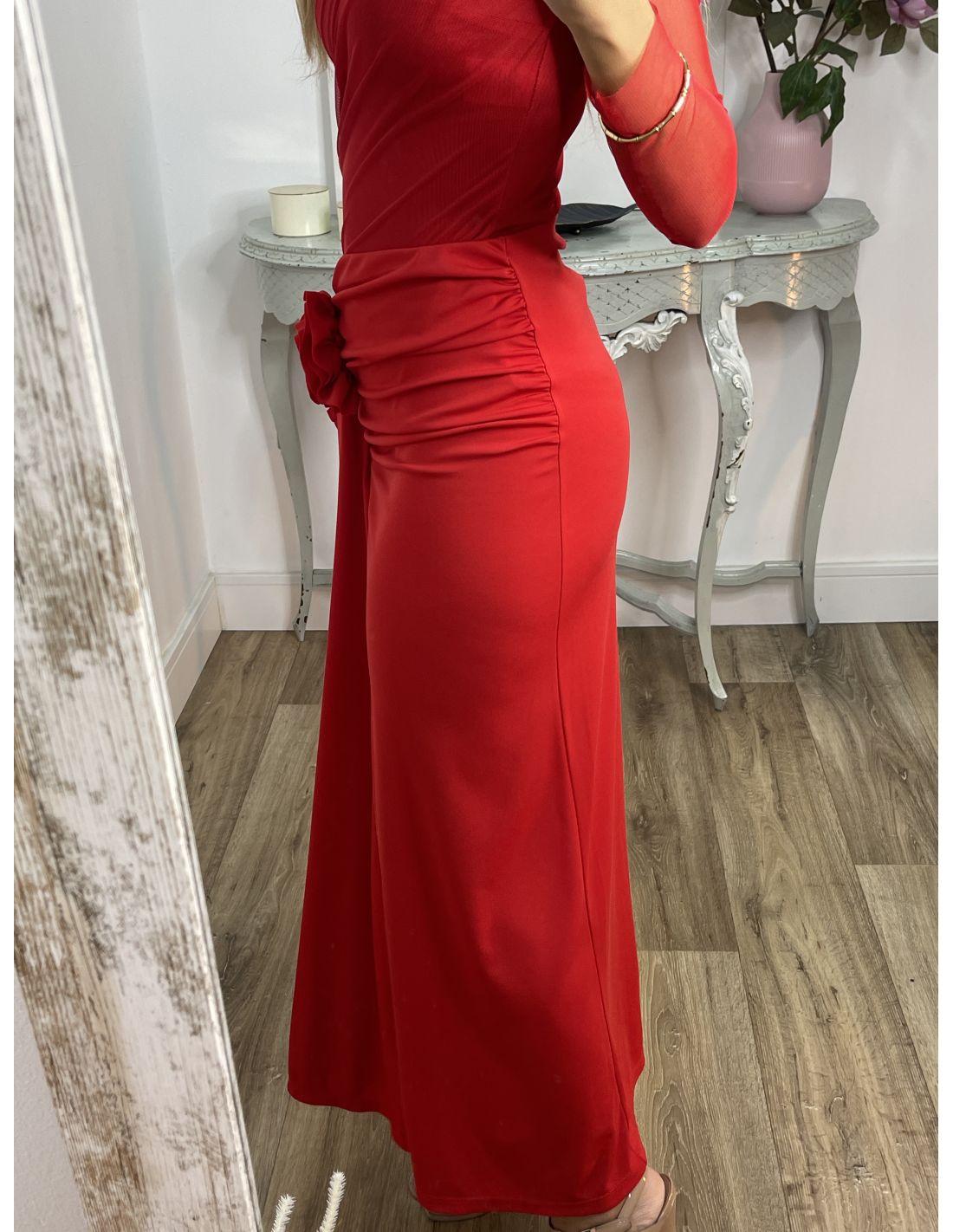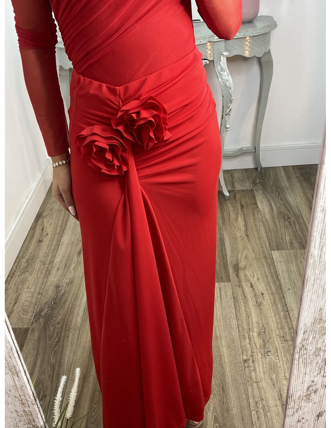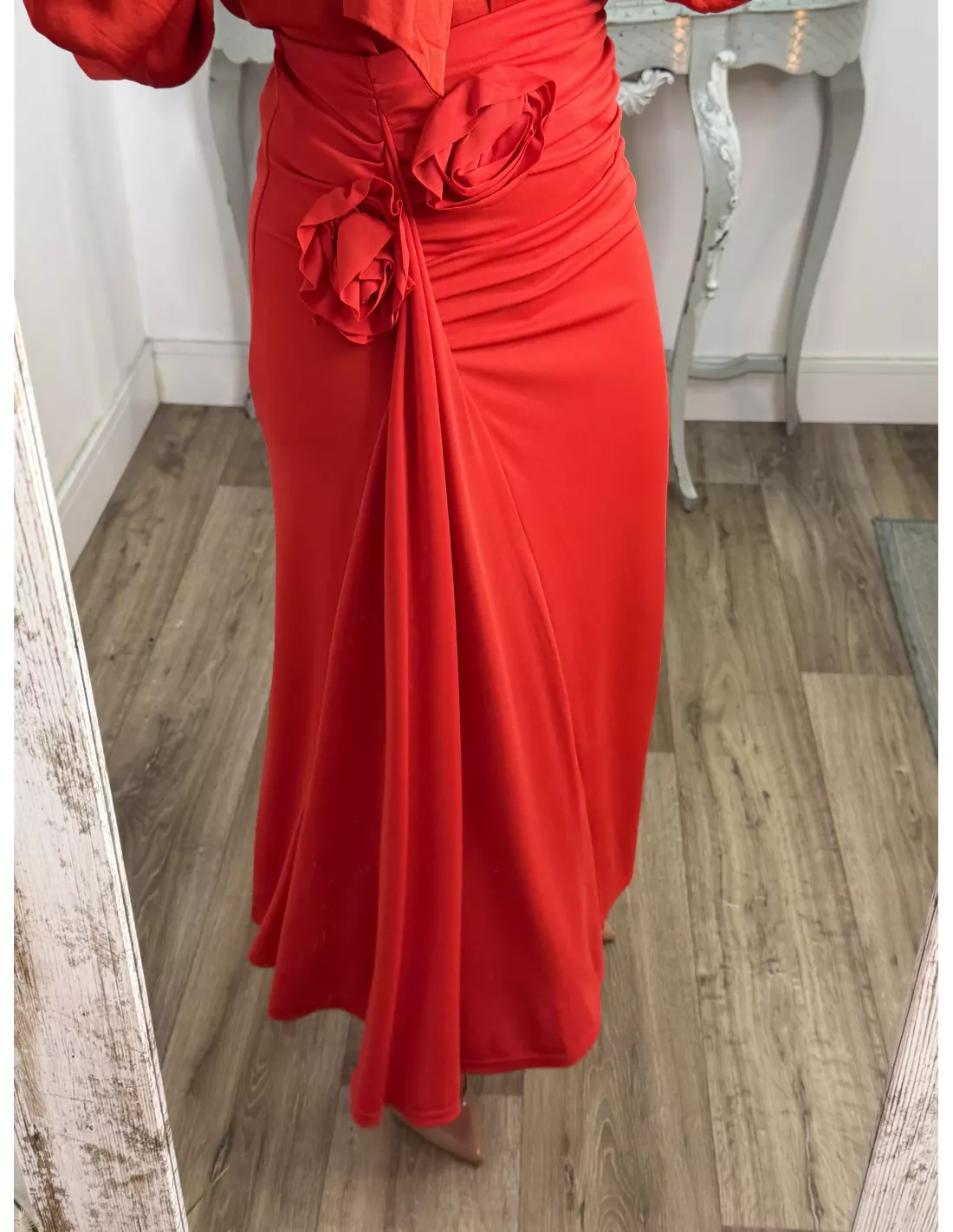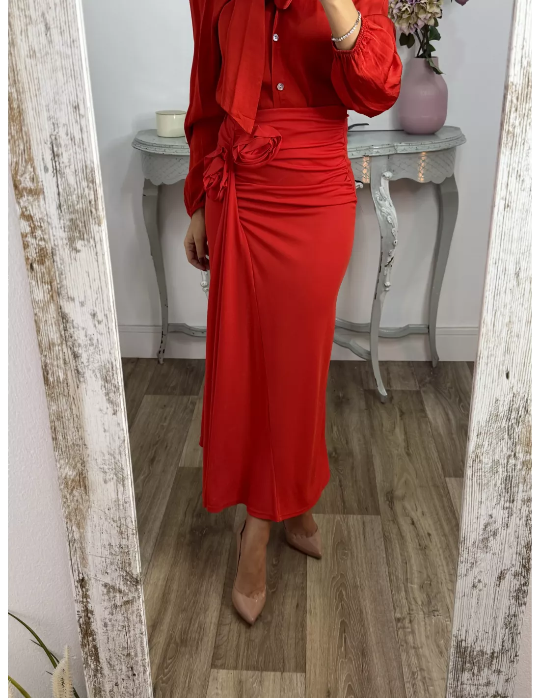 Falda de punto con adornos e flores en la parte delantera. Lleva goma en la cintura.