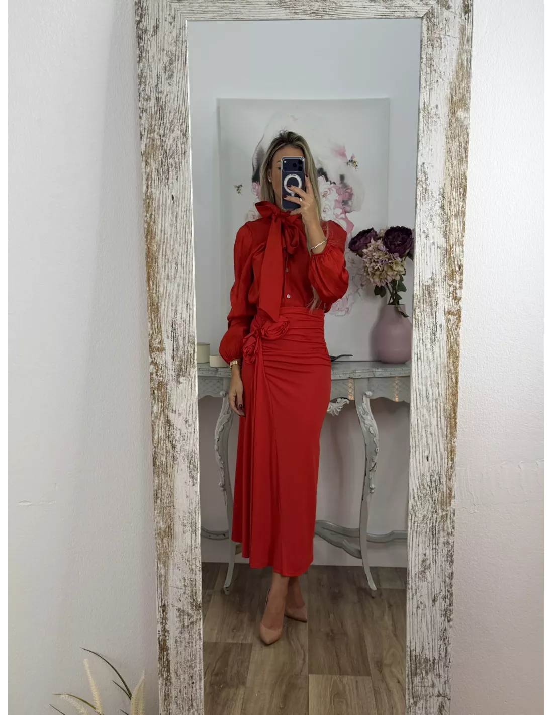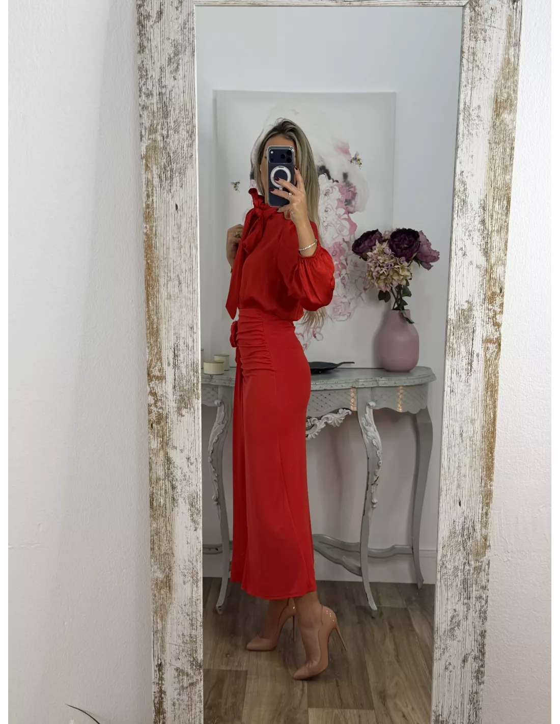 La modelo lleva puesta la talla S, ella utiliza de forma habitual la talla xs-s y mide 1,60cm