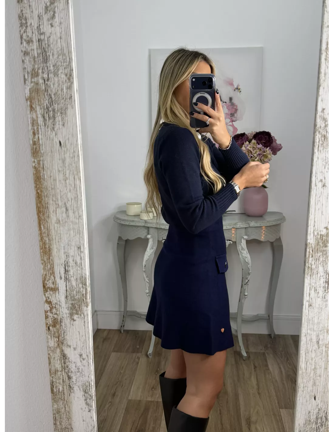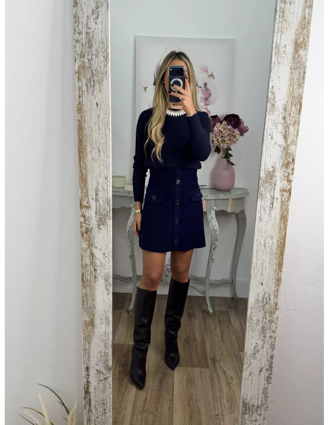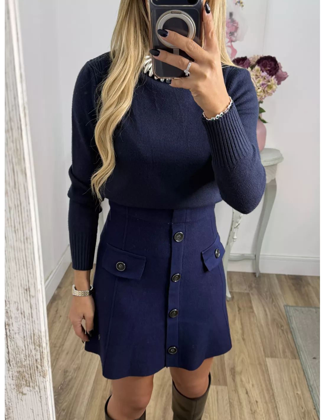 Falda de punto con botones azul marino