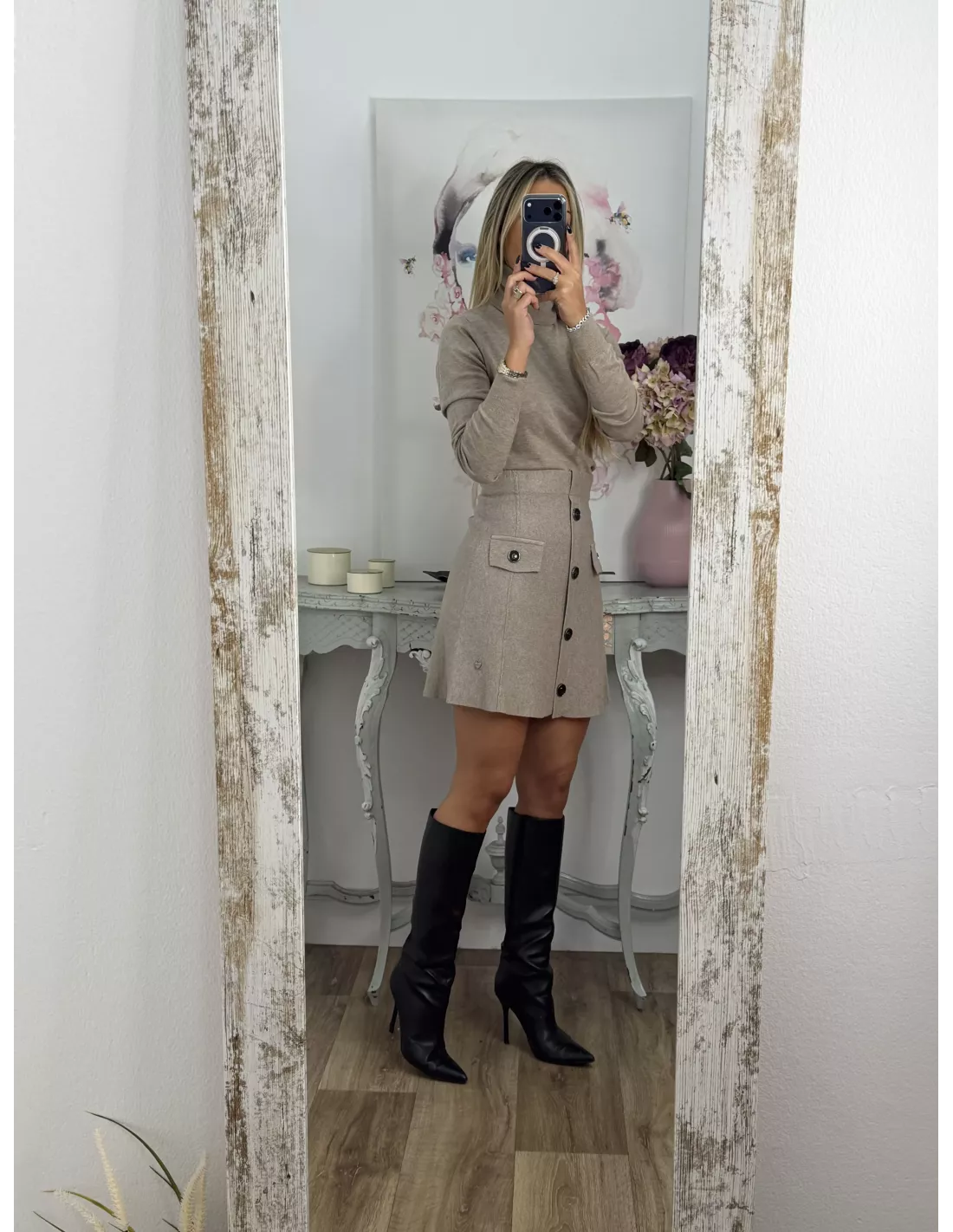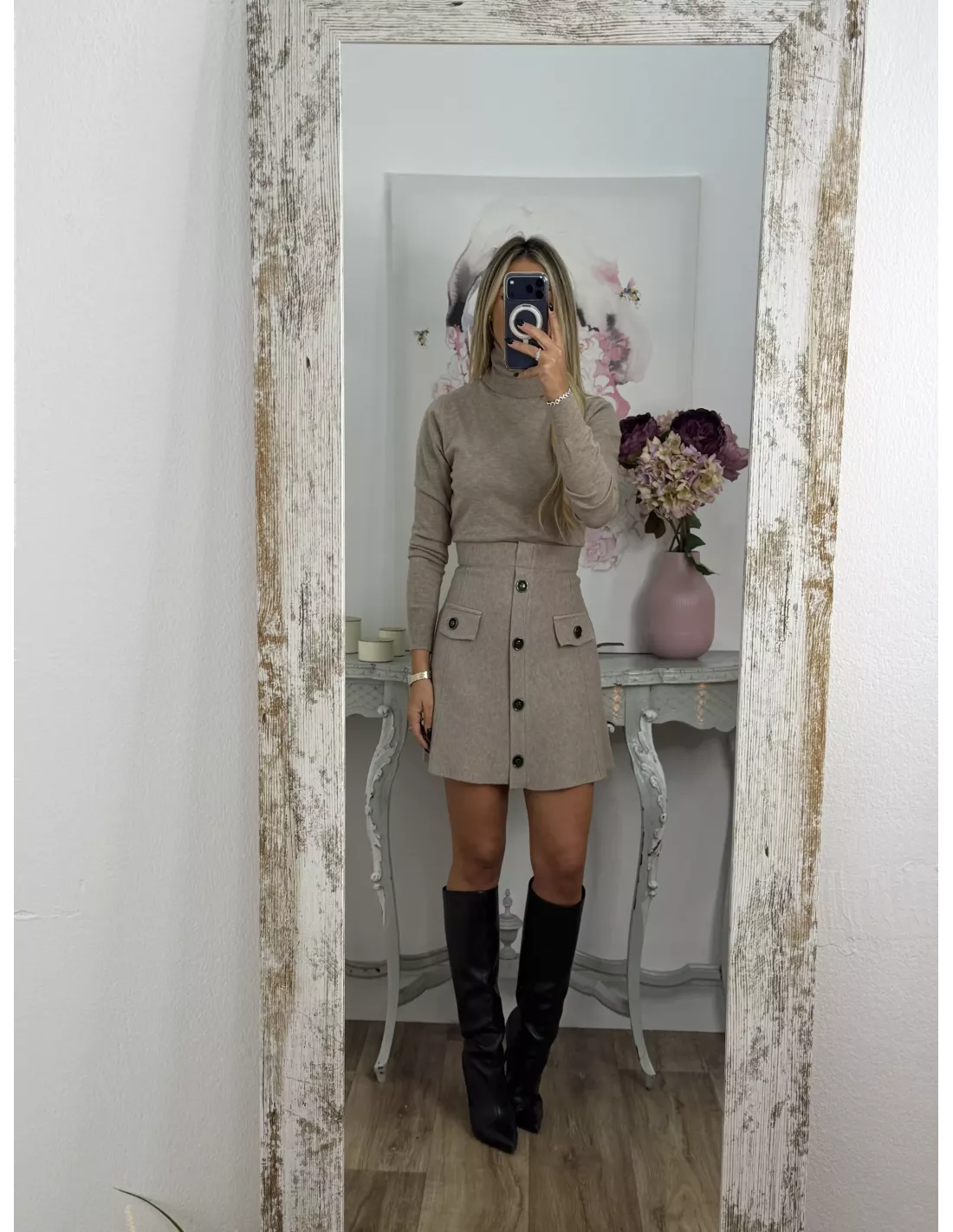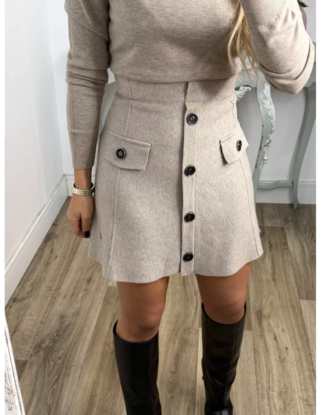 Falda de punto con botones taupe