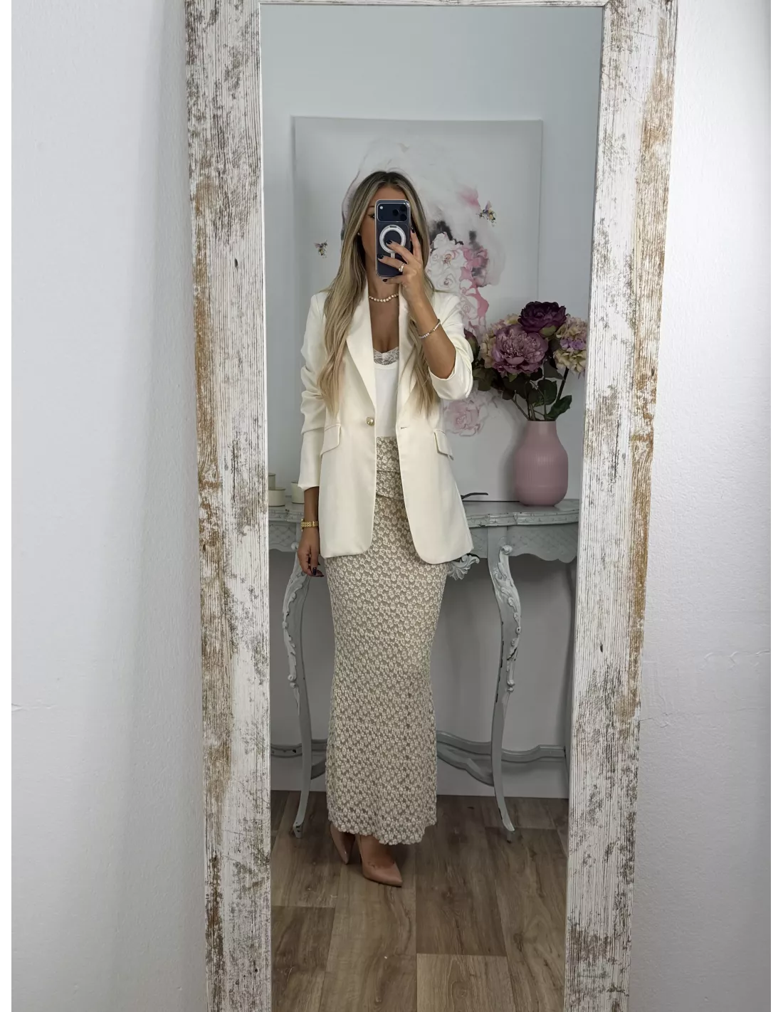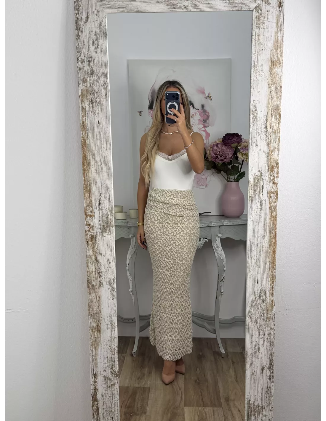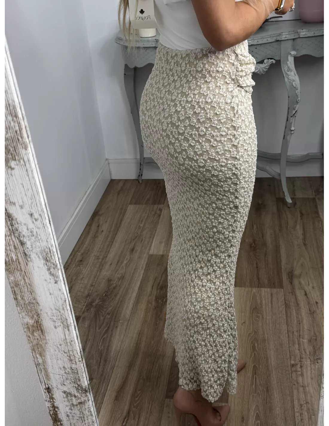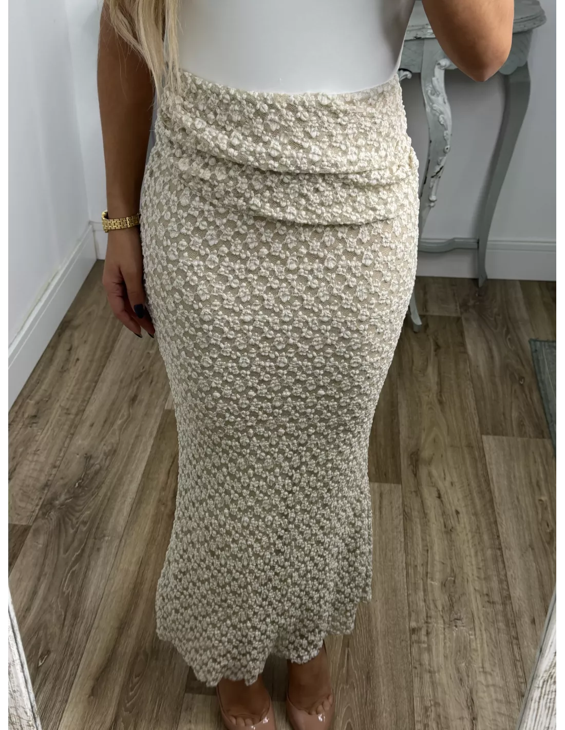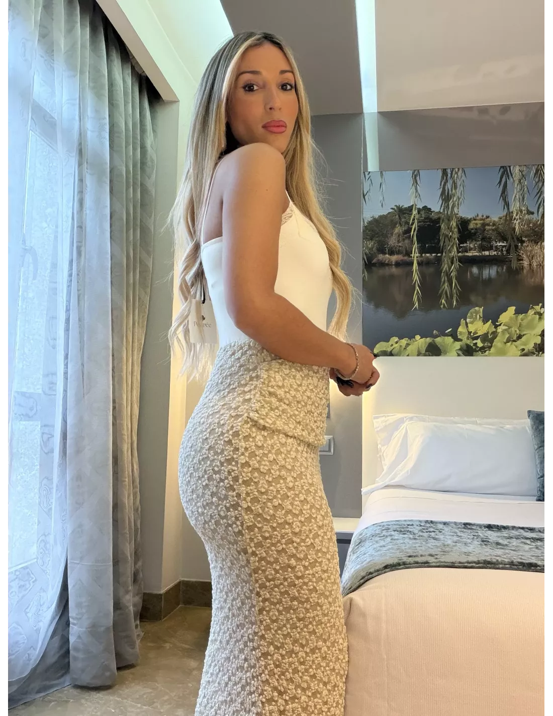 Falda de punto, va forrada hasta abajo. Lleva goma en la cintura. De corte sirena