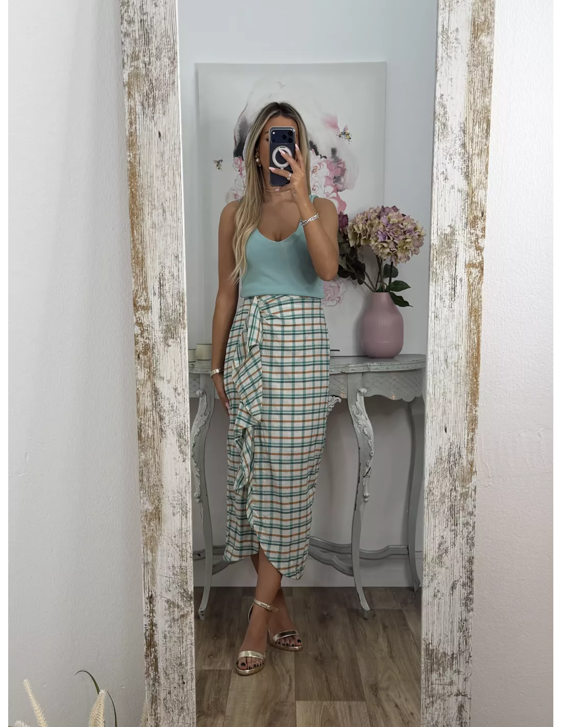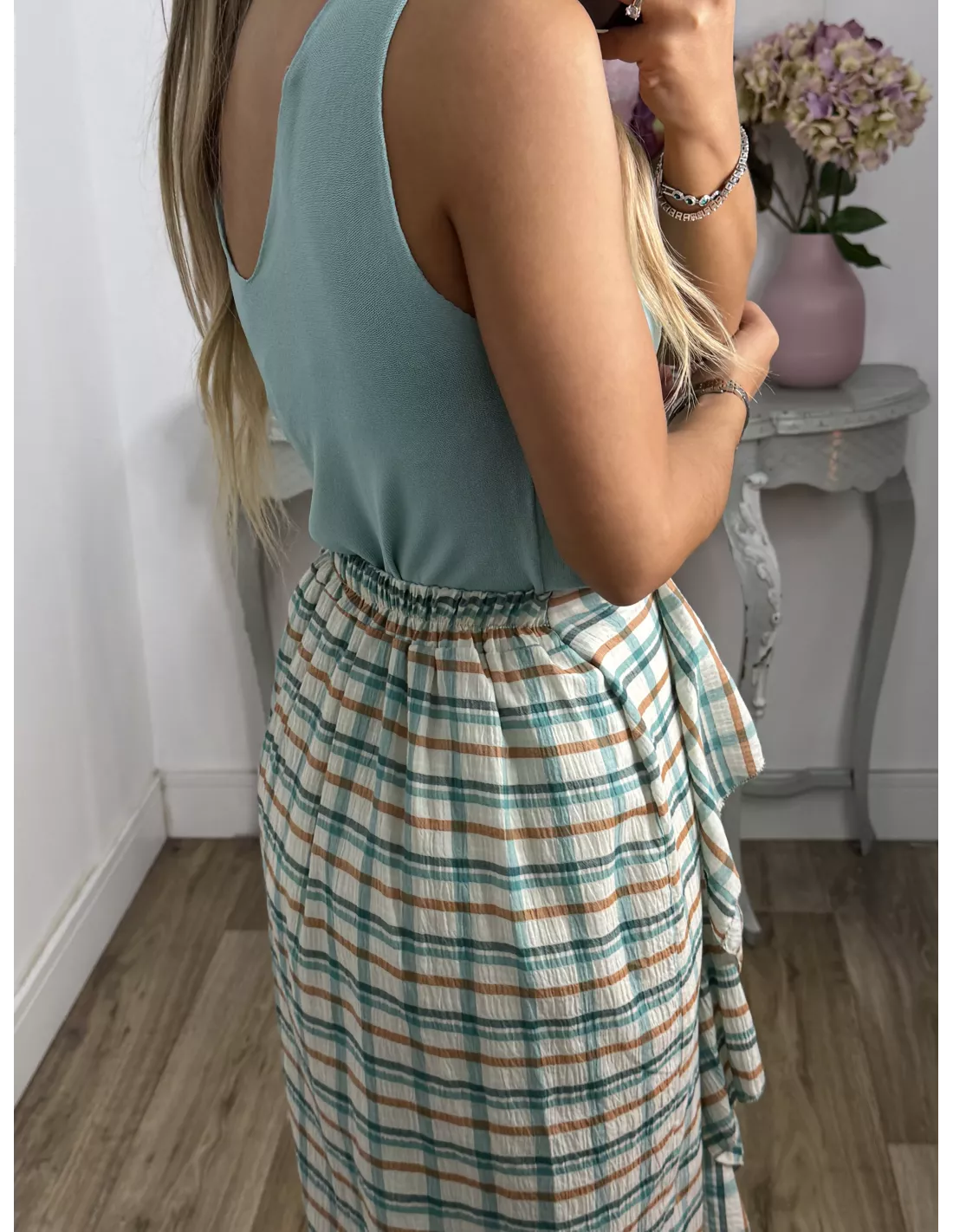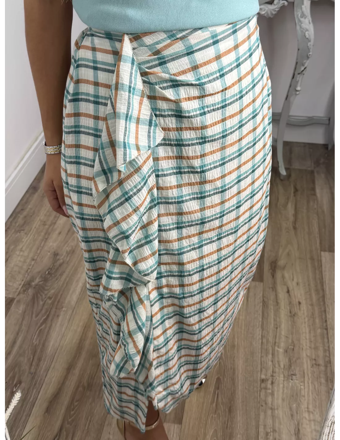 Falda de cuadros con goma en la cintura y va forrada. Lleva un volante en la parte delantera.