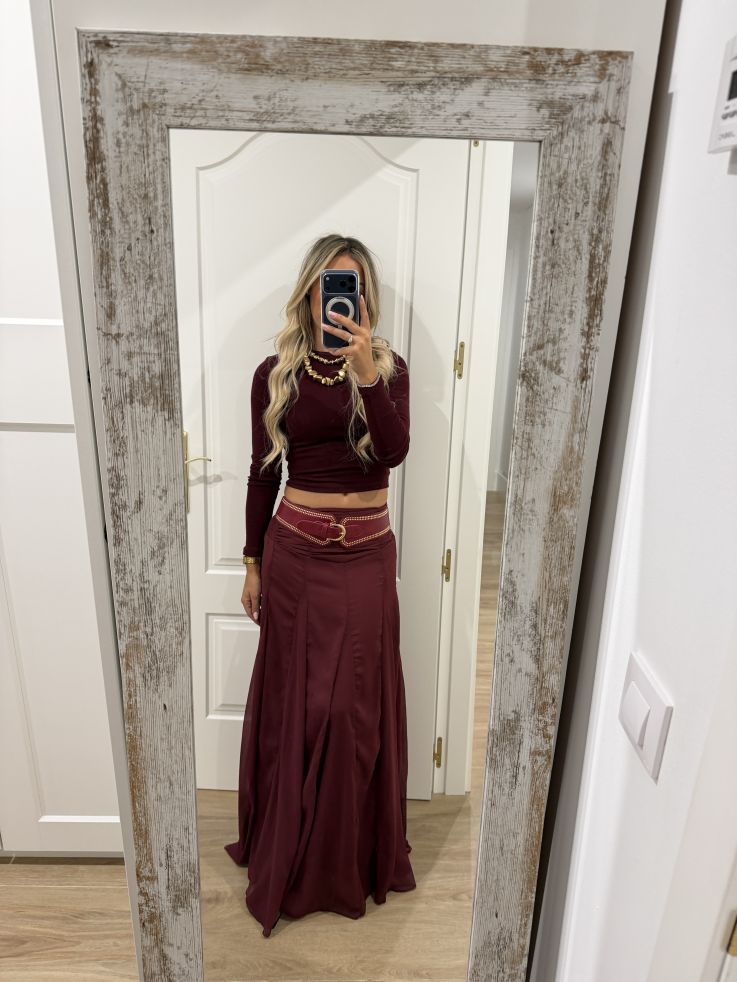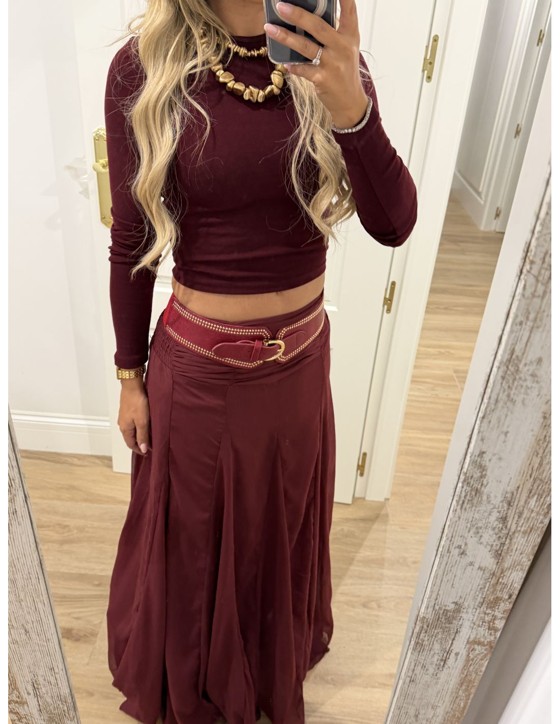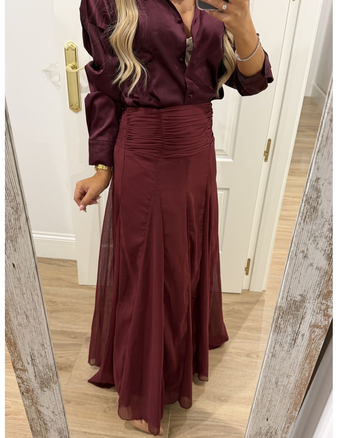 Falda de tejido tipo gasa que va forrado. L parte de la cintura lleva unas plieges y la parte de atrás es engomada.