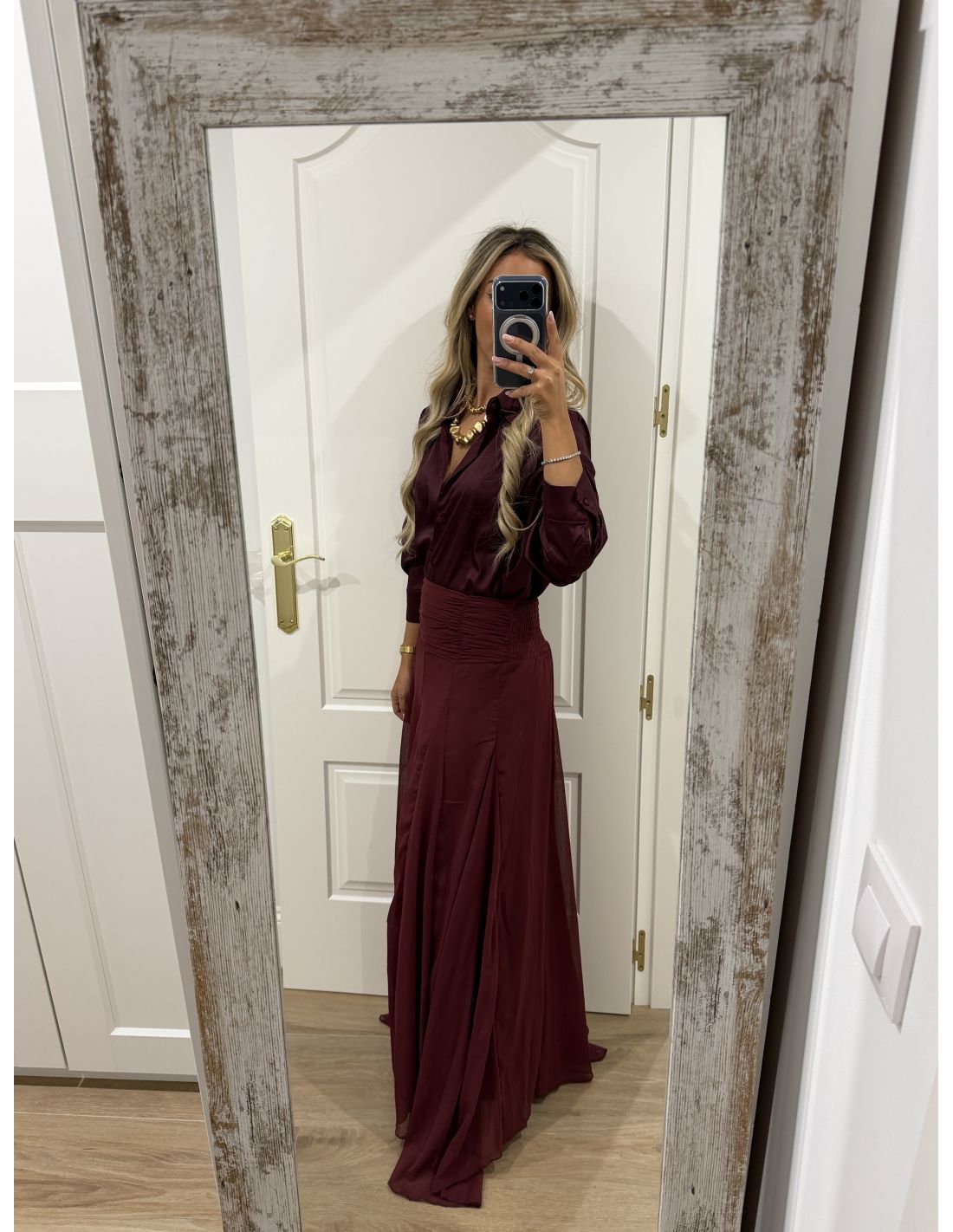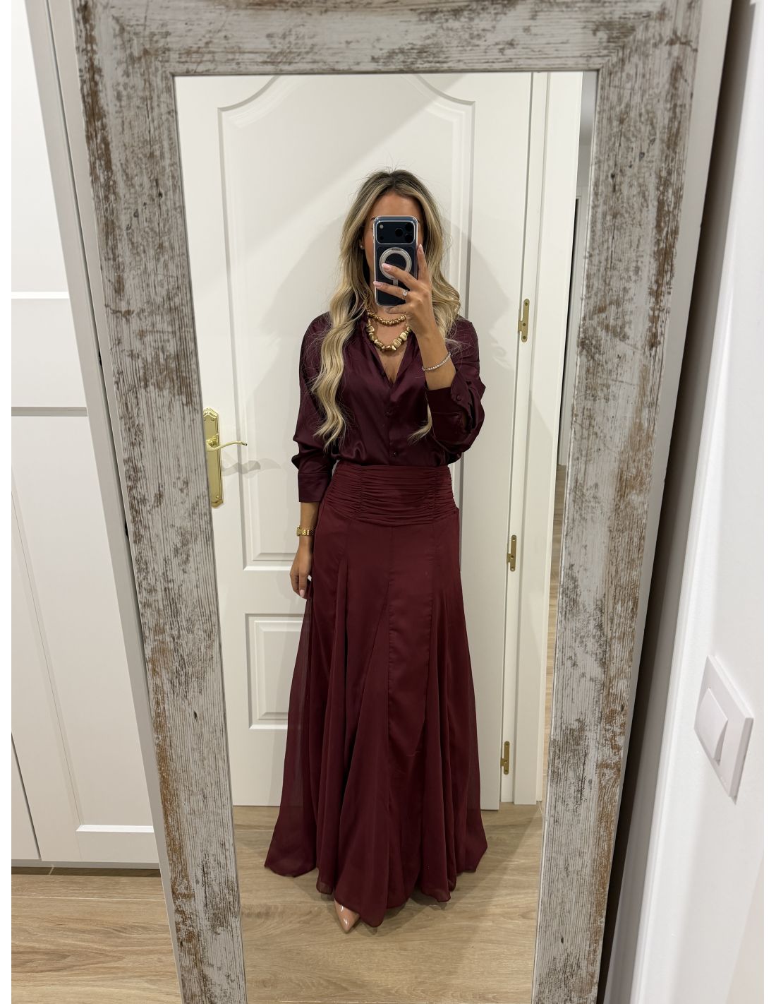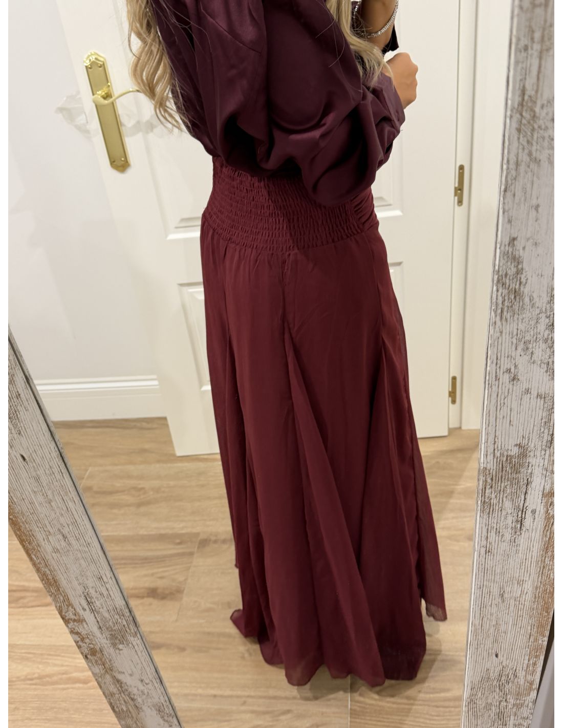 Falda de tejido tipo gasa que va forrado. L parte de la cintura lleva unas plieges y la parte de atrás es engomada.