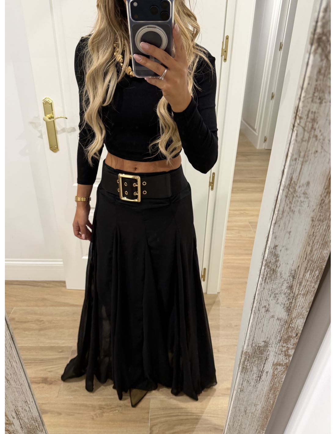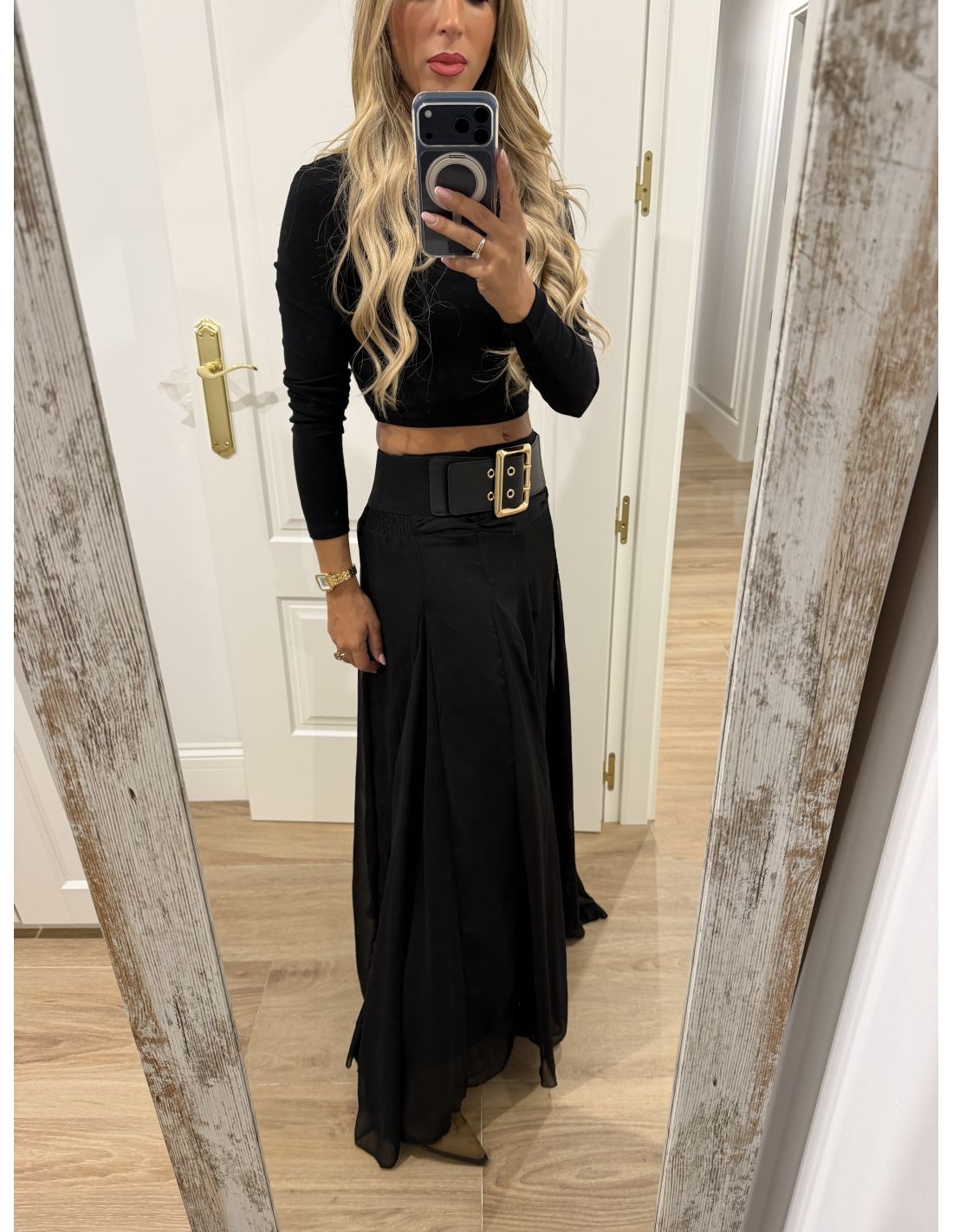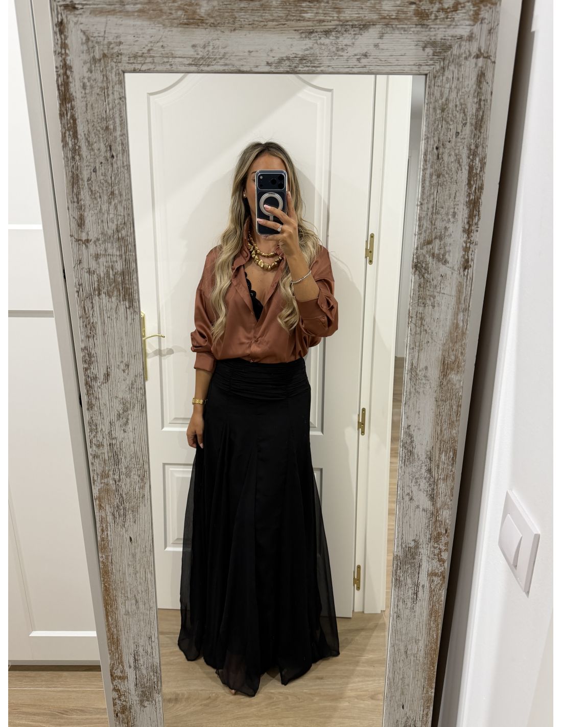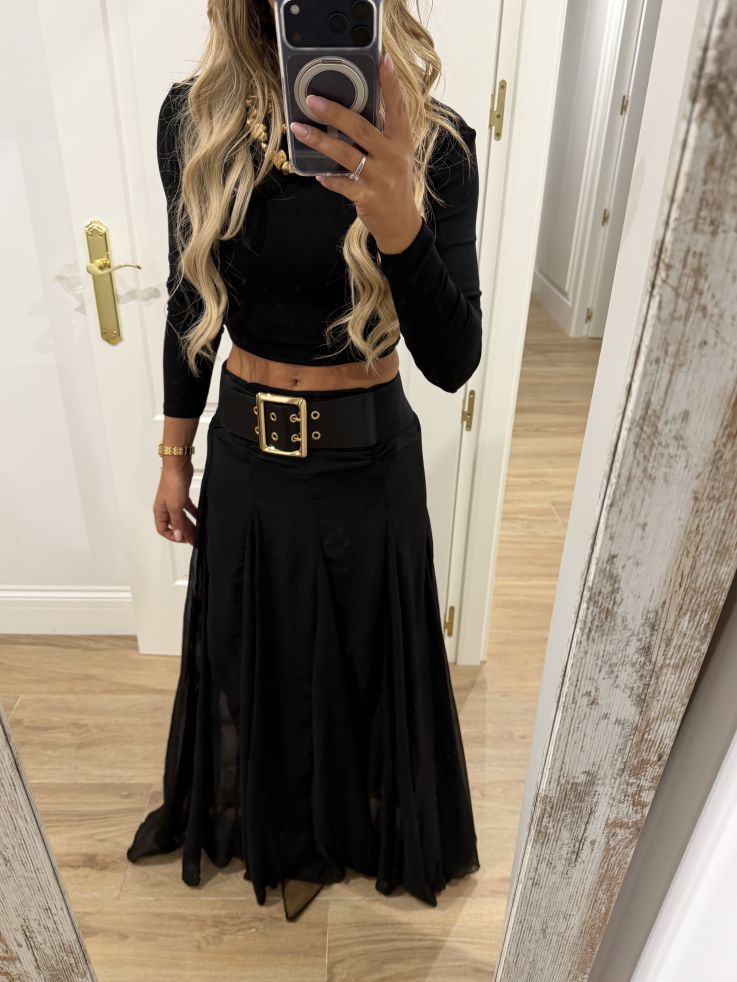 Falda de tejido tipo gasa que va forrado. L parte de la cintura lleva unas plieges y la parte de atrás es engomada.