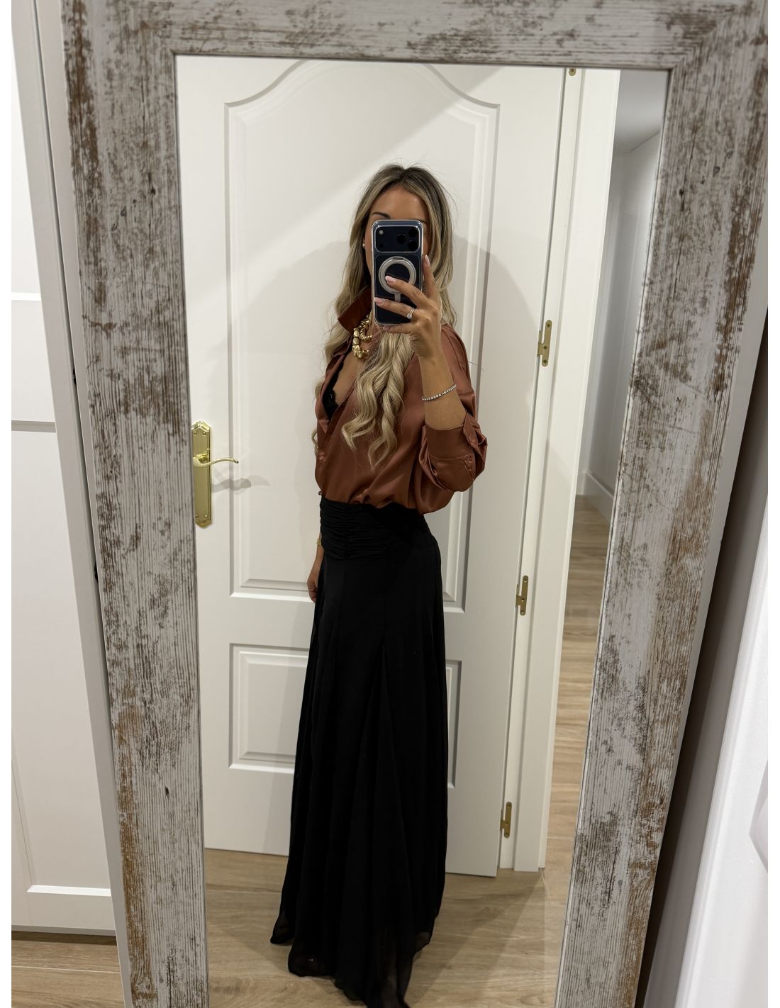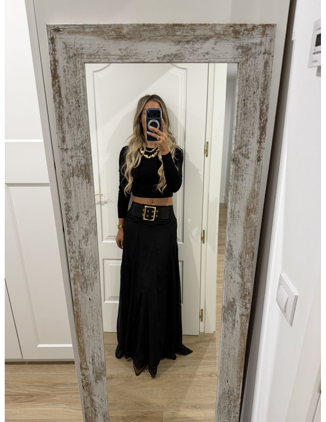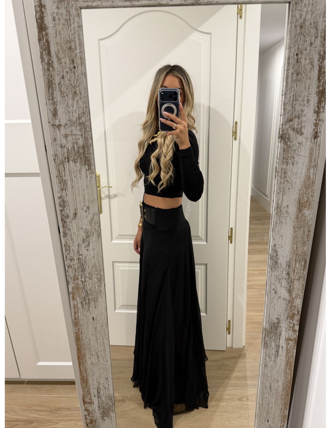 Falda de tejido tipo gasa que va forrado. L parte de la cintura lleva unas plieges y la parte de atrás es engomada.