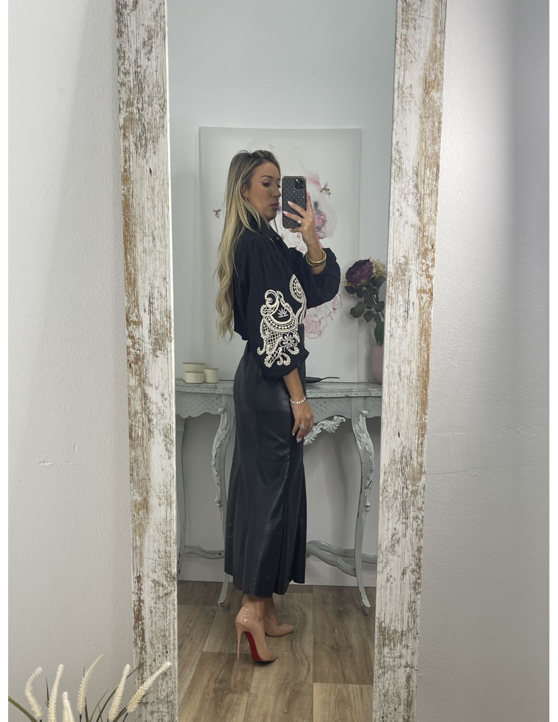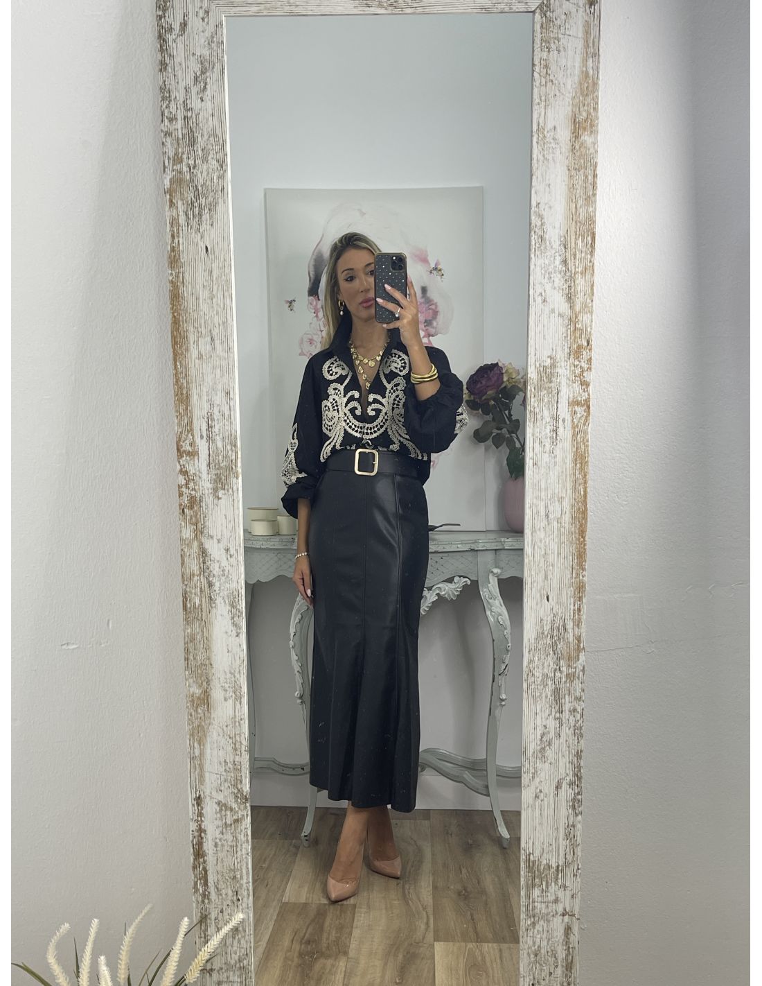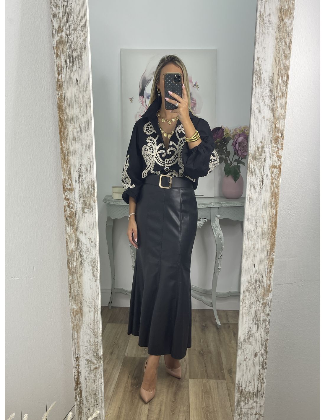 Falda de polipiel, con corte de neja. Es polipiel. Se cierra con cremallera invisible en el lateral. La falda no incluye el cinturón, lo tienes disponible en la sección de accesorios.