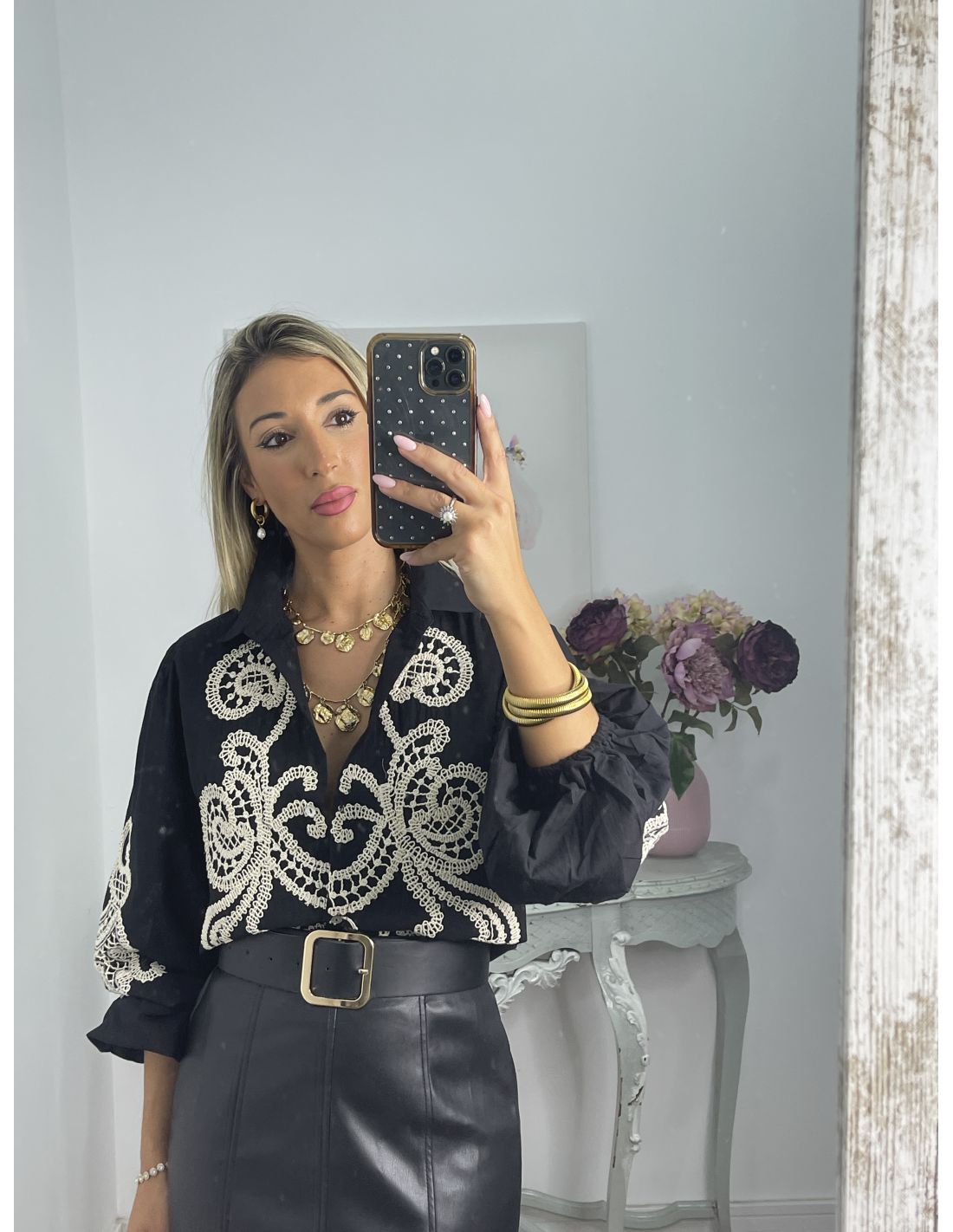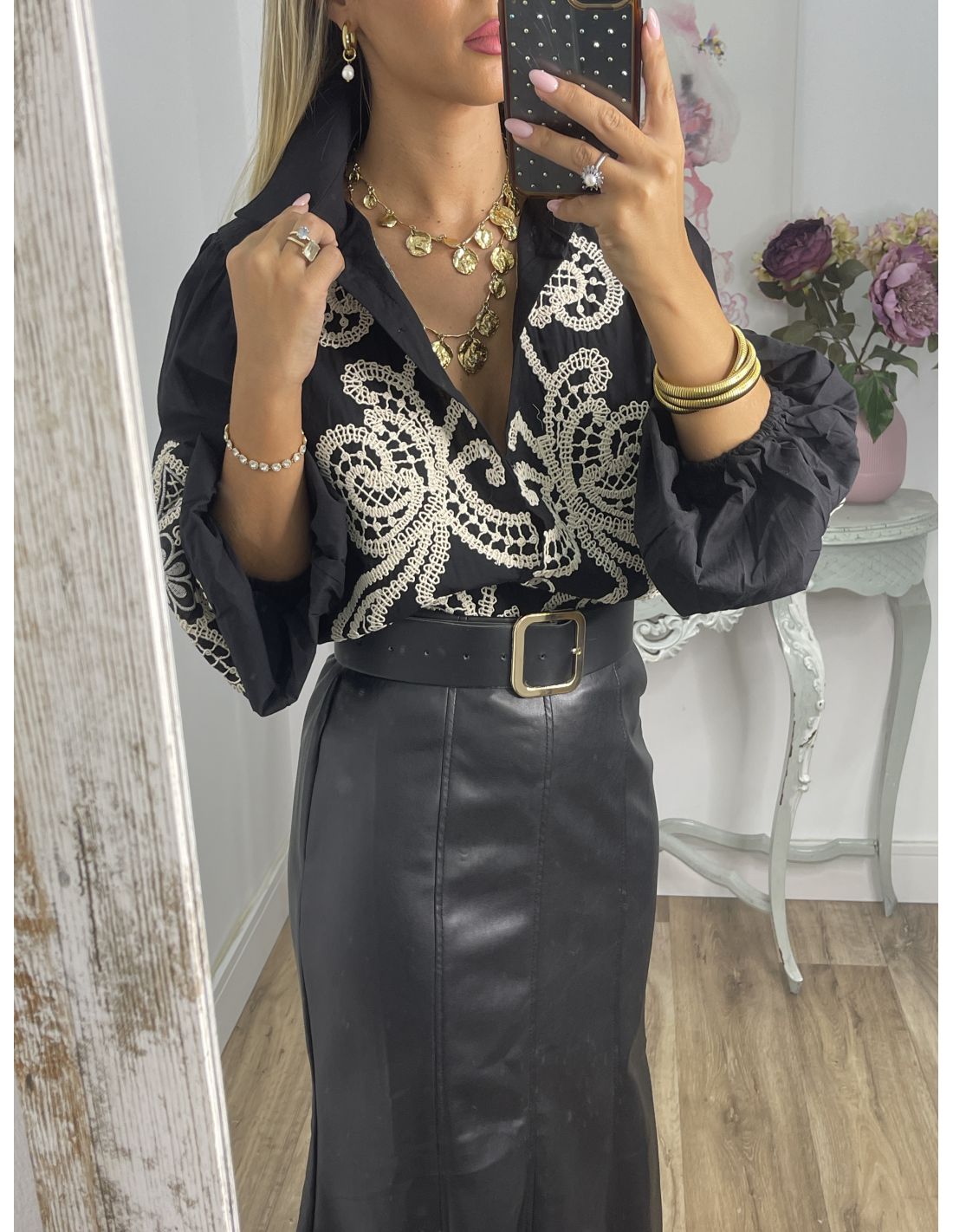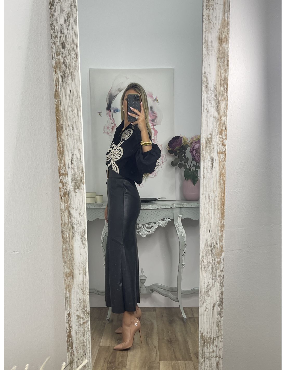 Falda de polipiel, con corte de neja. Es polipiel. Se cierra con cremallera invisible en el lateral. La falda no incluye el cinturón, lo tienes disponible en la sección de accesorios.