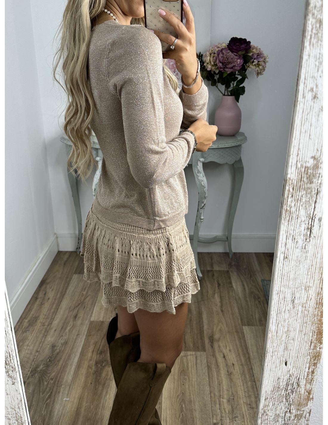 Falda pantalón de hilo con volantes. Parece una falda tanto por delante como por detrás. Lleva un hilo de lurex por toda la falda.