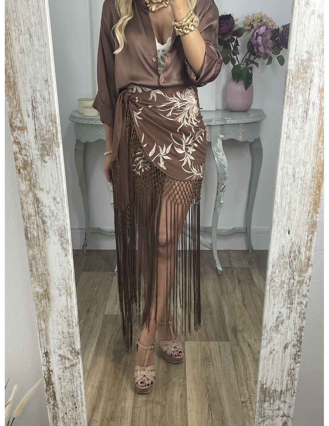 Falda pantalón chocolate bordados con flecos