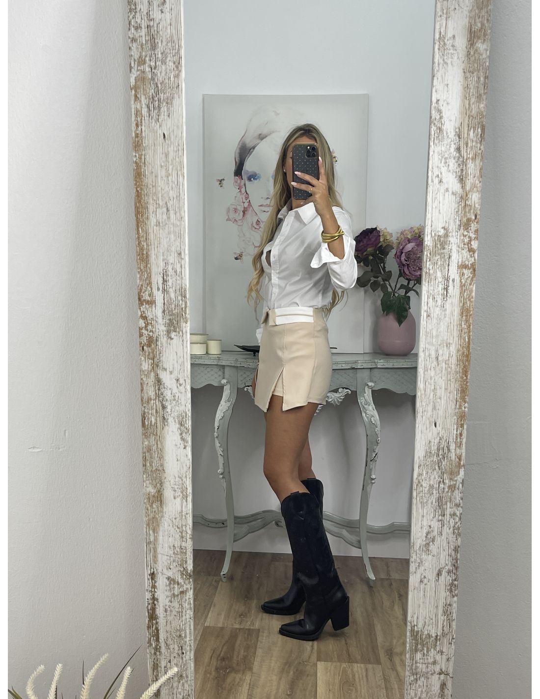 Falda pantalón que la parte delantera parece una falda y la parte de atrás es un pantalón. Lleva una cinturilla en color blanco. Tiene goma en la cintura. Talla justa