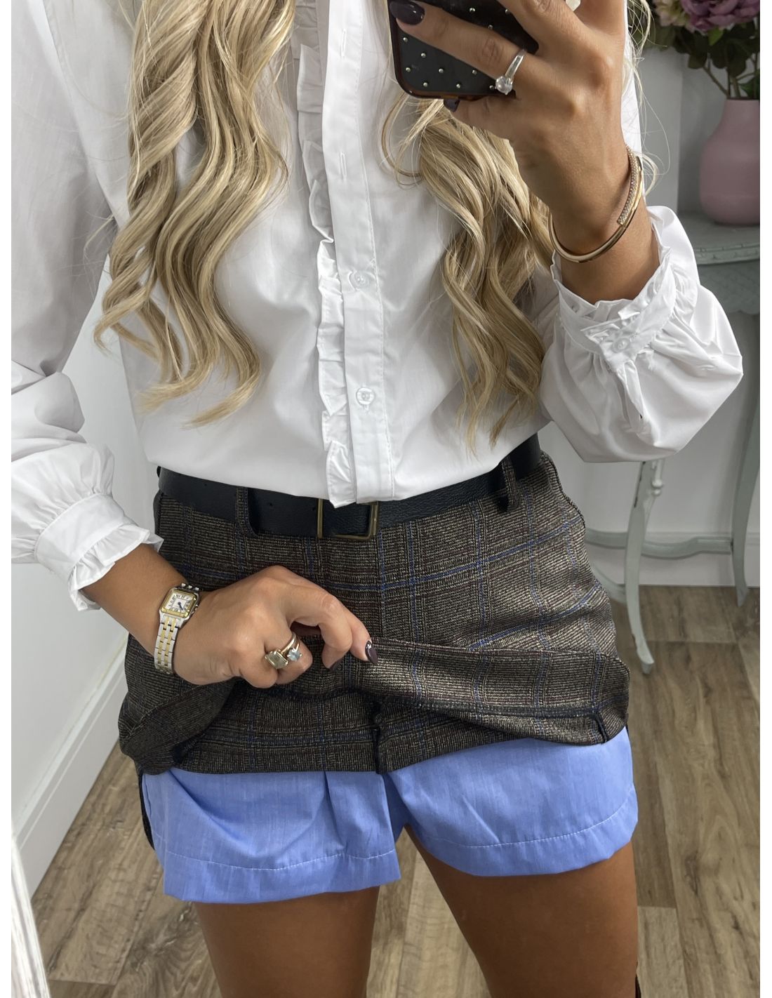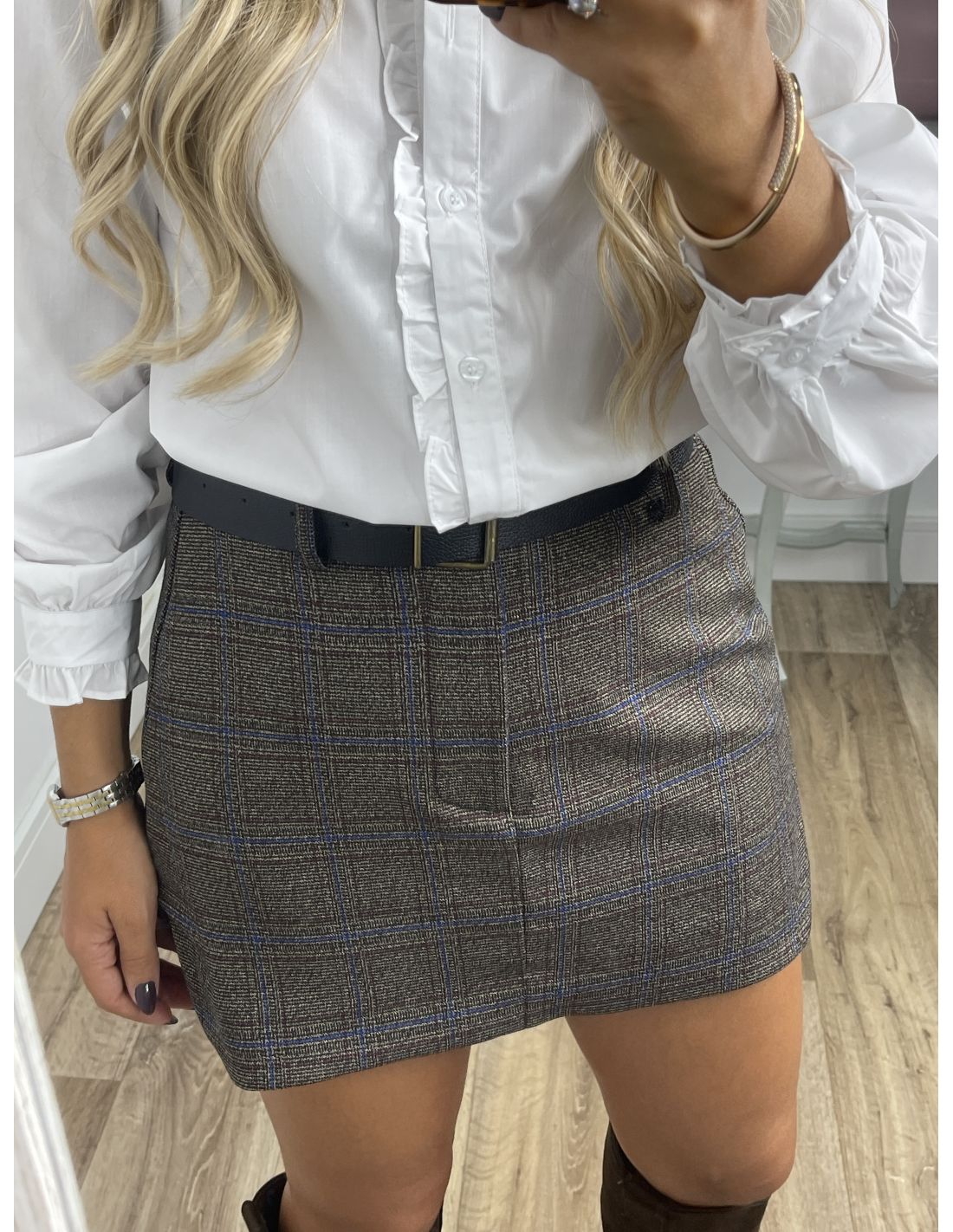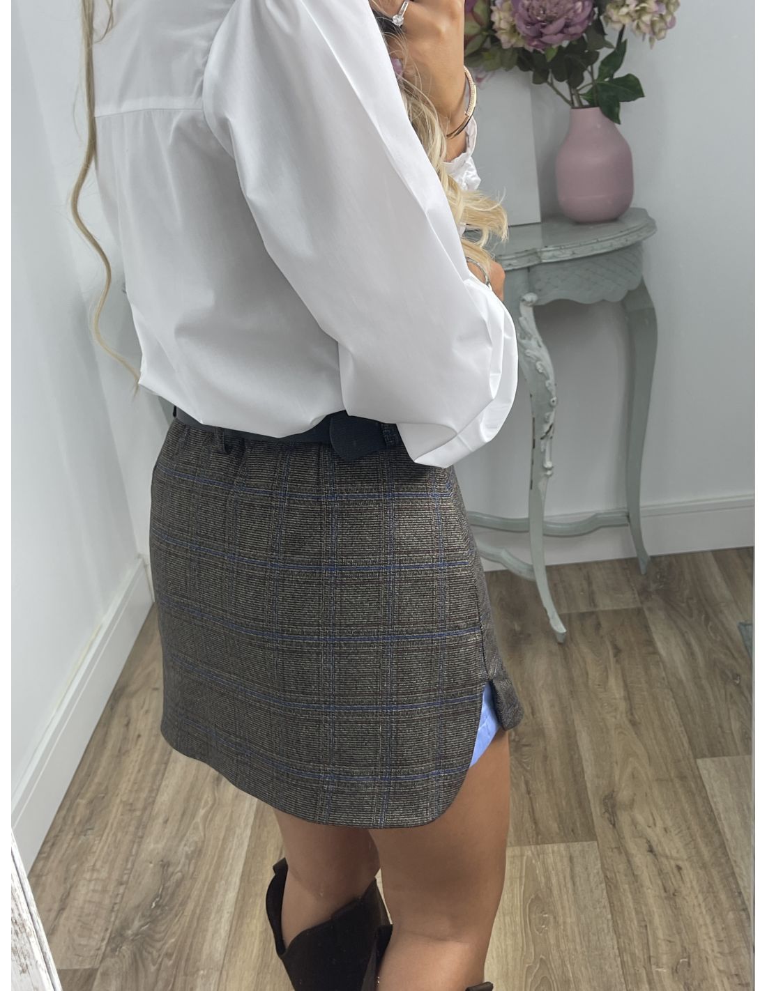Falda pantalón de corte ajustado. La parte del pantalón interior es azul. Incluye el cinturón.