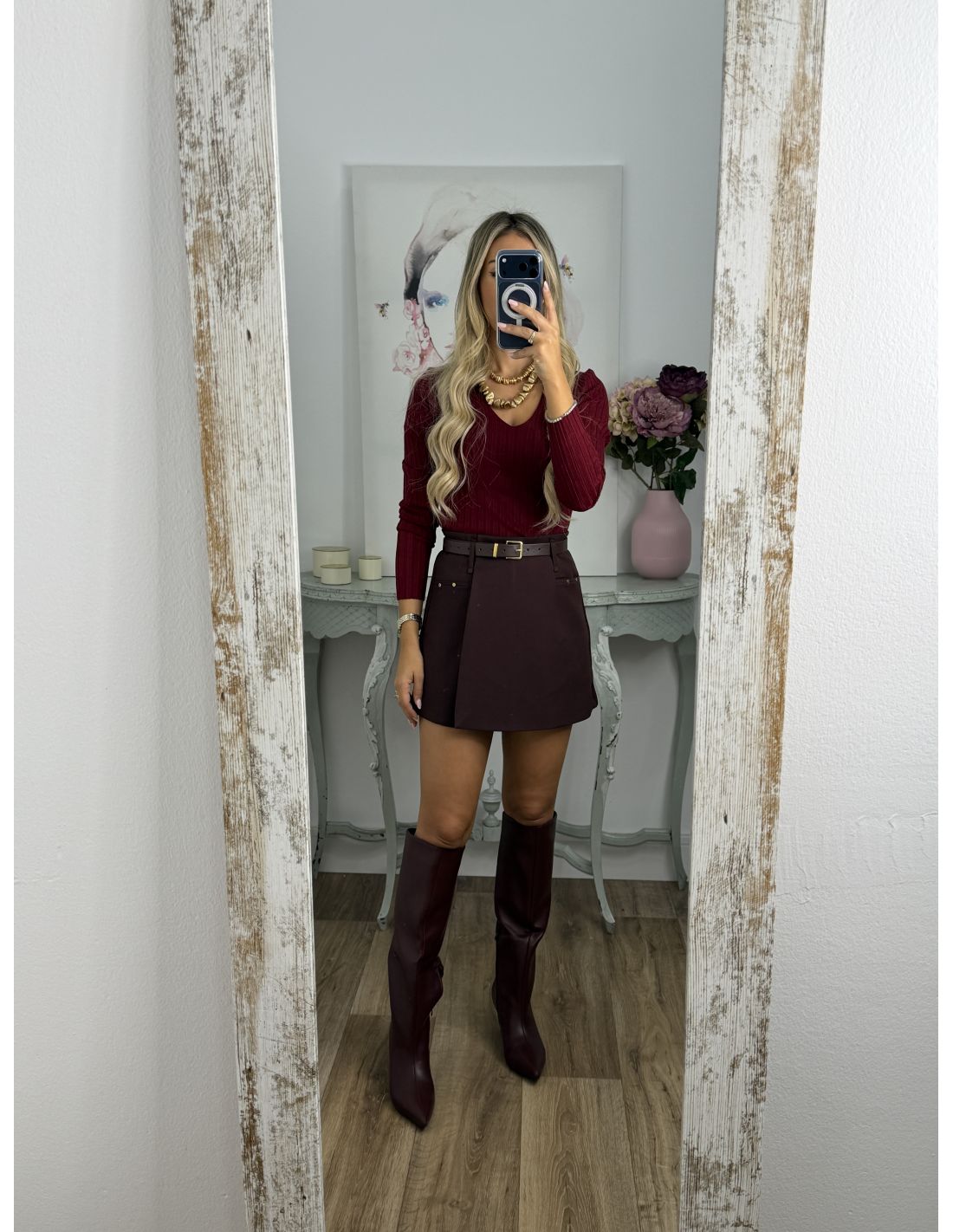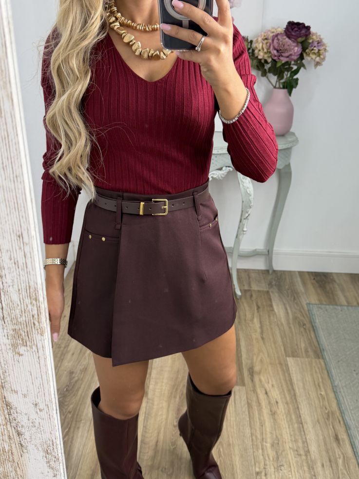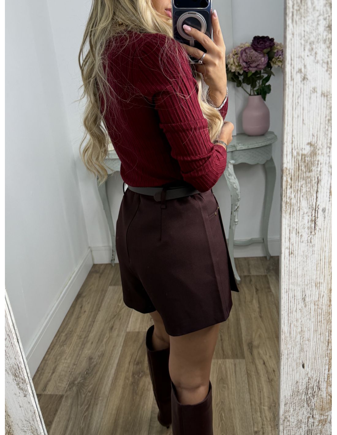 Falda pantalón que parece una falda por delante y un pantalón por detrás. Incluye el cinturón. Es de tiro alto.