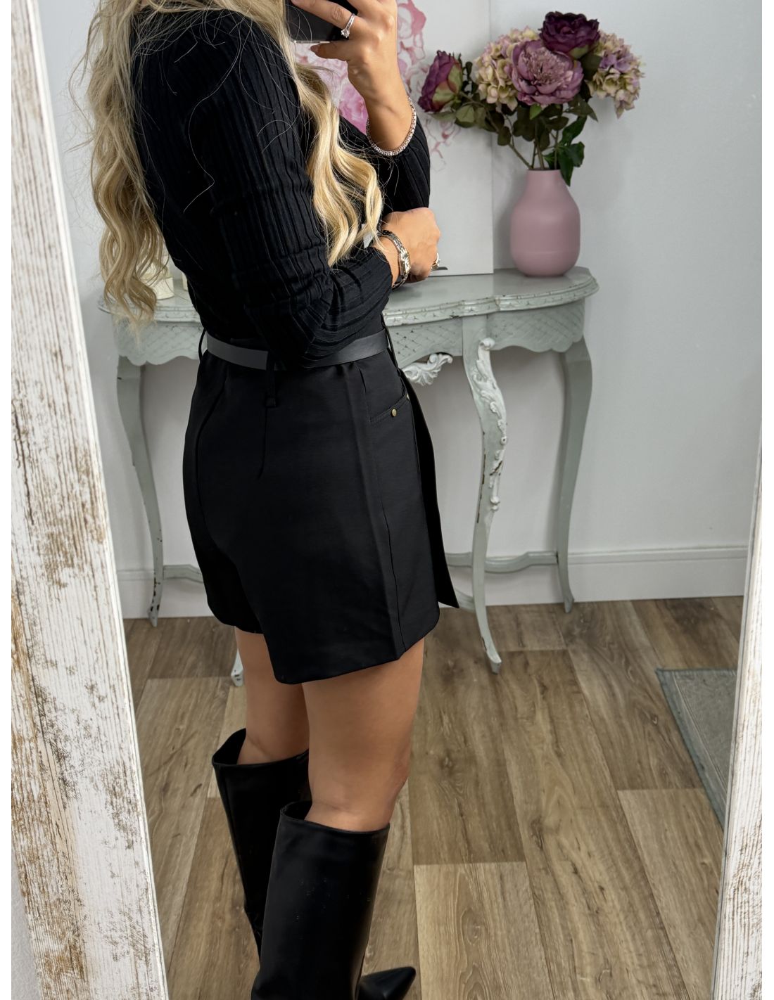 Falda pantalón que parece una falda por delante y un pantalón por detrás. Incluye el cinturón. Es de tiro alto.
