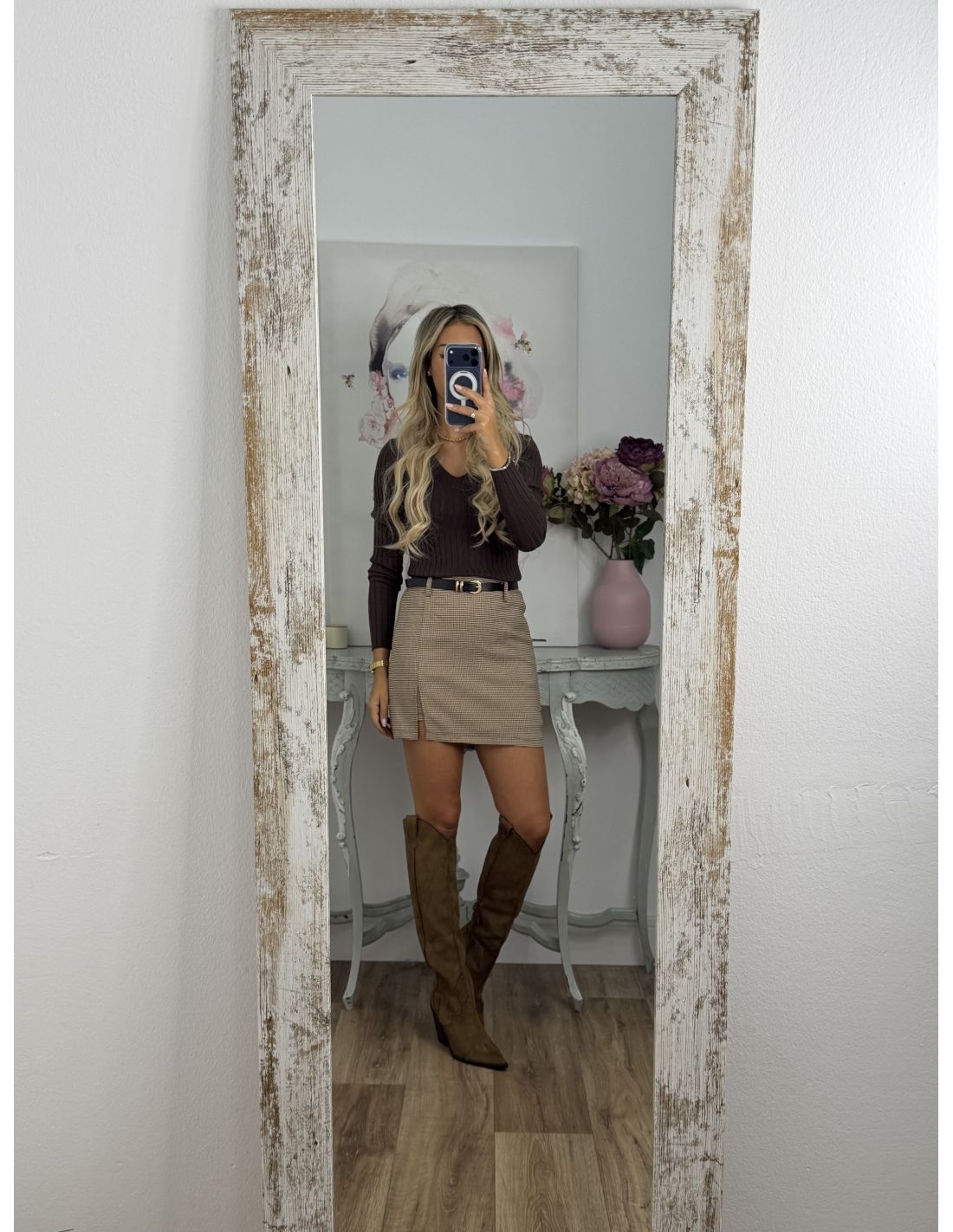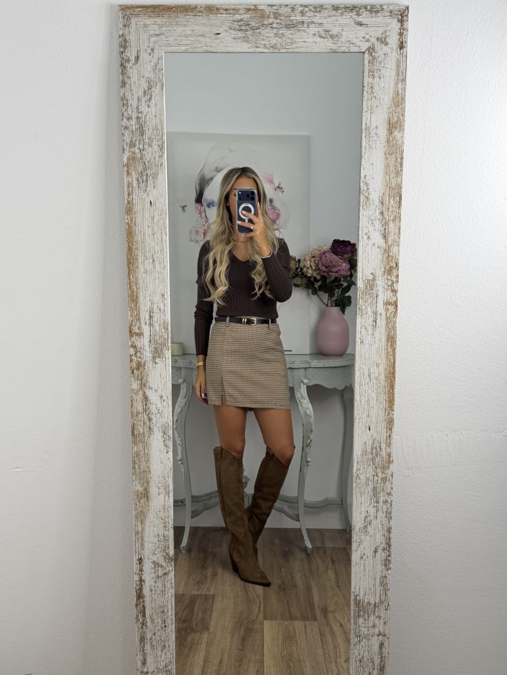 Falda pantalón pata gallo cinturón marrón