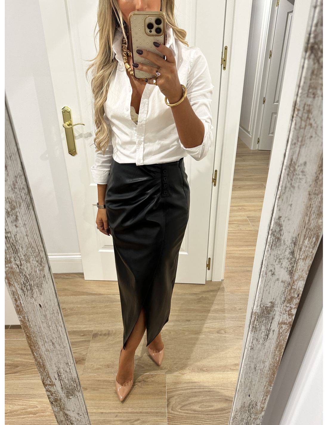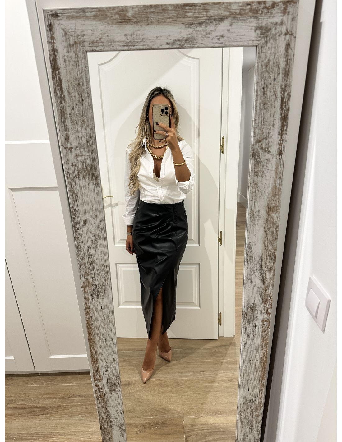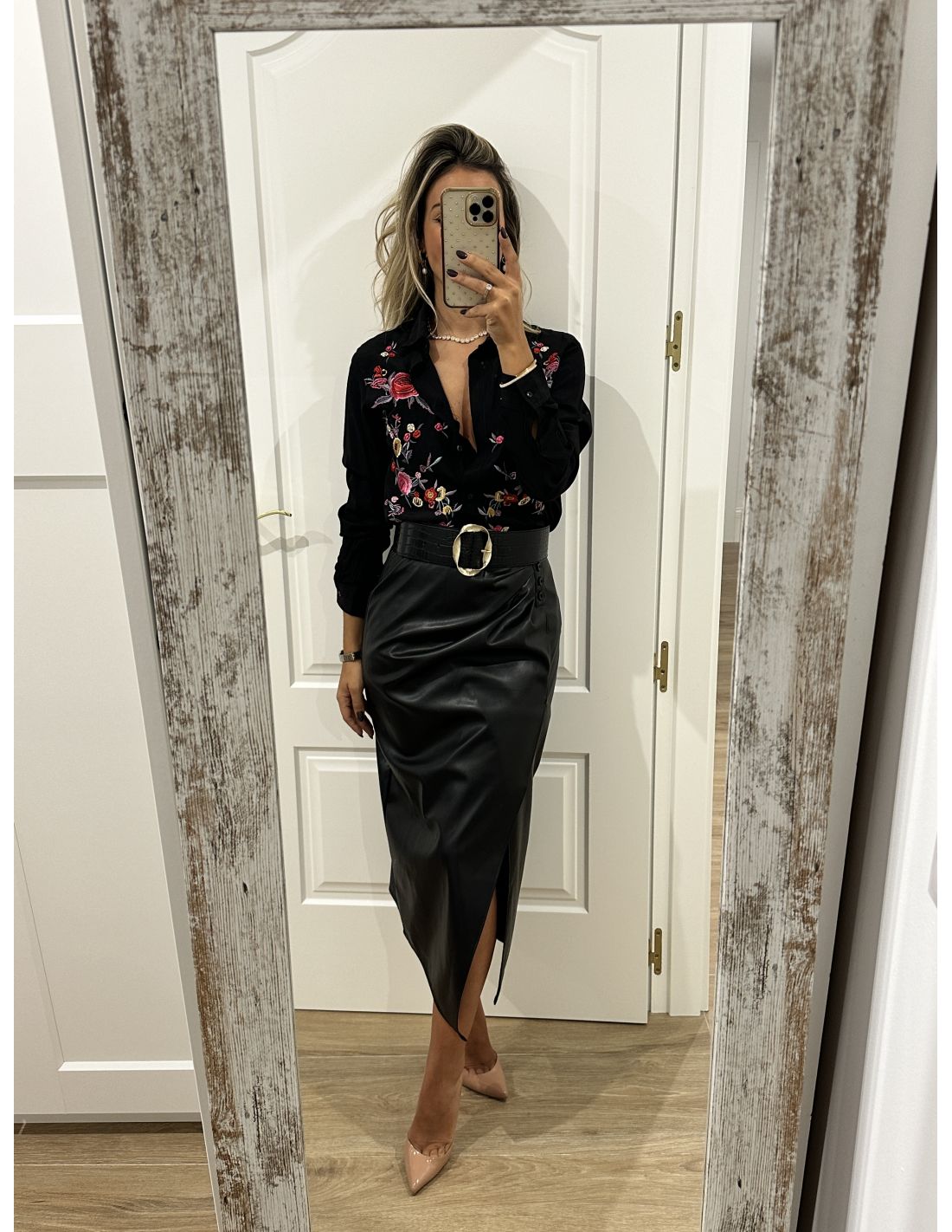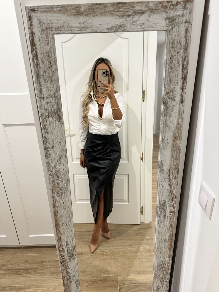 Falda de poli piel, que se cierra con cremallera invisible en el lateral y en la parte delantera lleva botones de adorno y en la zona de la barriga tiene unas pliegues que disimula. La parte de atrás lleva pinzas. Lleva forro. La falda no incluye el cinturón.