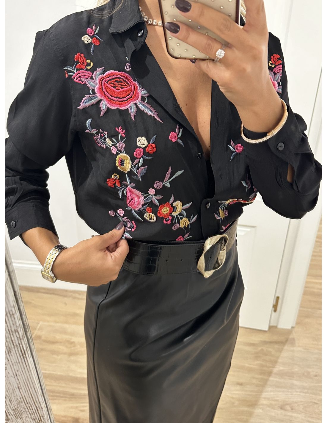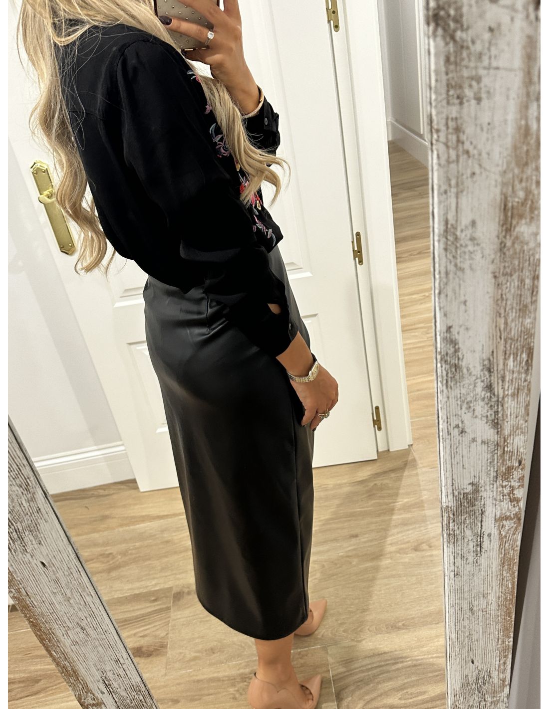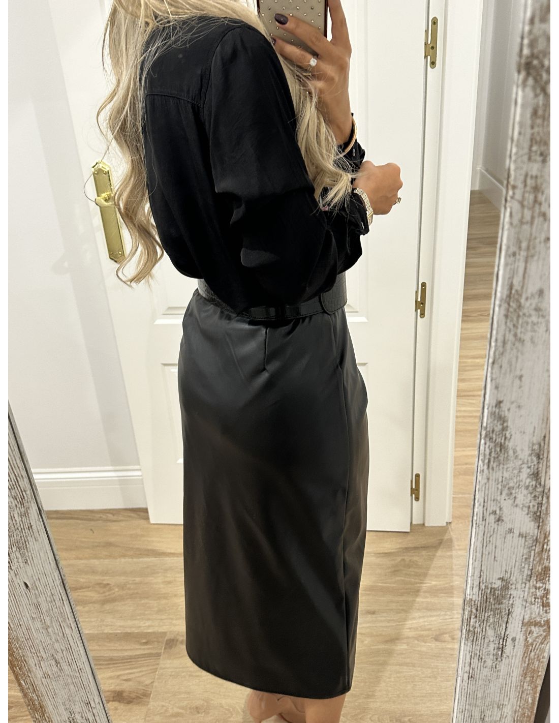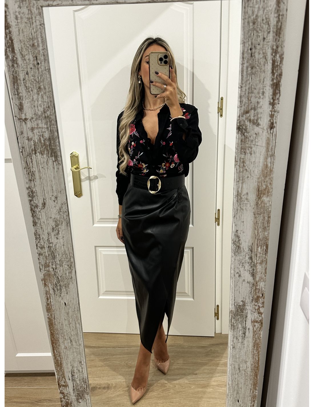 Falda de poli piel, que se cierra con cremallera invisible en el lateral y en la parte delantera lleva botones de adorno y en la zona de la barriga tiene unas pliegues que disimula. La parte de atrás lleva pinzas. Lleva forro. La falda no incluye el cinturón.