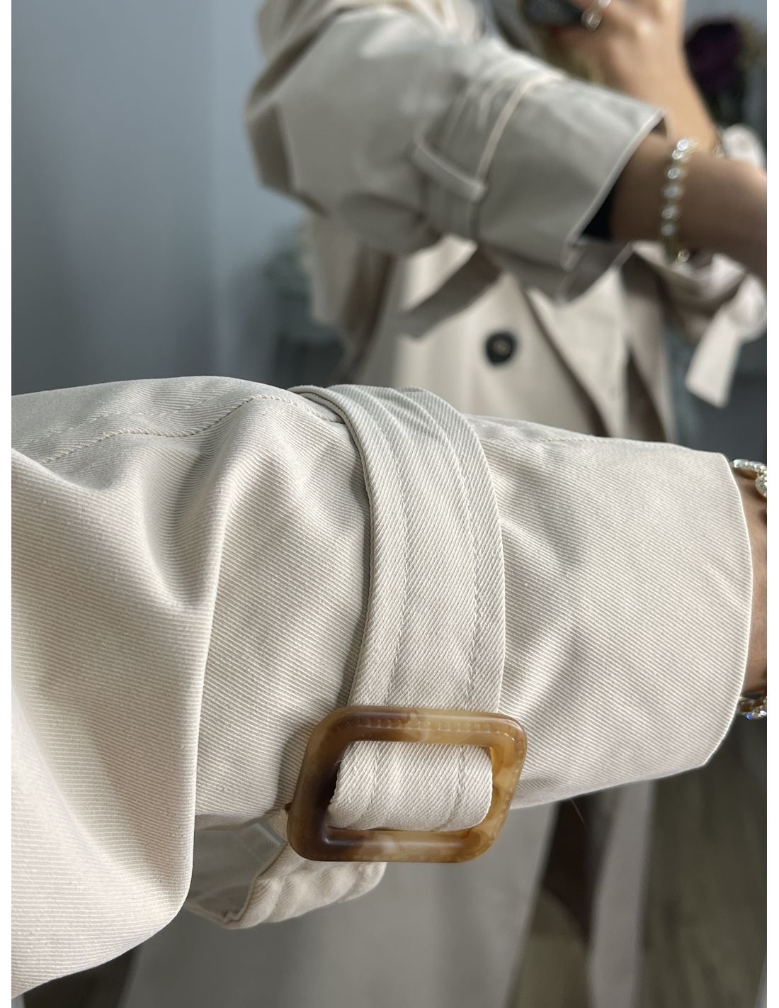 Gabardina beige de corte oversize y amplio. Lleva capucha de algodón en color gris que se puede quitar. Va forrado.