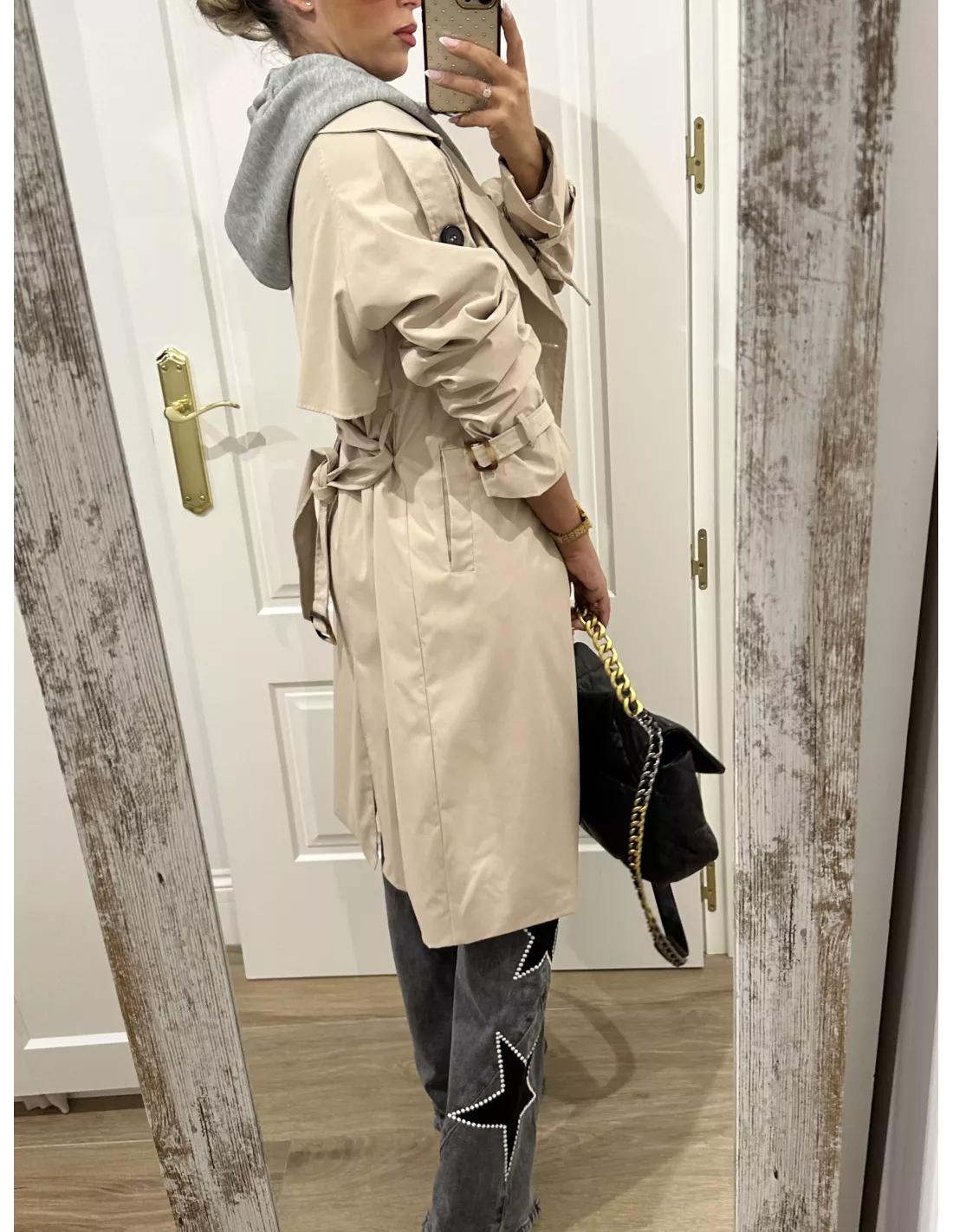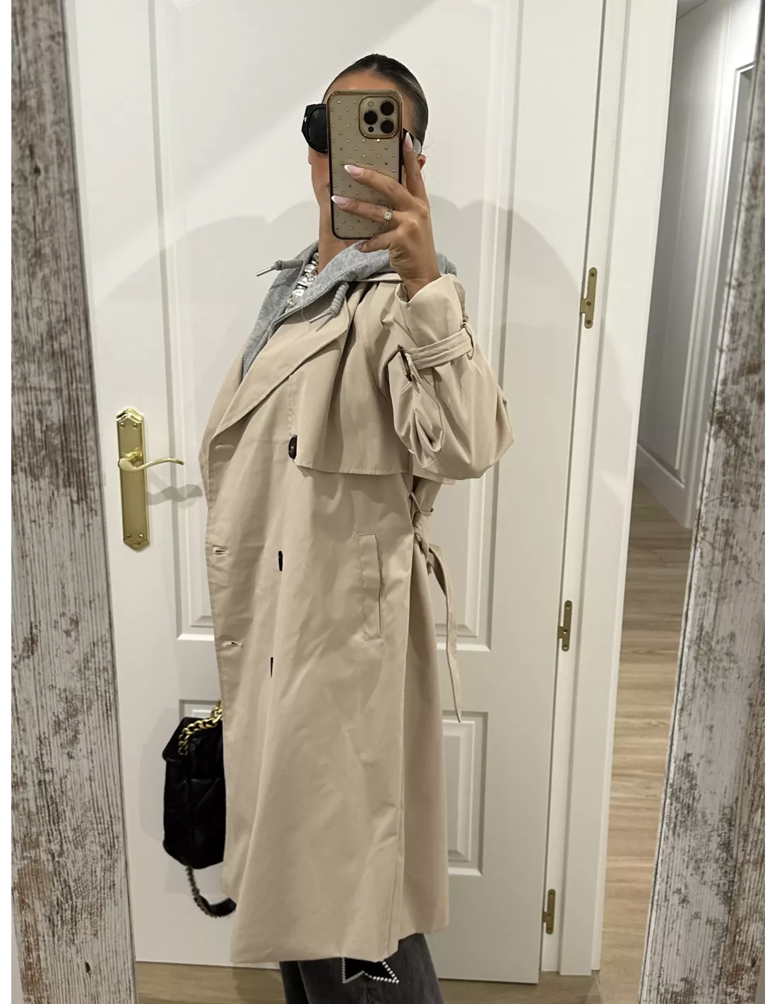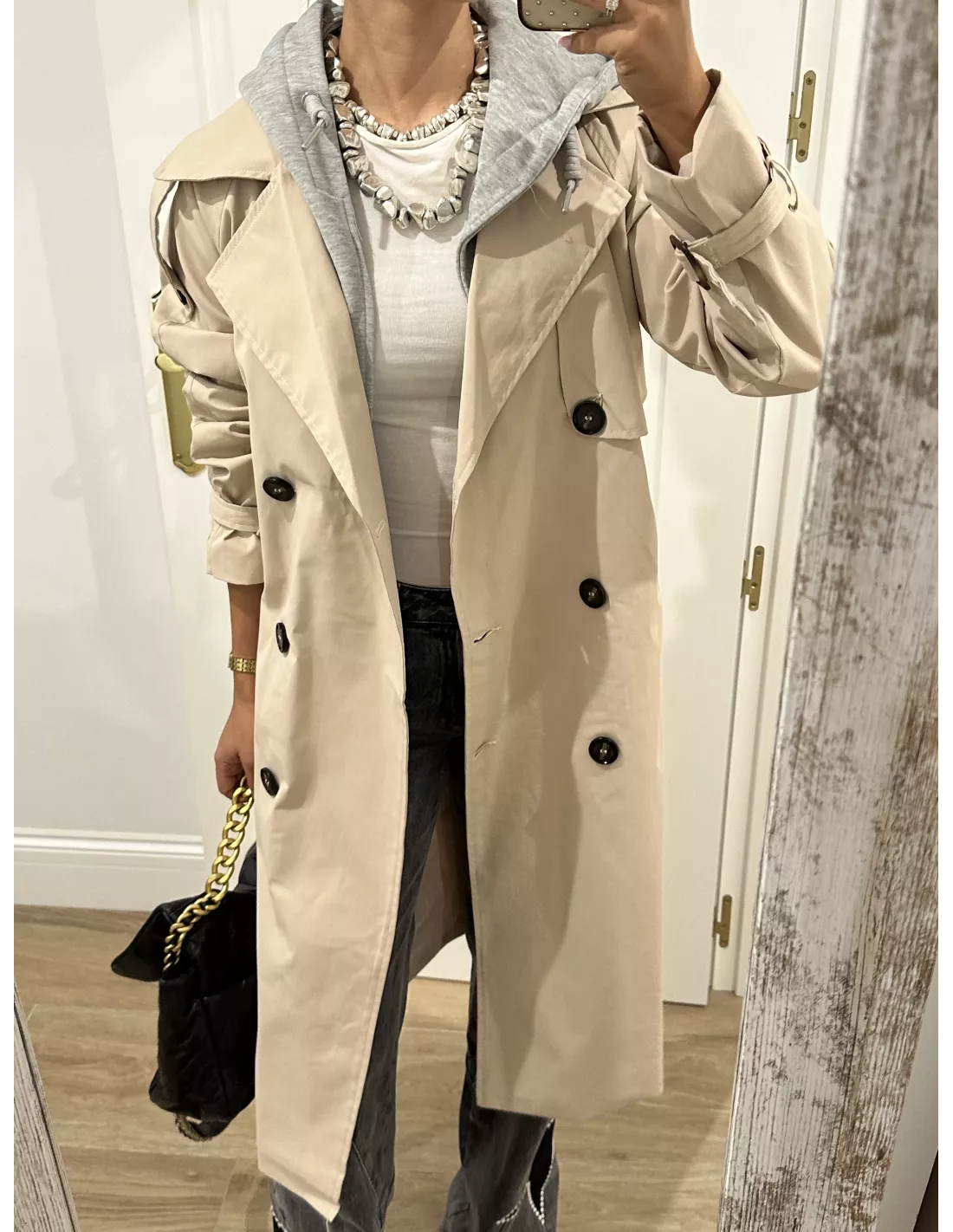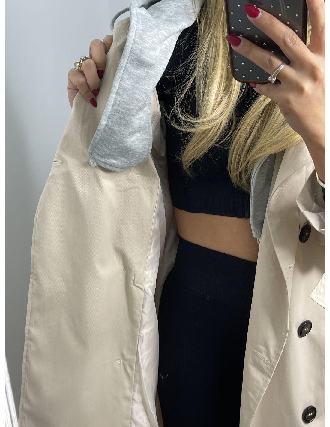 Gabardina beige con capucha gris