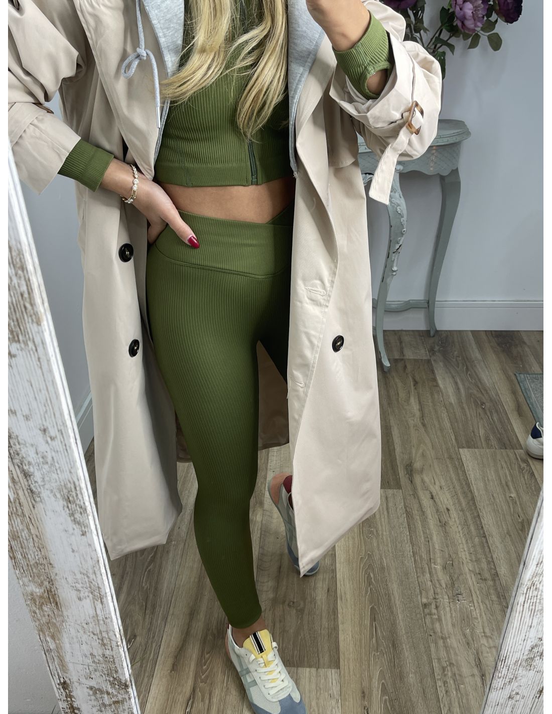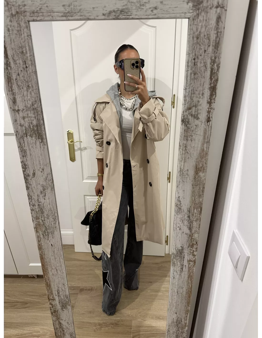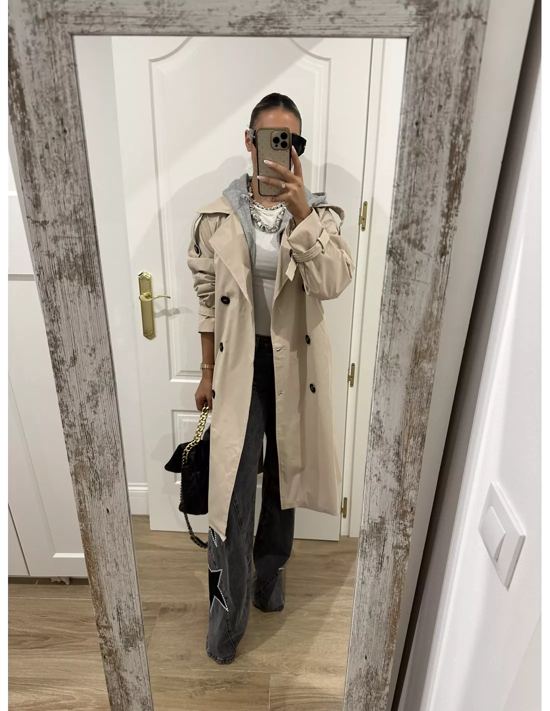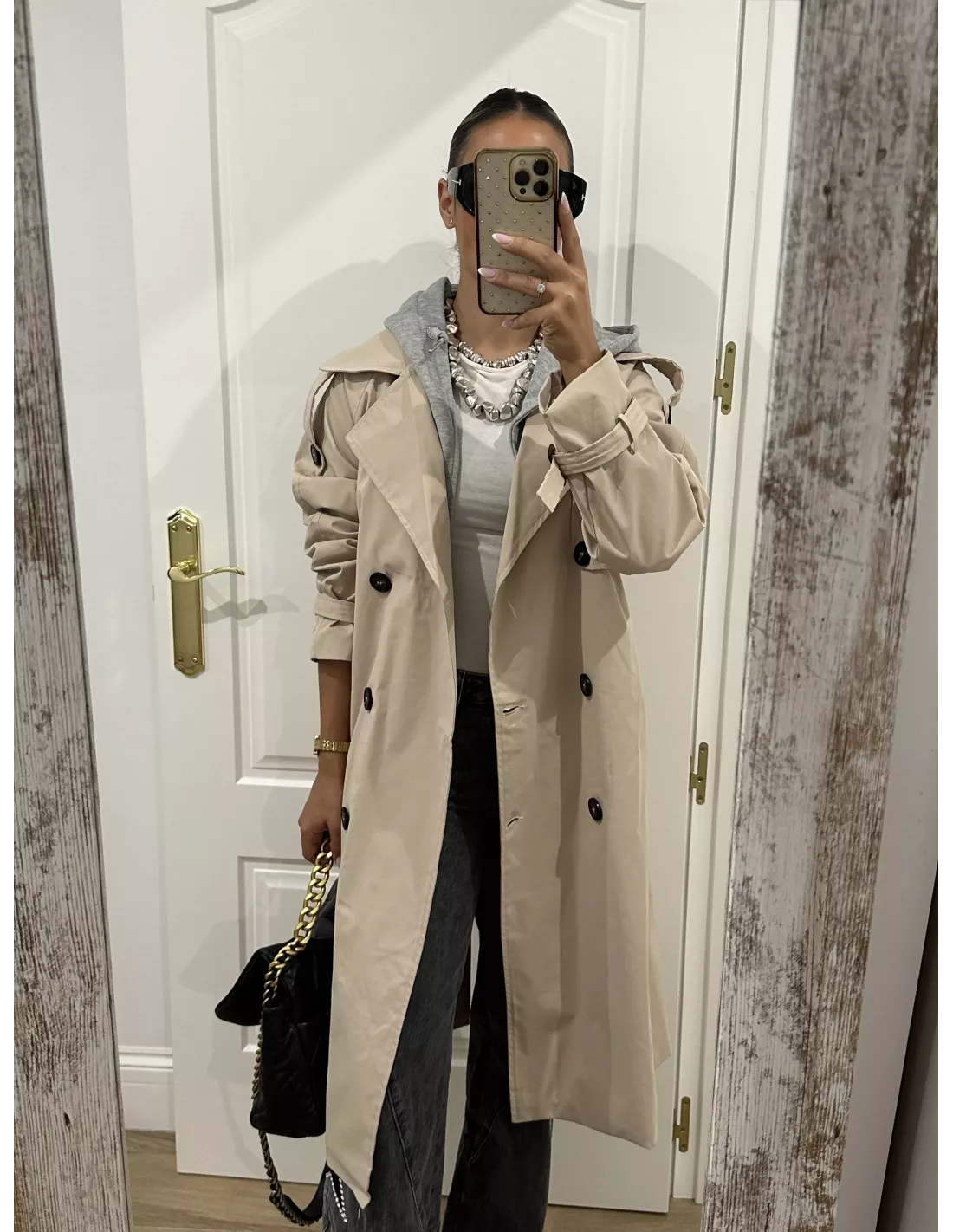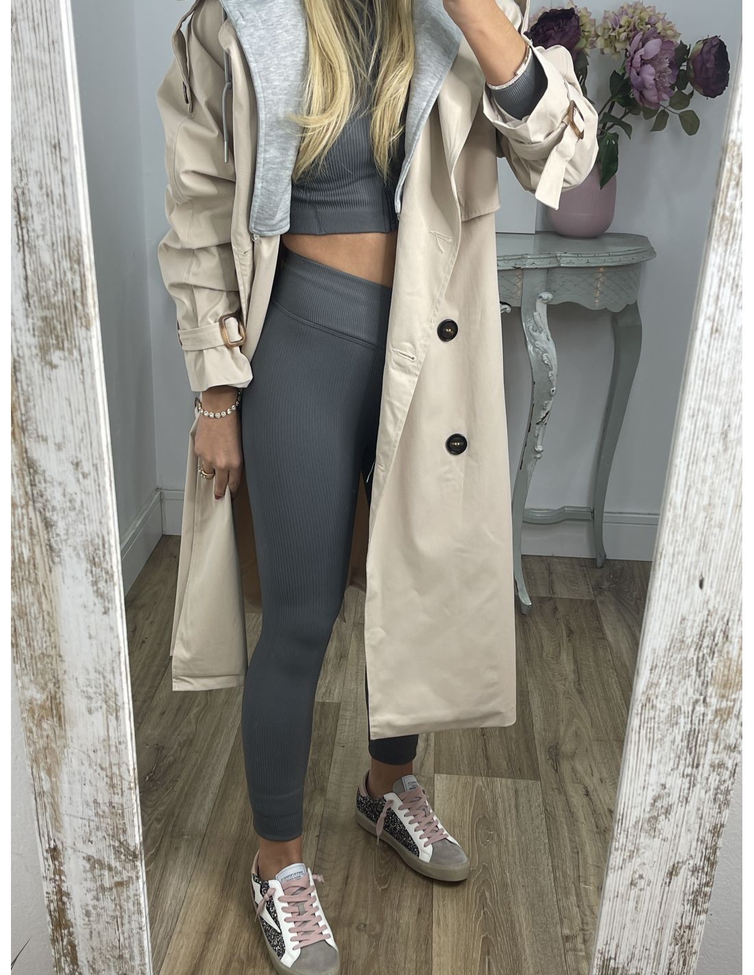 Gabardina beige con capucha gris
