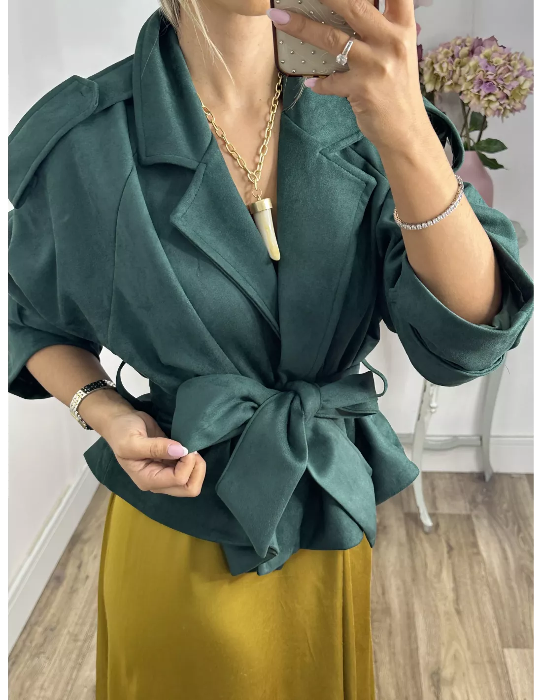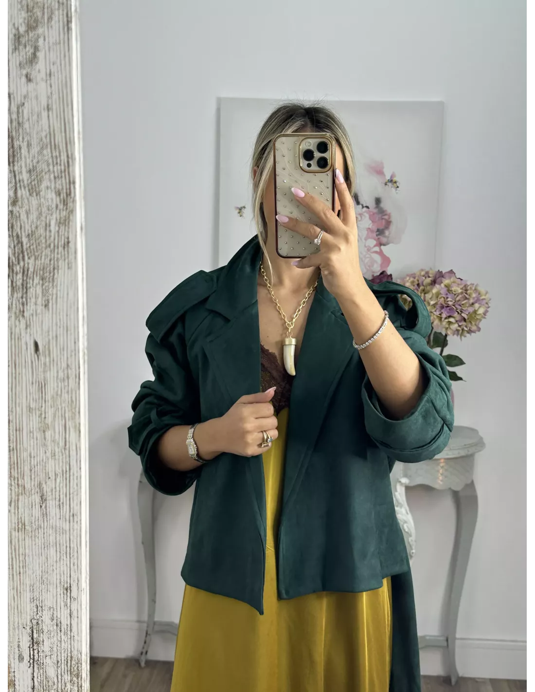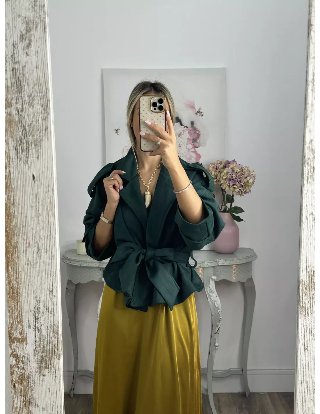 Gabardina de corte oversize corta. Va forrada y trae cinturón del mismo tejido.