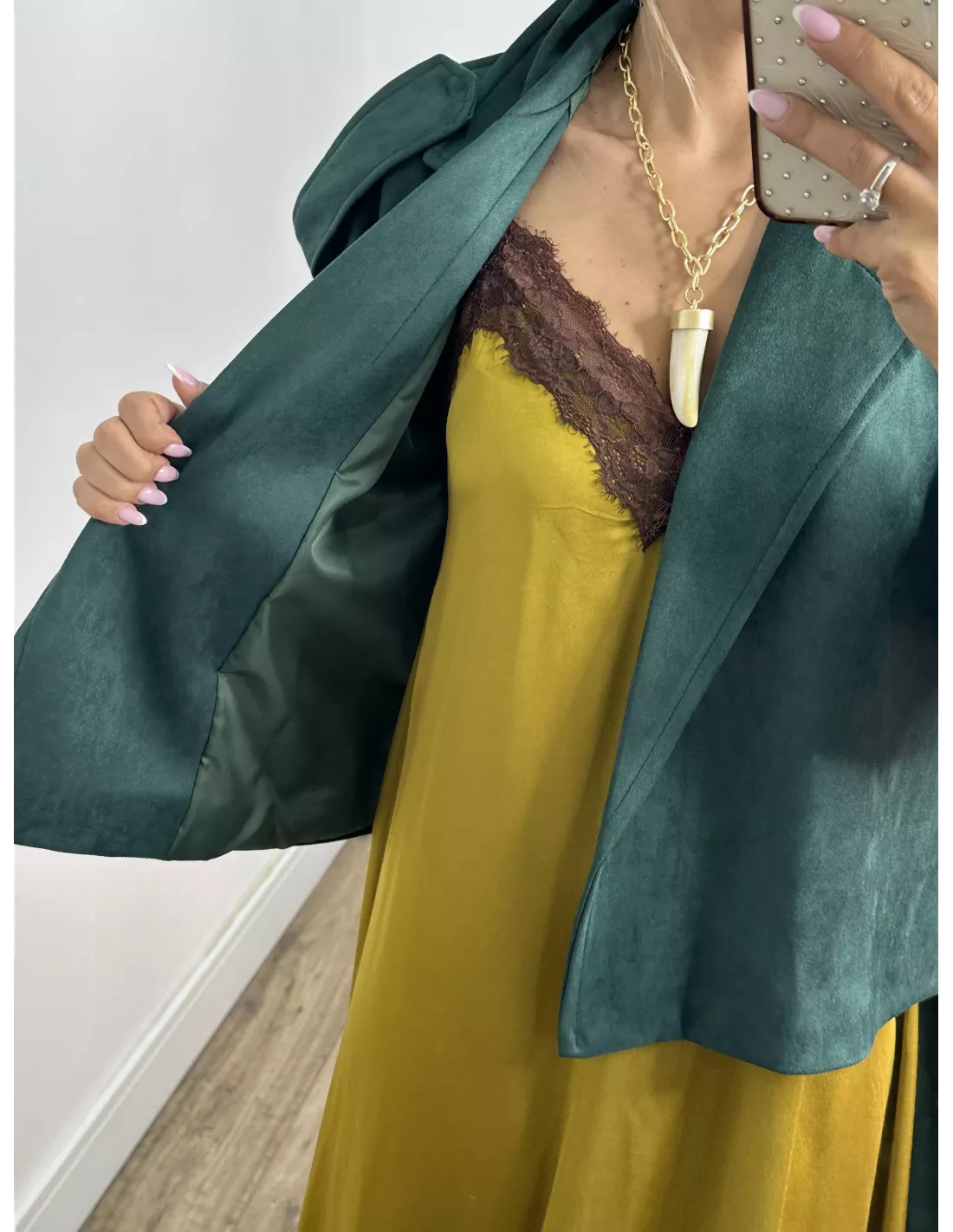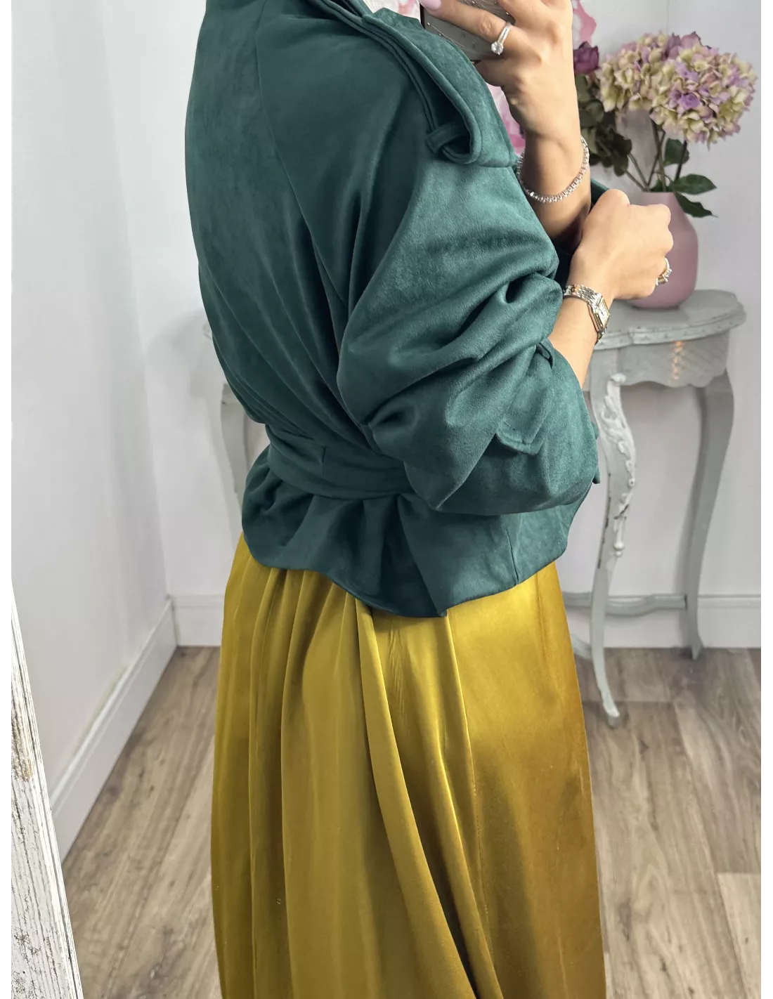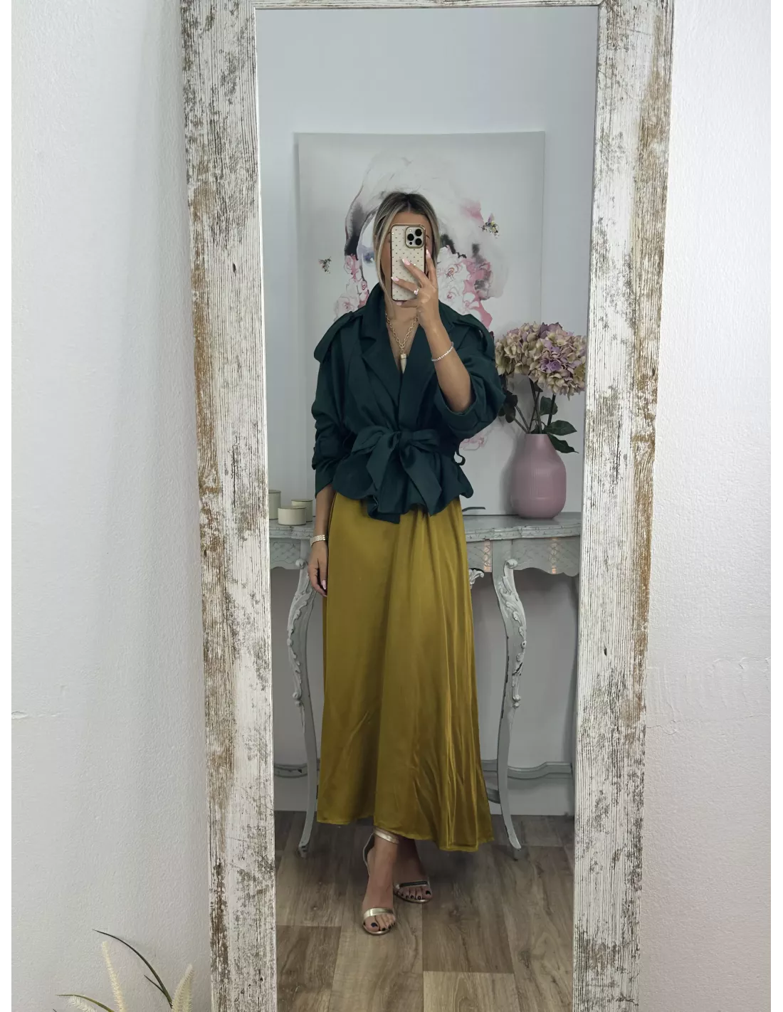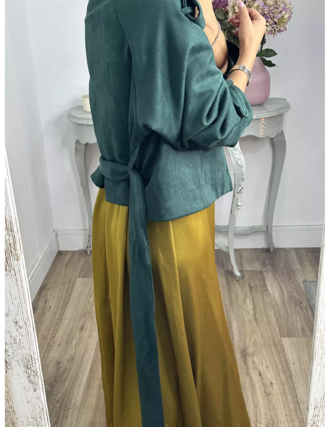 Gabardina de corte oversize corta. Va forrada y trae cinturón del mismo tejido.
