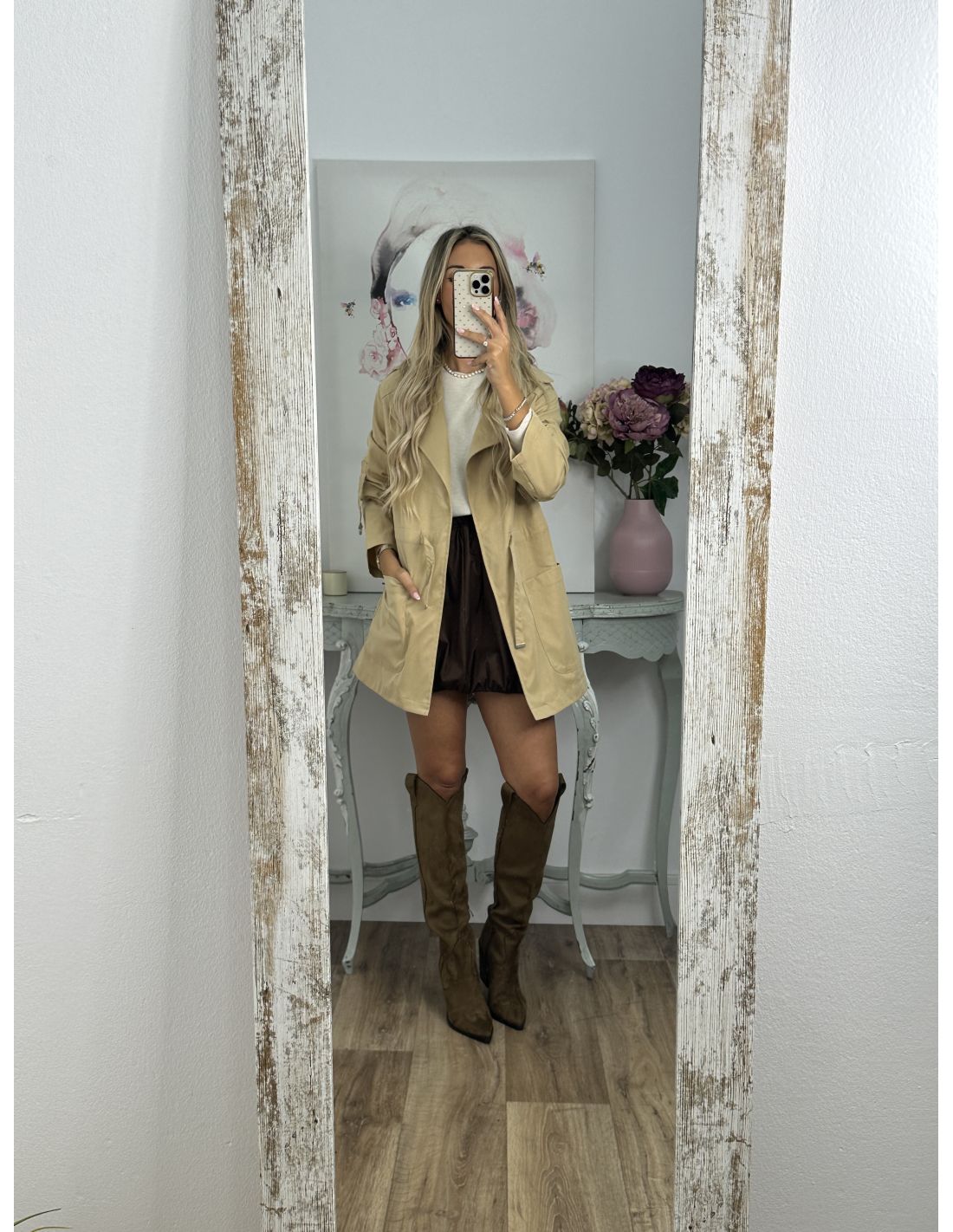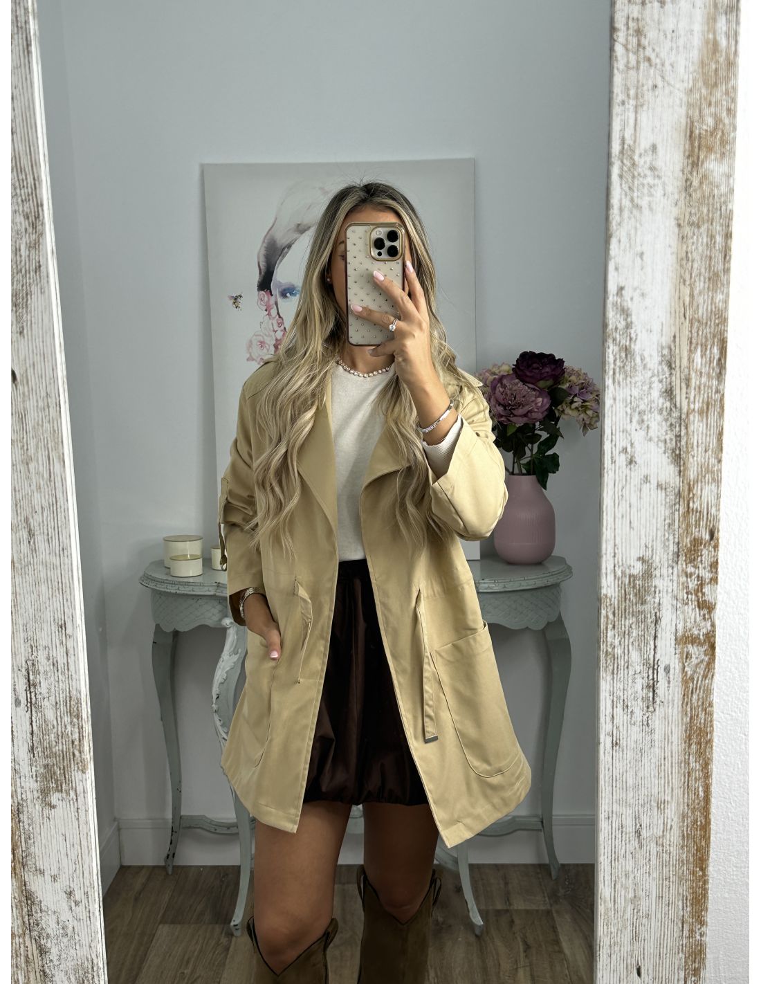 Gabardina flojita con lazada en la zona de la cintura. No va forrada.