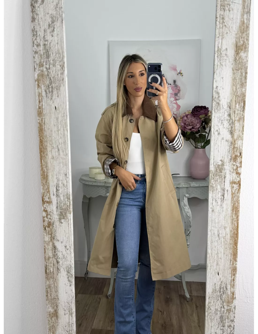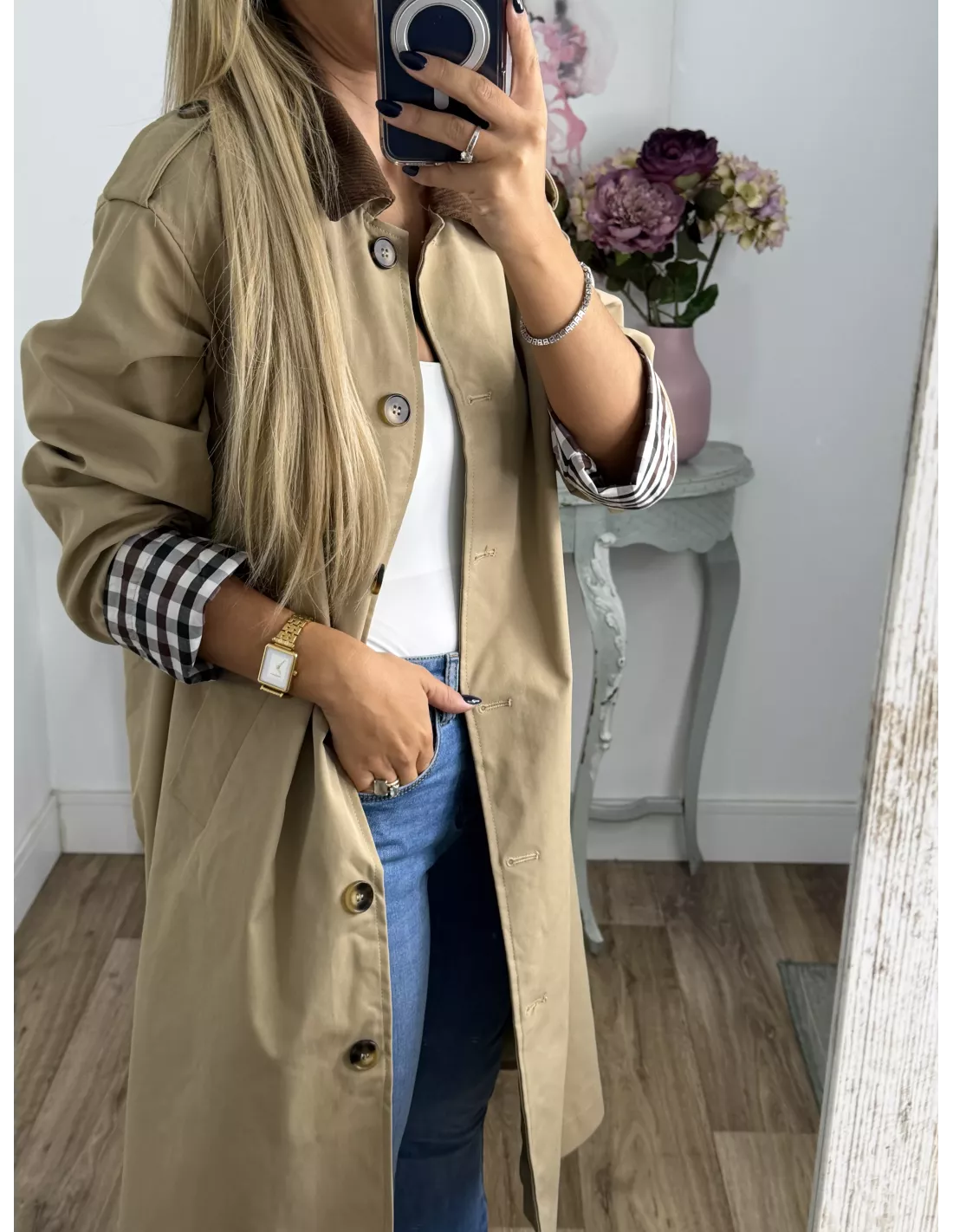 Chaqueta tipo Barbou con el cuello de pana y de corte recto. Se cierra con botones y tiene bolsillos cuadrados. Va forrada, y el forro del puño es de cuadros.