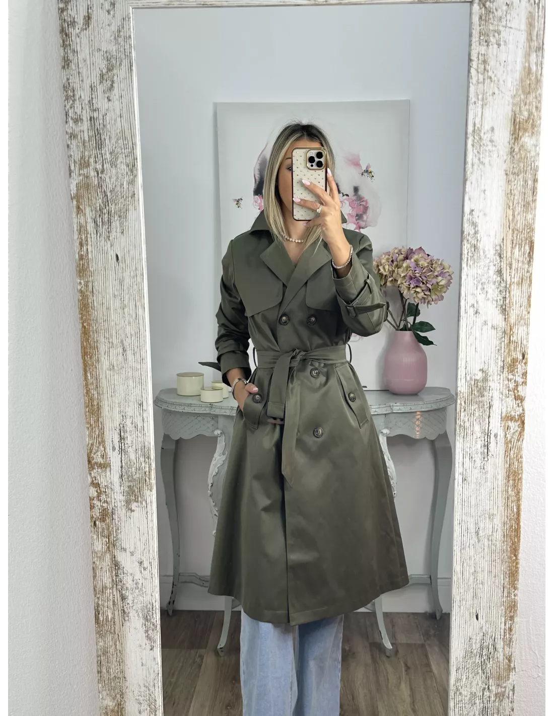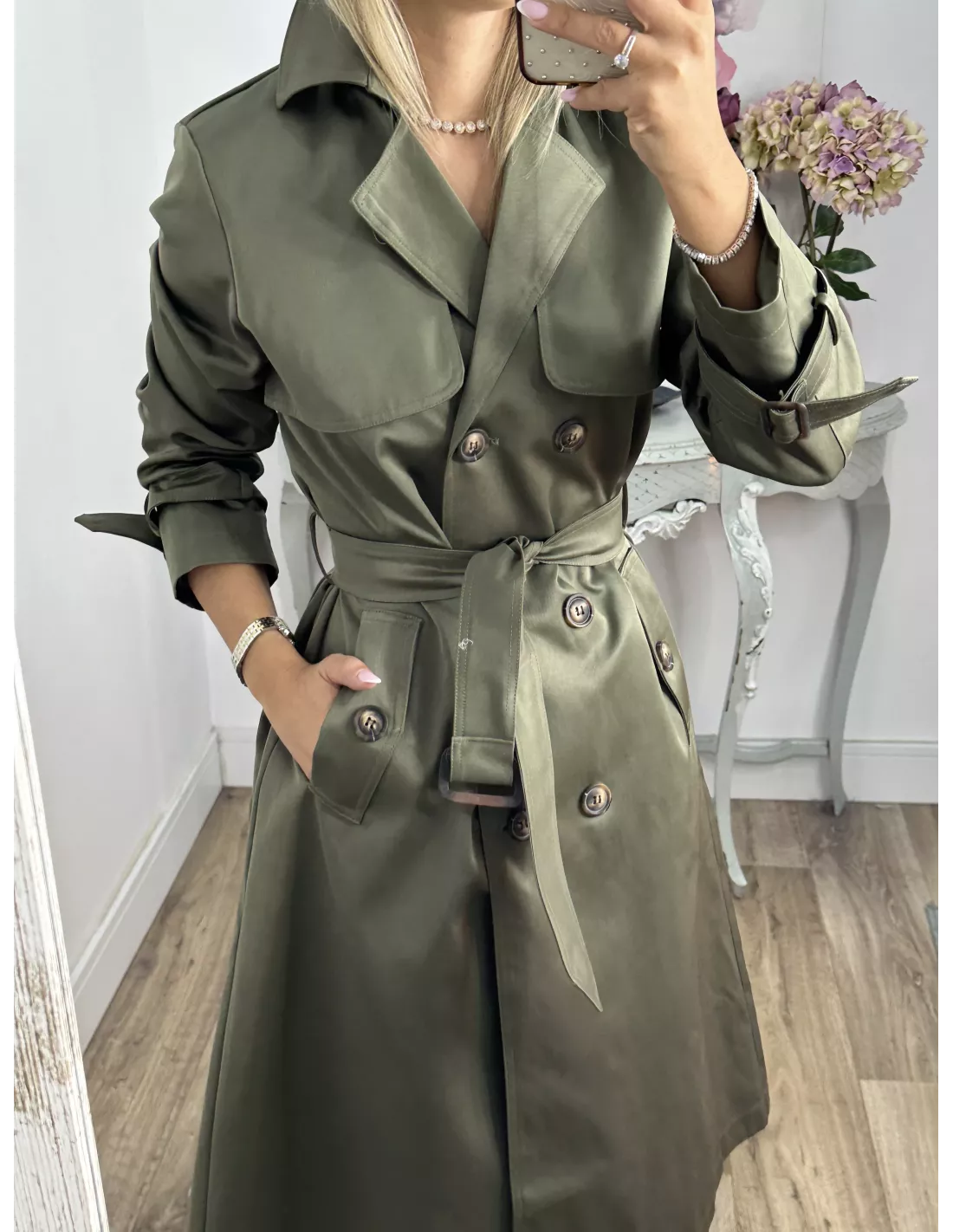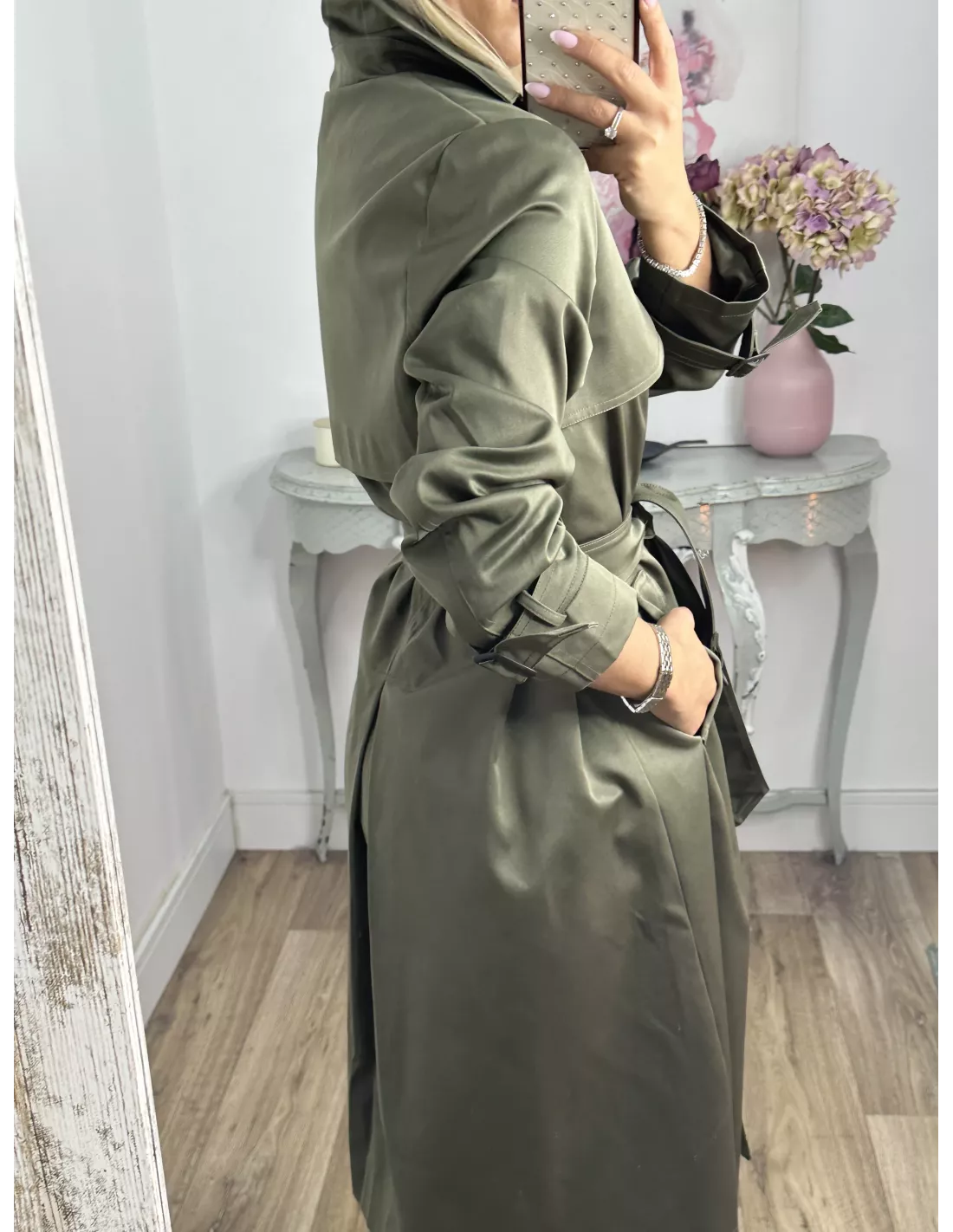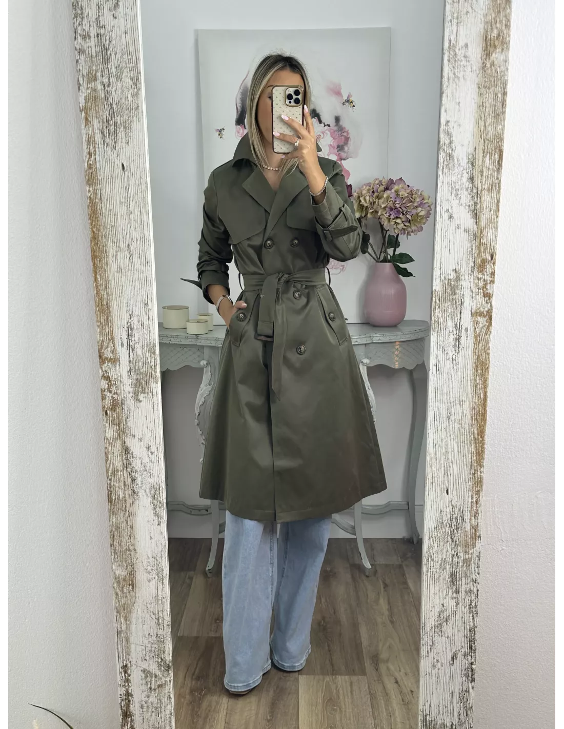 Gabardina verde, con cinturón. Va forrada, tapa el culete. Tiene un corte amplio.