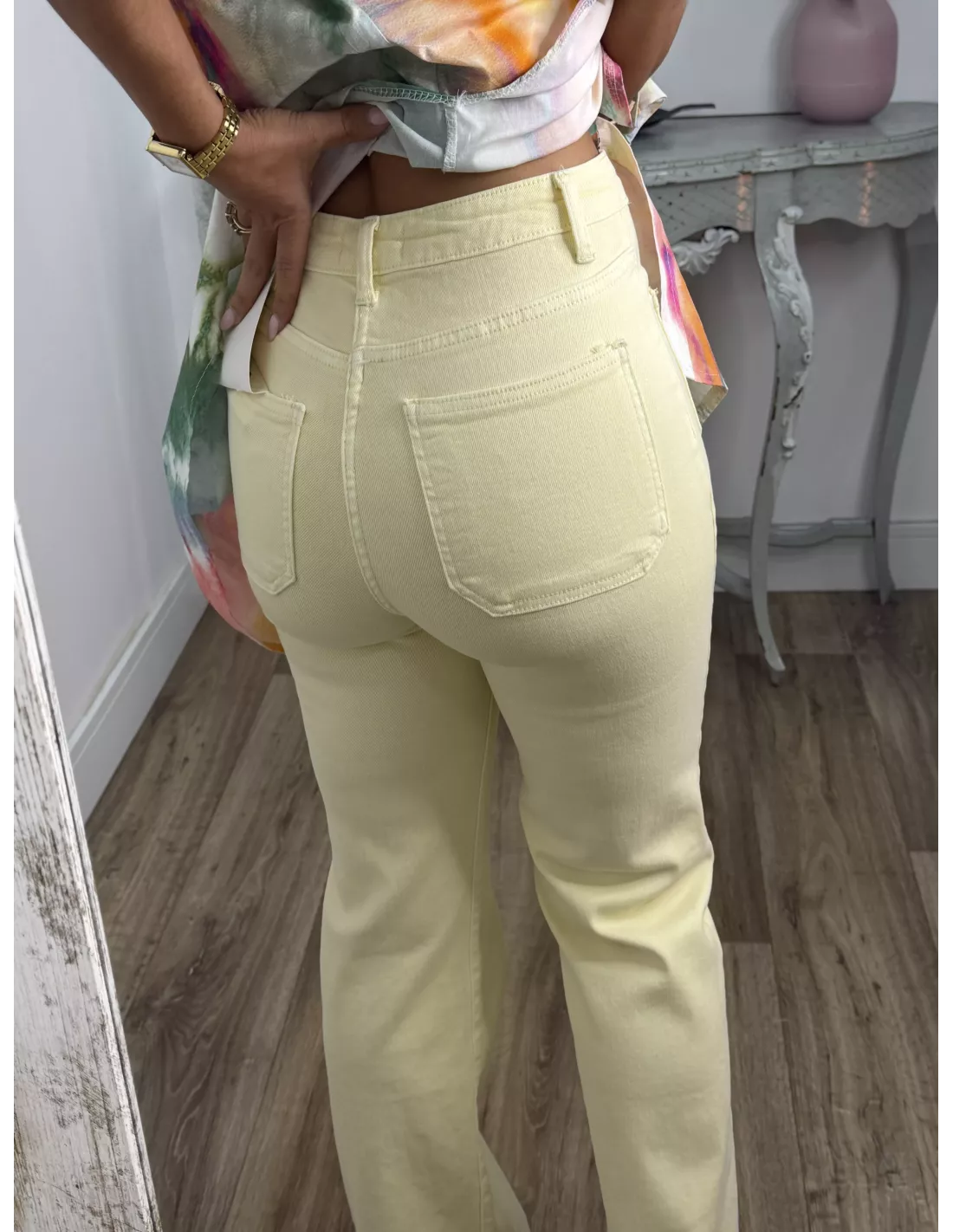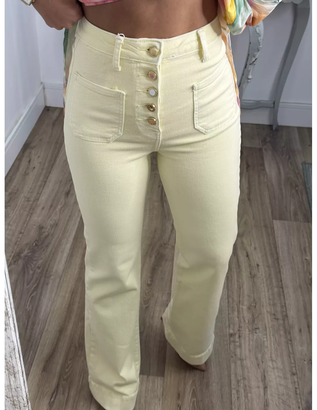 Jeans elástico de tiro alto. Es de corte recto, lleva bolsillos cuadrados en la parte delantera y los botones son dorados cada uno de ellos distintos. Se recomienda la talla habitual si te gusta ajustados puedes coger una talla menos de la habitual. Si estás entre dos tallas coger la más pequeña. Las chicas altas mirar la medida del largo.