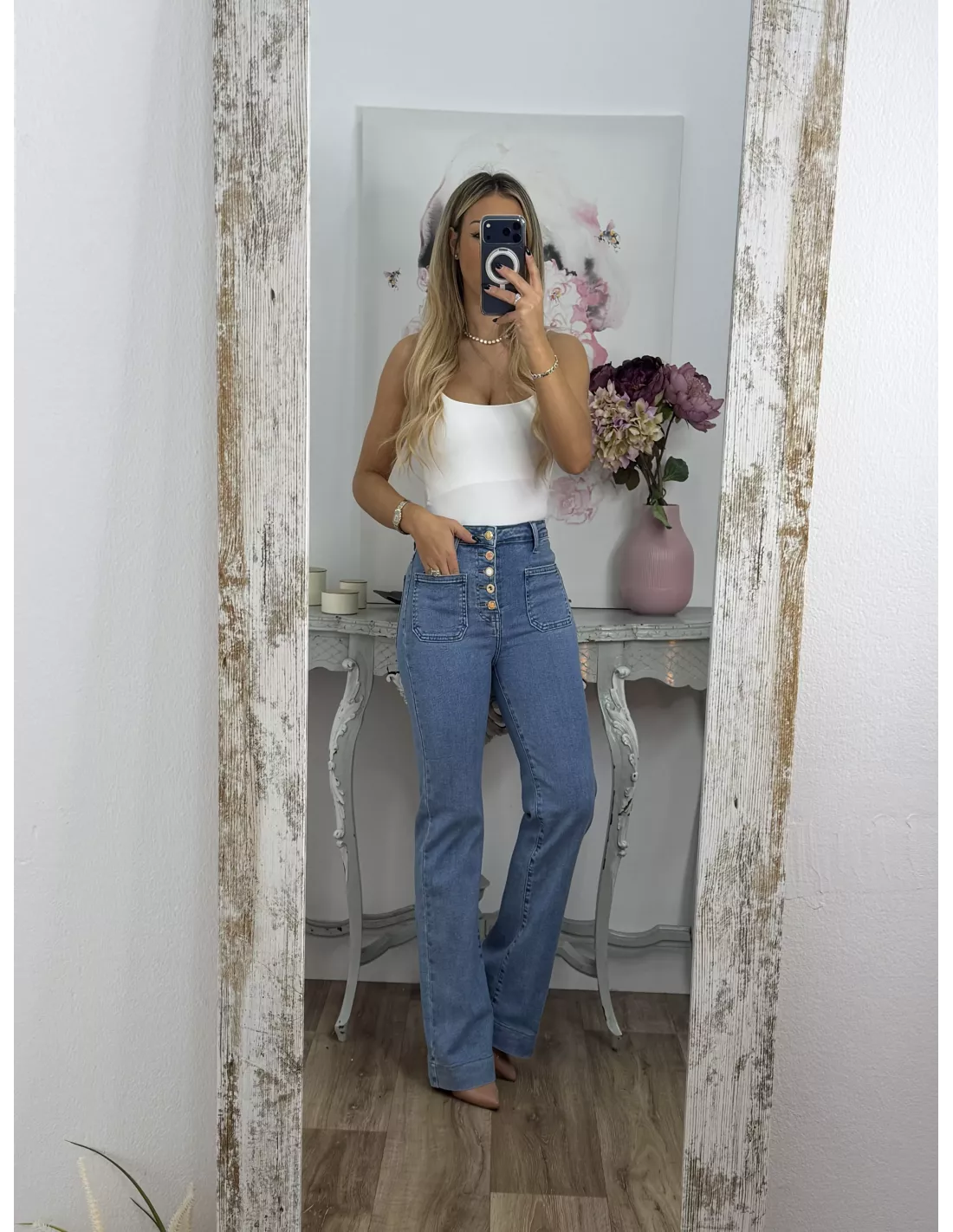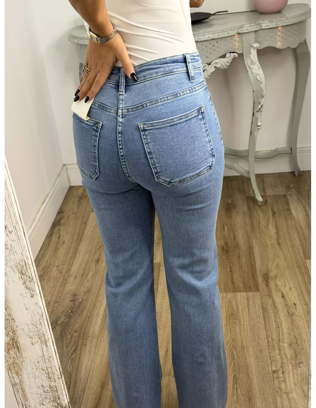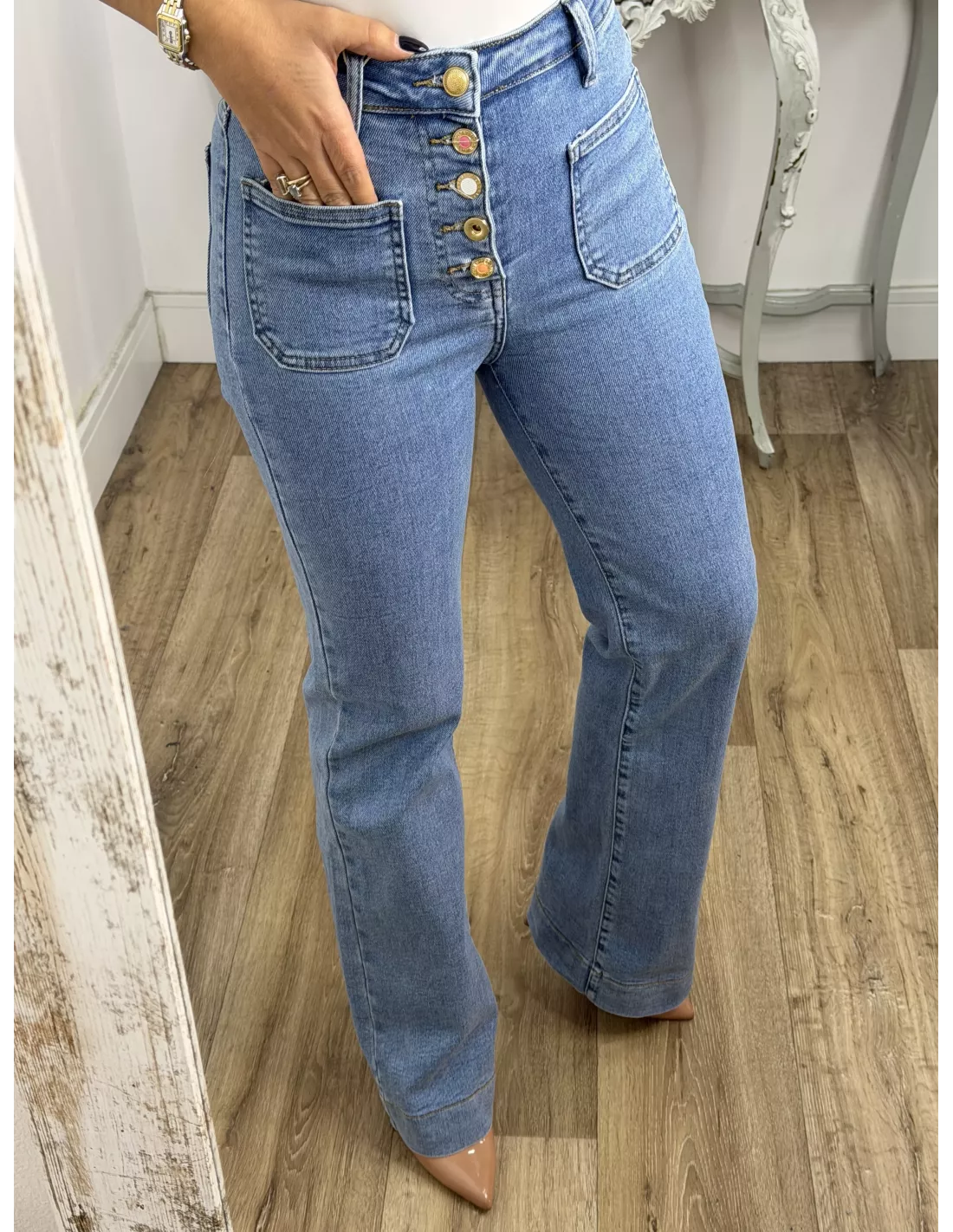 Jeans elástico de tiro alto. Es de corte recto, lleva bolsillos cuadrados en la parte delantera y los botones son dorados cada uno de ellos distintos. Se recomienda la talla habitual si te gusta ajustados puedes coger una talla menos de la habitual. Si estás entre dos tallas coger la más pequeña. Las chicas altas mirar la medida del largo.