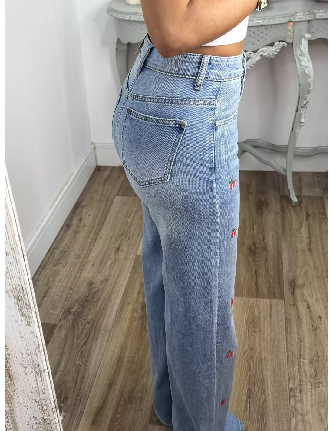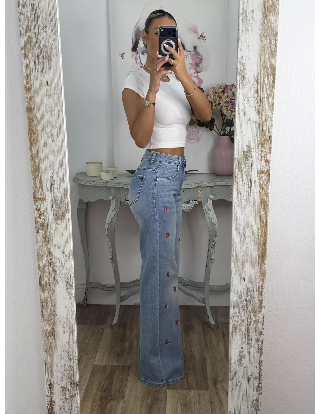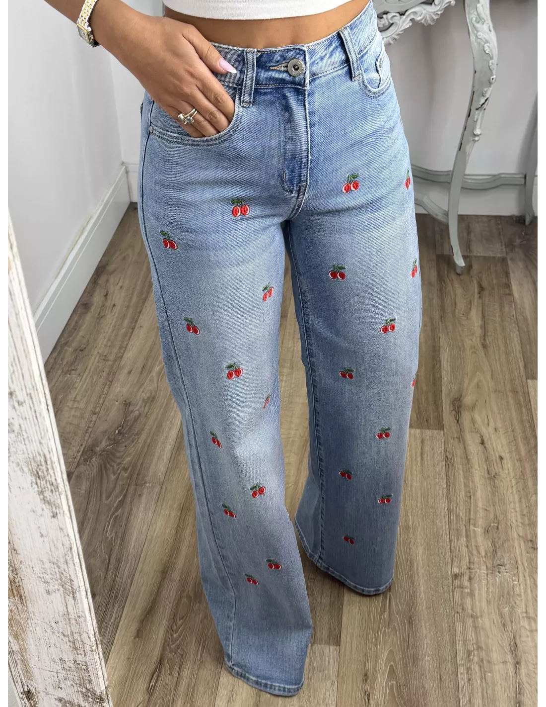Jeans de corte recto y ancho, lleva el dibujo de cerezas bordadas en la parte delantera.Recomendamos la talla habitual, si estás entre dos tallas coger la talla mayor.