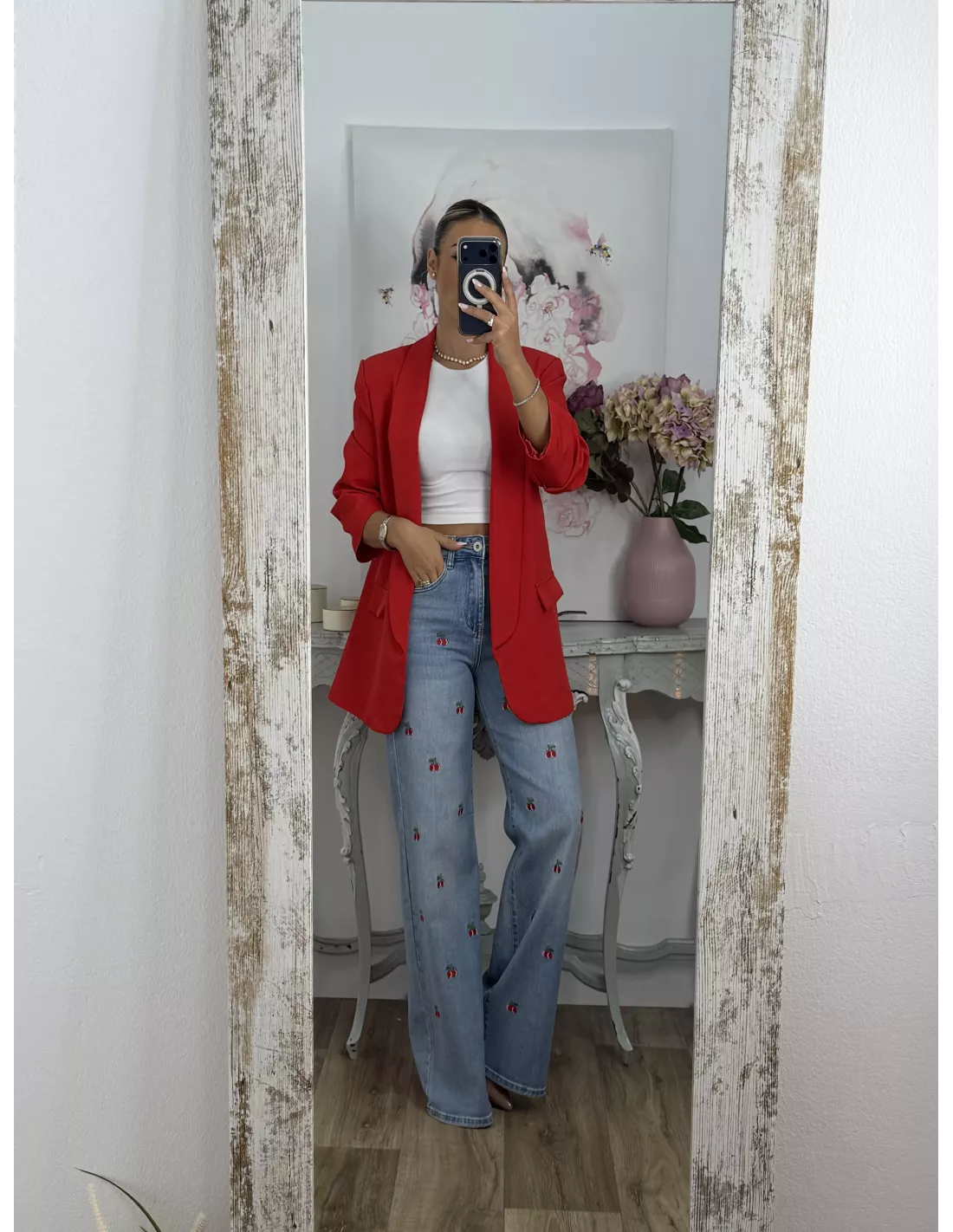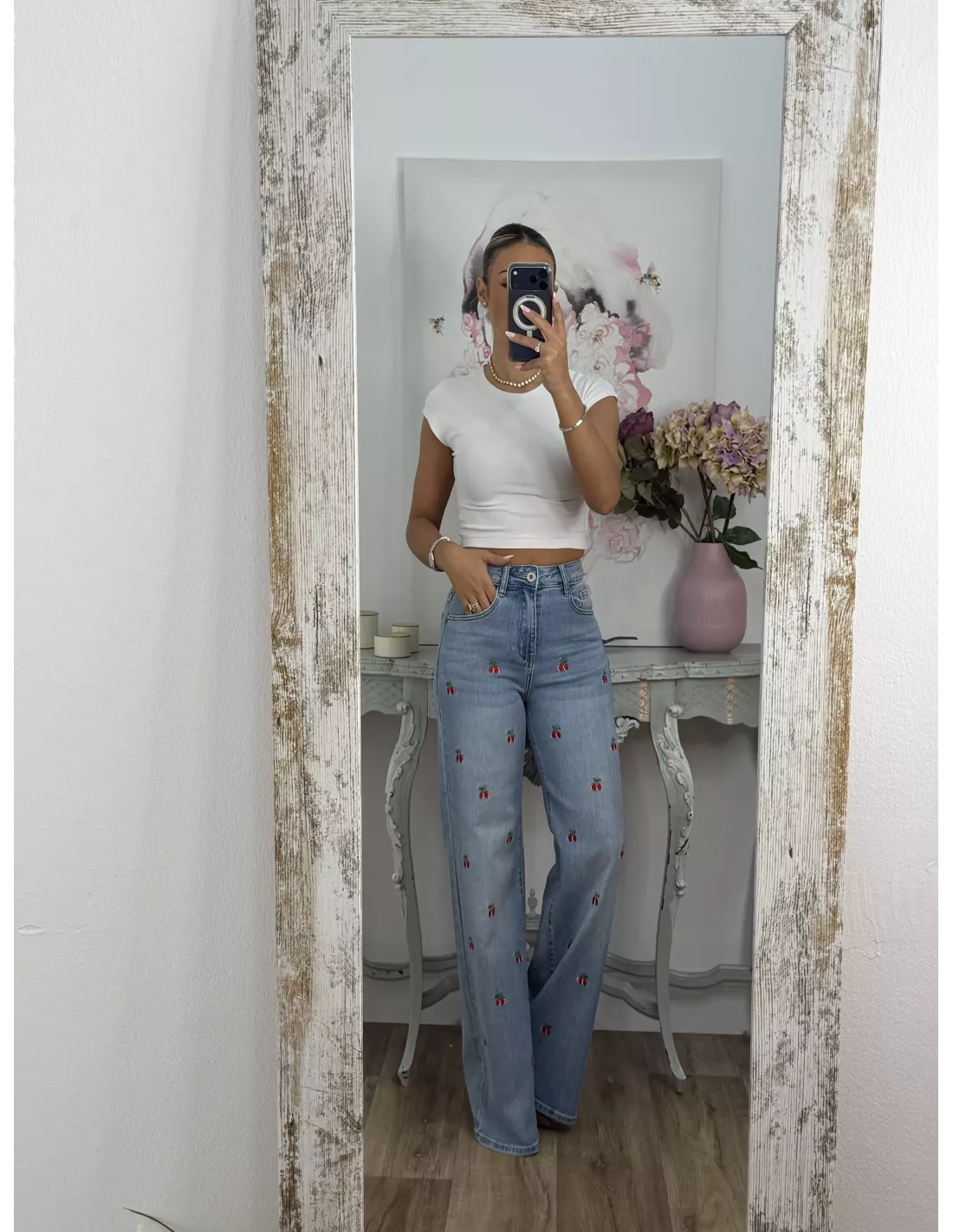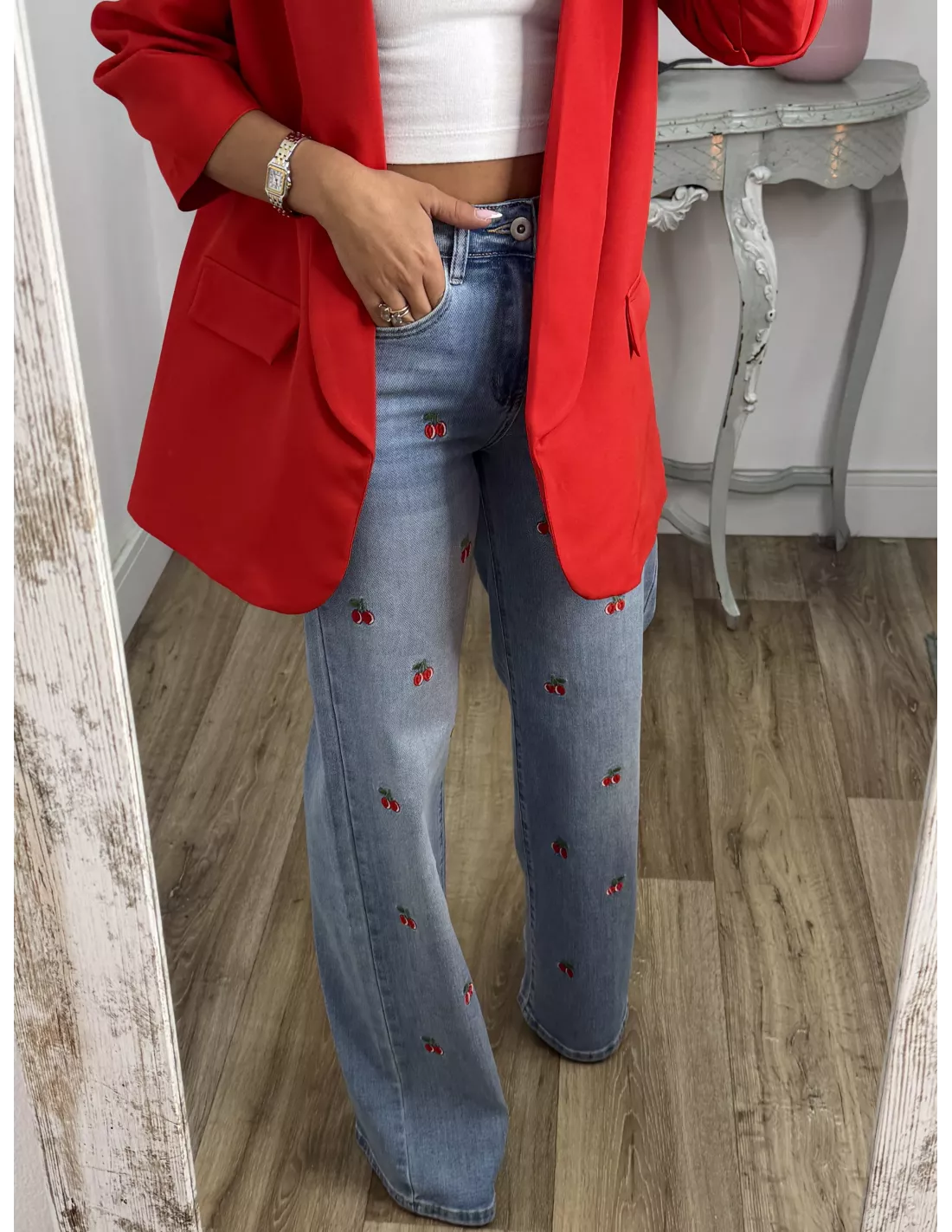 Jeans de corte recto y ancho, lleva el dibujo de cerezas bordadas en la parte delantera.Recomendamos la talla habitual, si estás entre dos tallas coger la talla mayor.