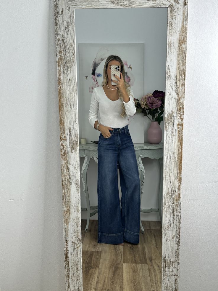 Jeans de tiro medio alto y elástico. El corte es ajustado en la zona del culete y luego suelto. Recomendamos la talla habitual, si estás entre dos tallas, coger la talla mayor.