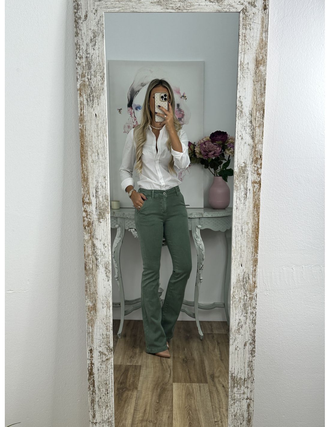 Jeans de corte tipo chino. Tiro medio, por debajo del ombligo. Son elásticos. Recomendamos si estás entre dos tallas coger la más pequeña y sino una menos de la habitual.