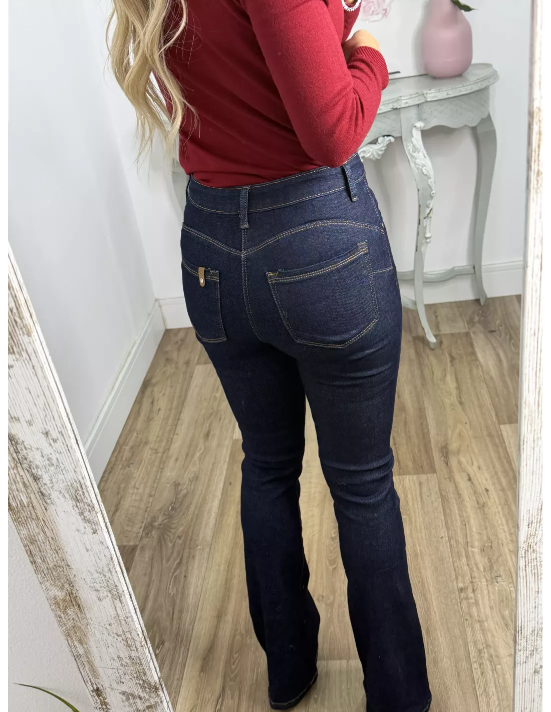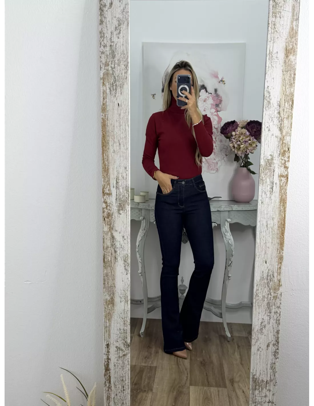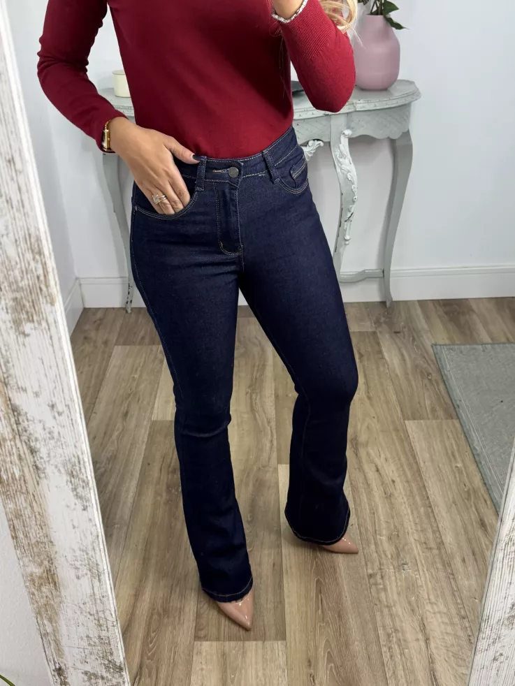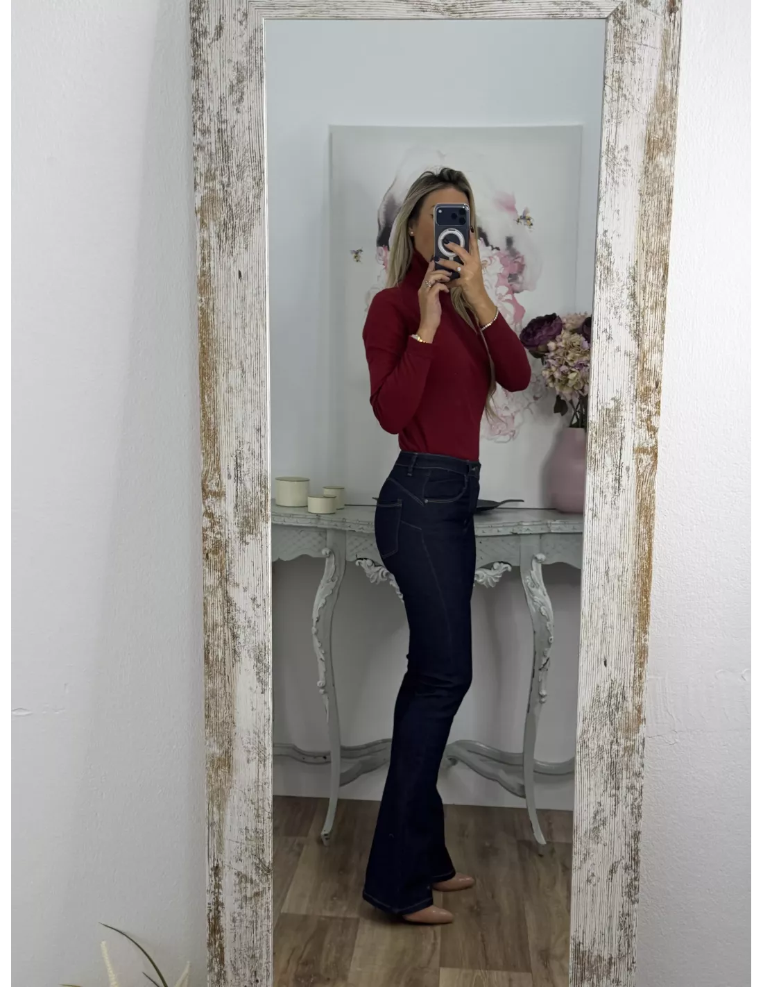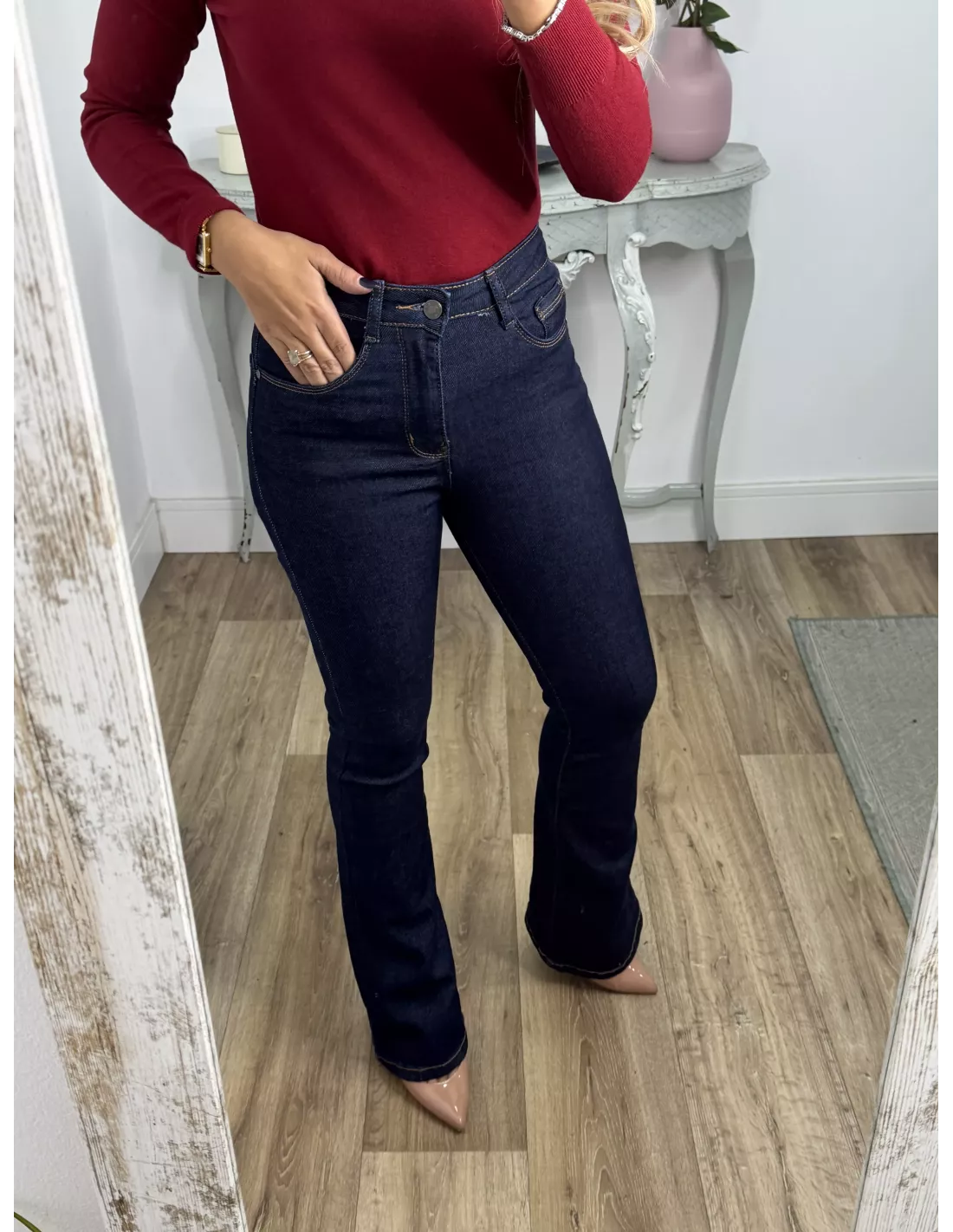 Jeans vaquero de campana. Talla normal recomendamos la talla habitual. Tiro medio alto, llegan por el ombligo más o menos. Son elásticos.