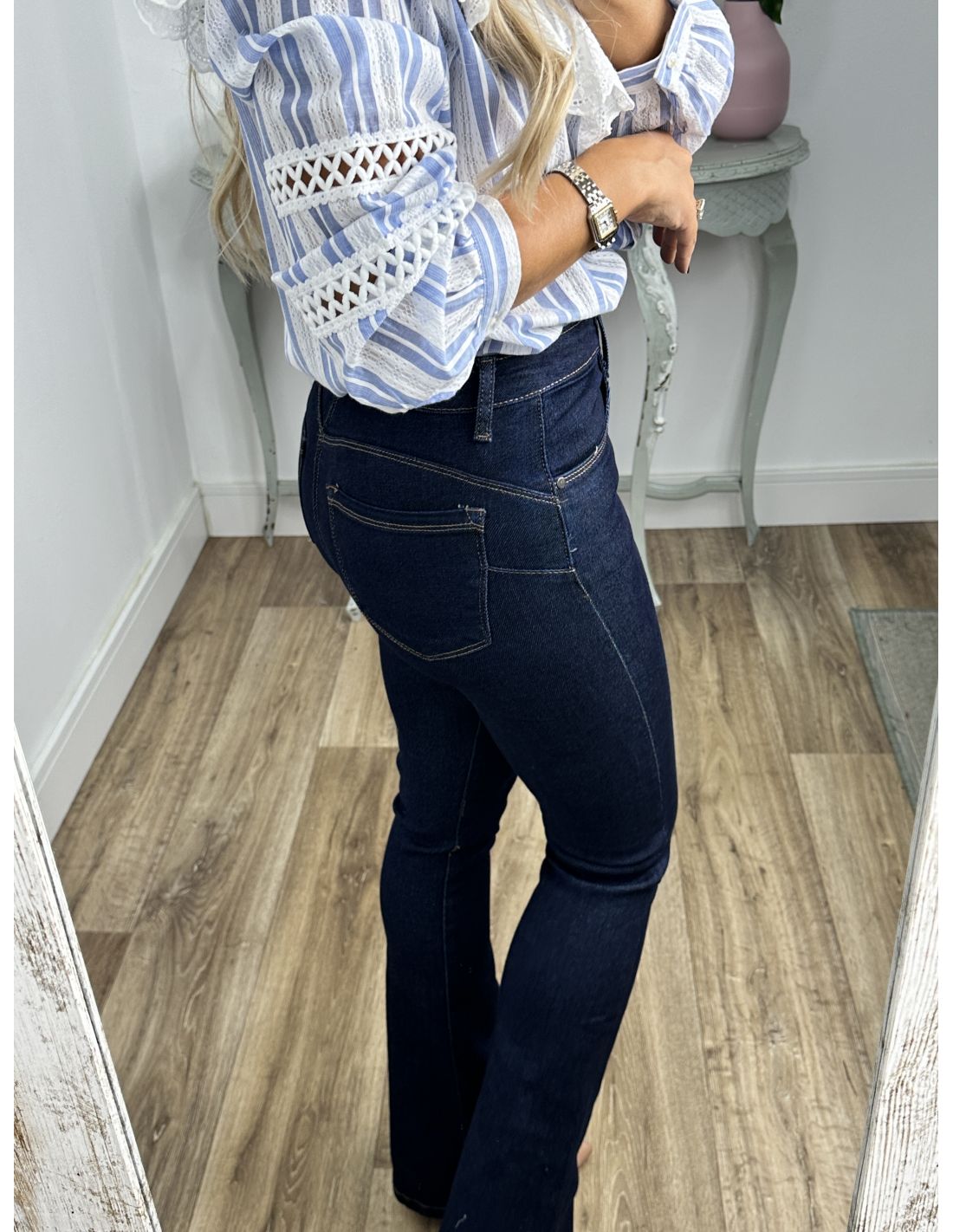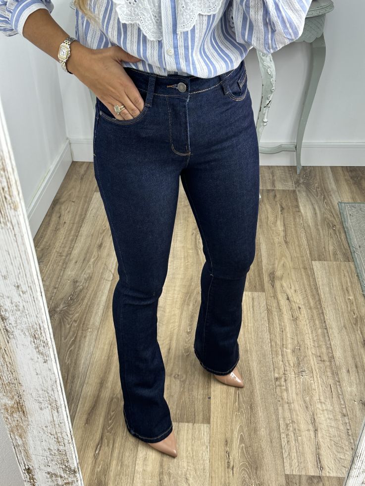 Jeans vaquero de campana. Talla normal recomendamos la talla habitual, si estás entre dos tallas coger la talla más pequeña. Si te gustan ajustados coger una talla menos de la habitual.Tiro medio por debajo justo del ombligo. Son elásticos.