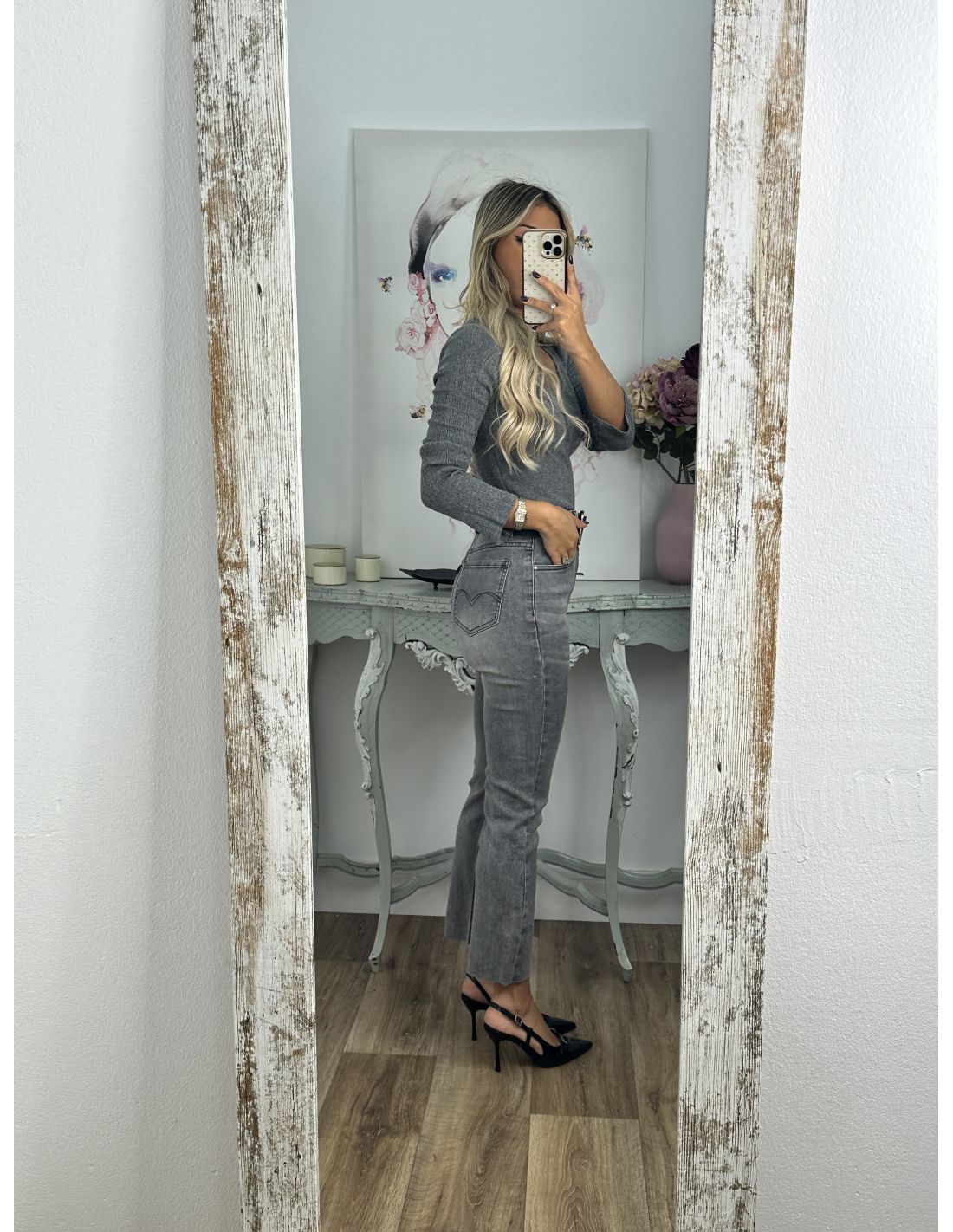Jeans de tiro alto elástico de corte recto. La parte de abajo no lleva dobladillo.