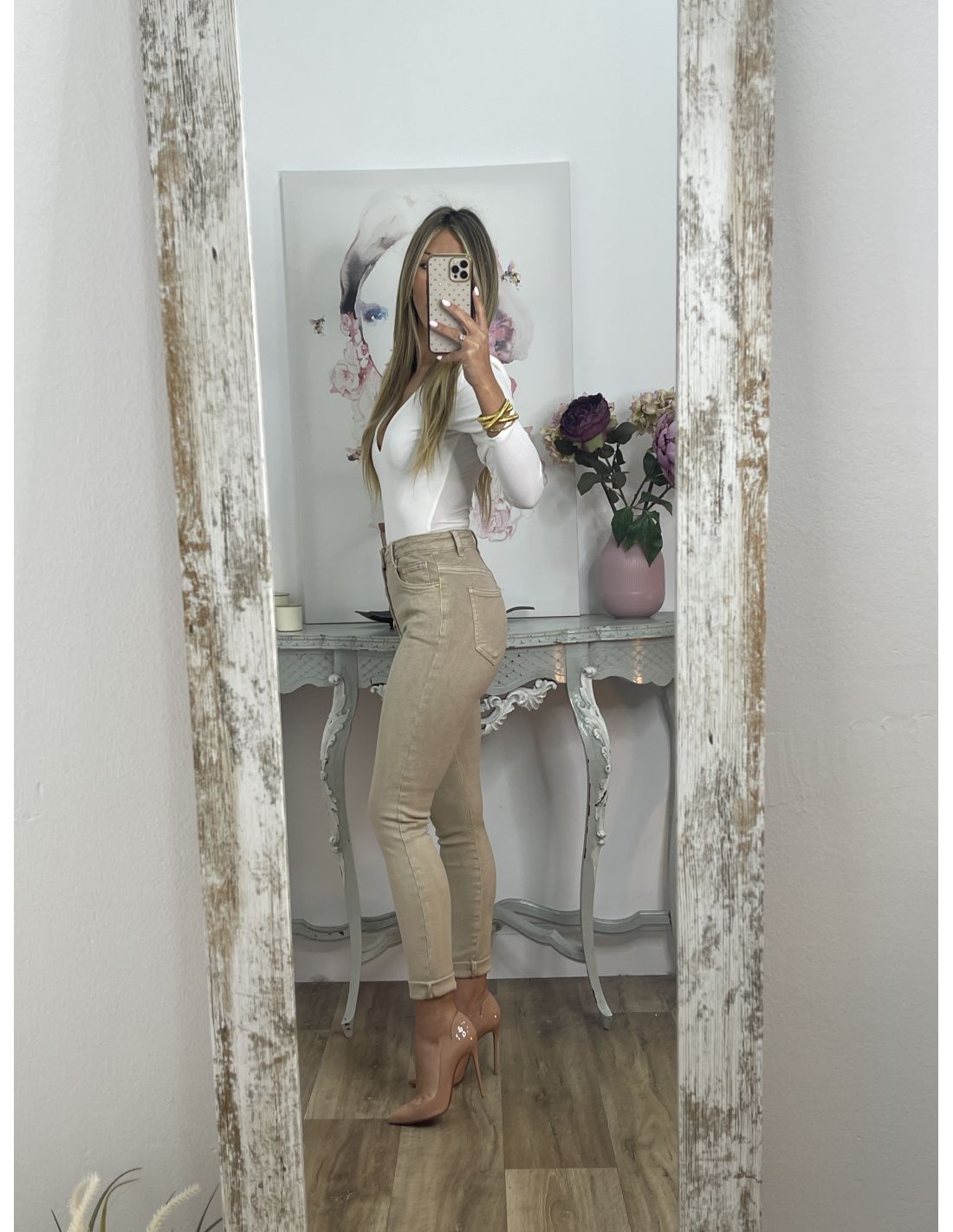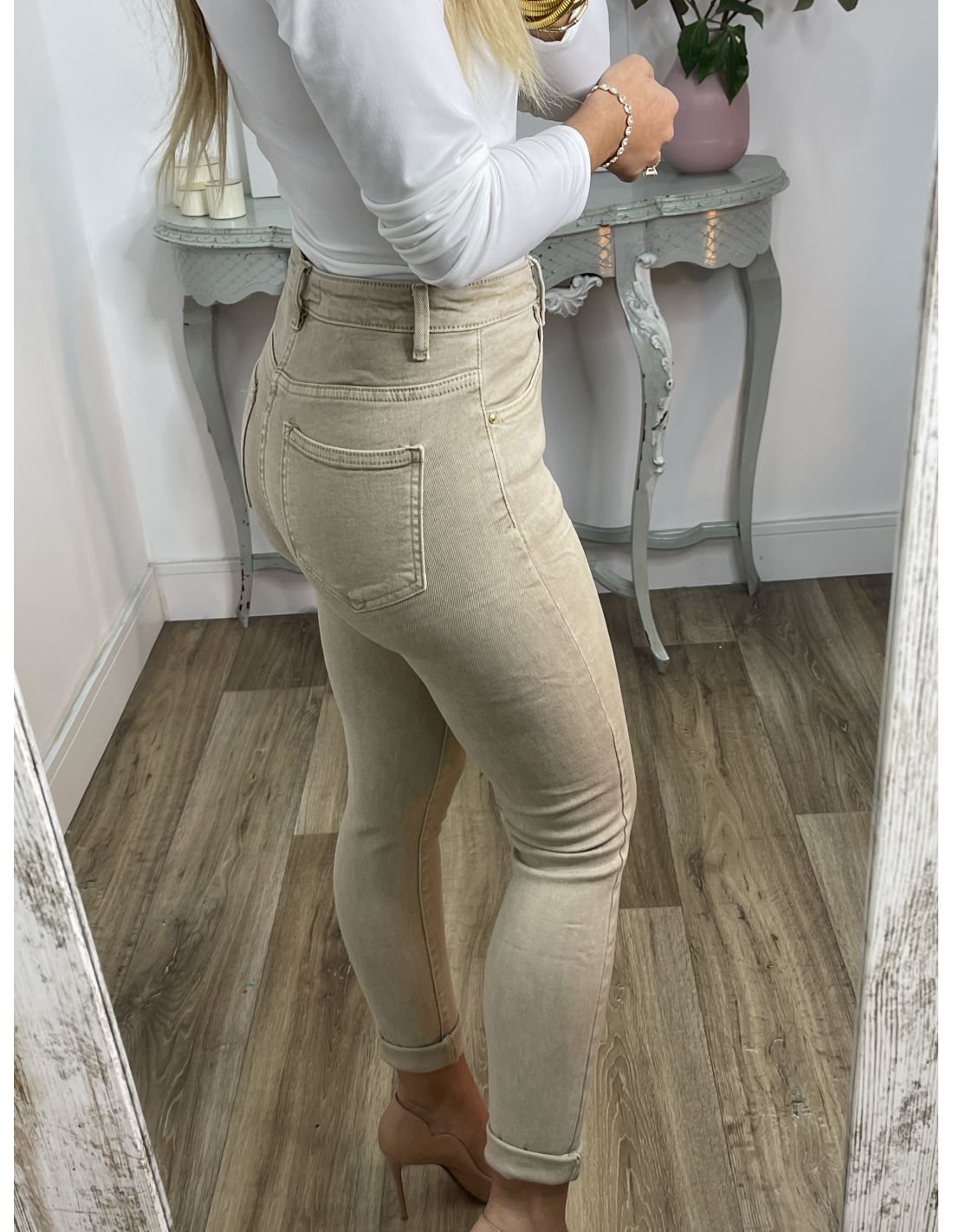 Jeans elásticos de tiro alto (por encima del ombligo). Llevan tapetas con un botón en la parte delantera. Si te gustan muy ajustados recomendamos coger una talla menos de la habitual.¡Ojo es un pelín más oscuro que se ve en la imagen por la luz!
