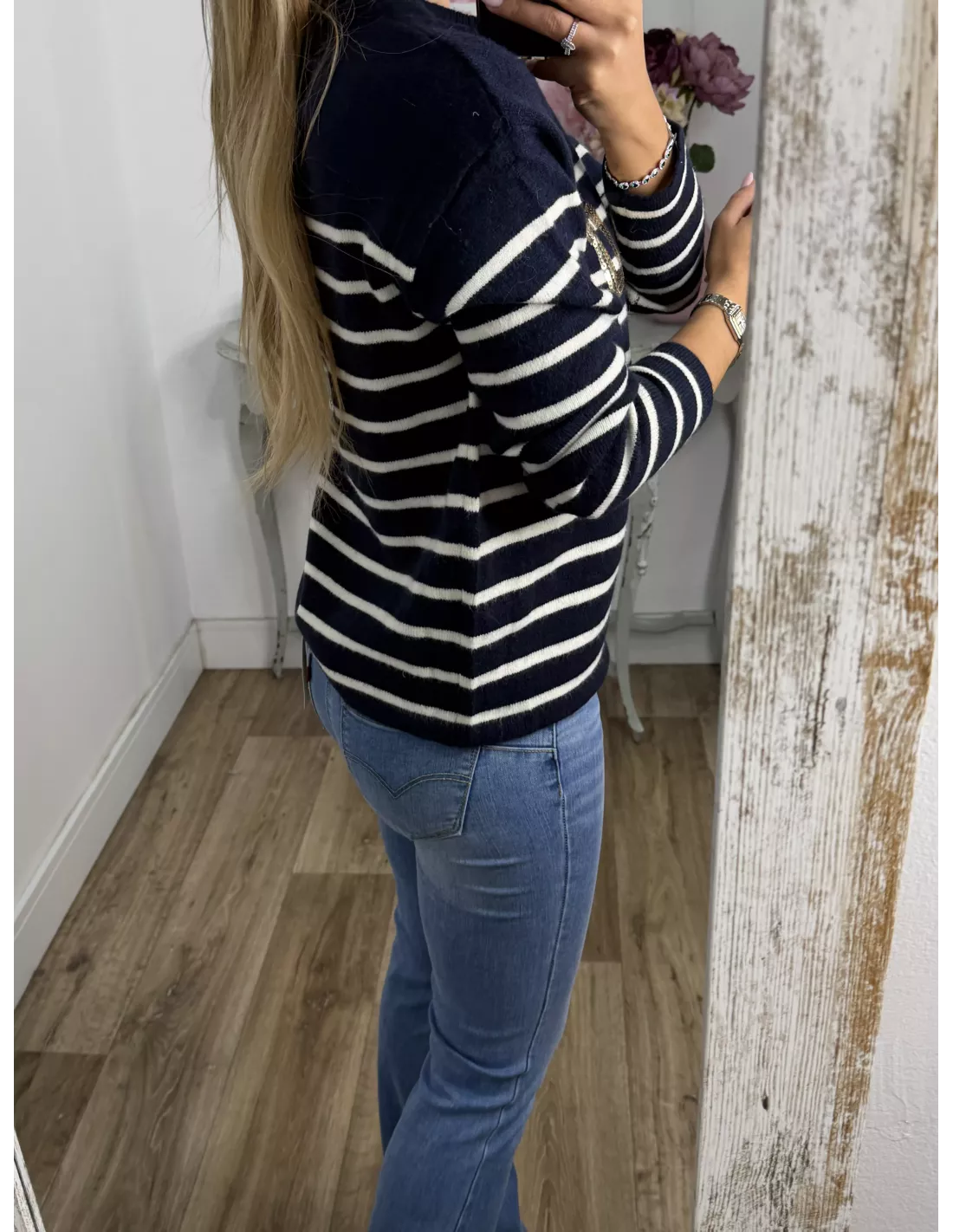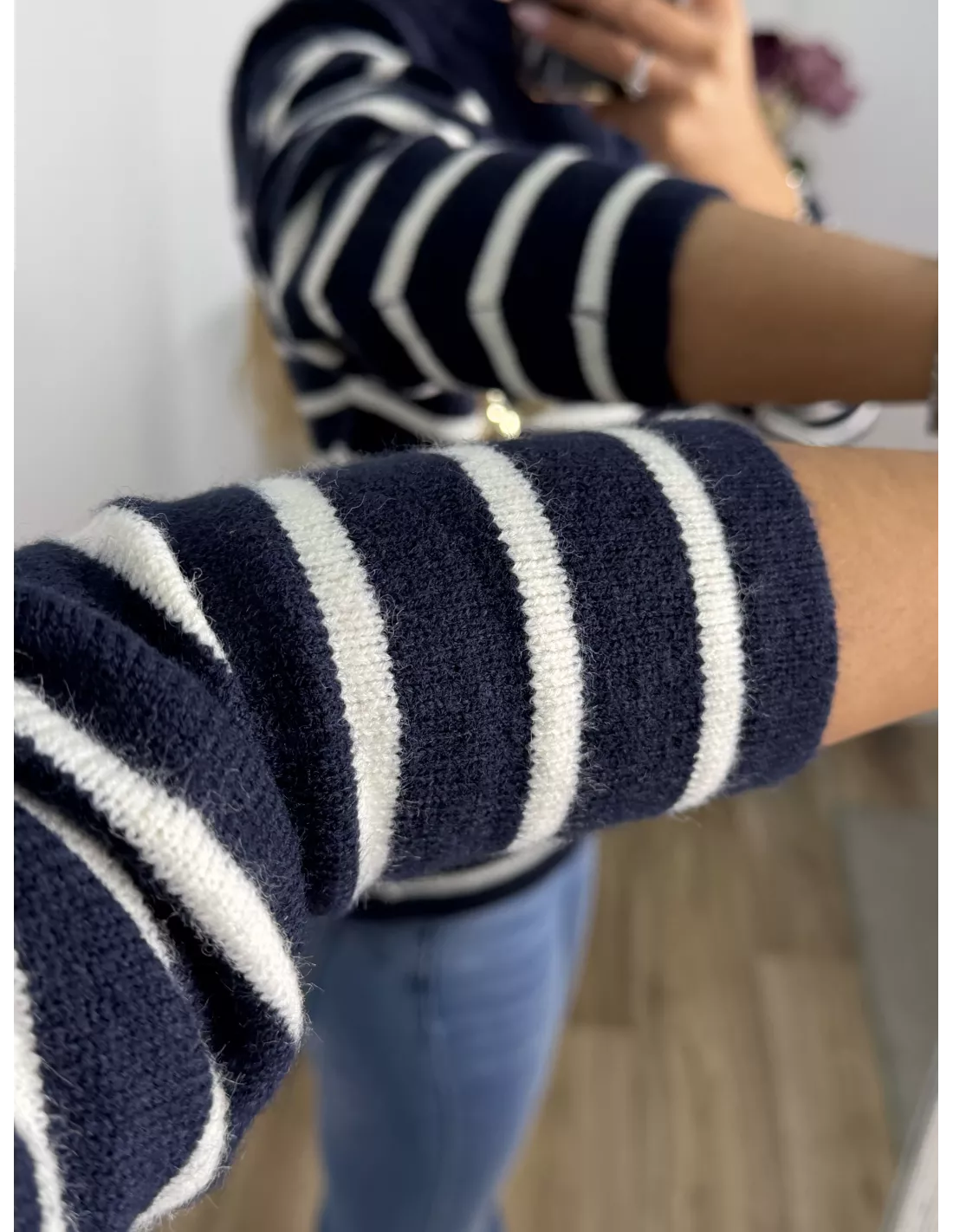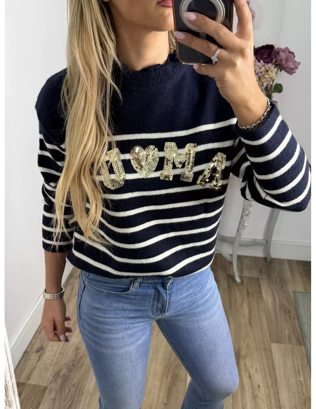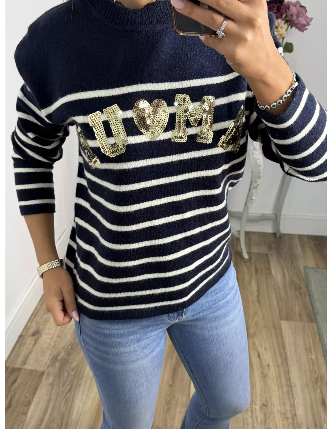 Jersey de cuello la caja de rayas, que lleva unas letras de lentejuela que pone “Amour”. El corte del jersey es recto. En la zona del cuello lleva una vista bordada a modo de volante en el interior.