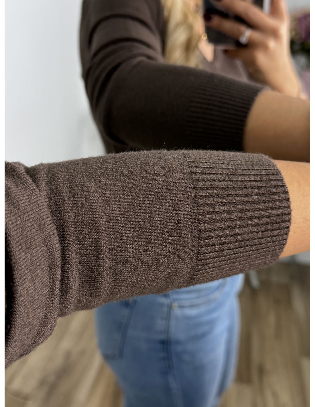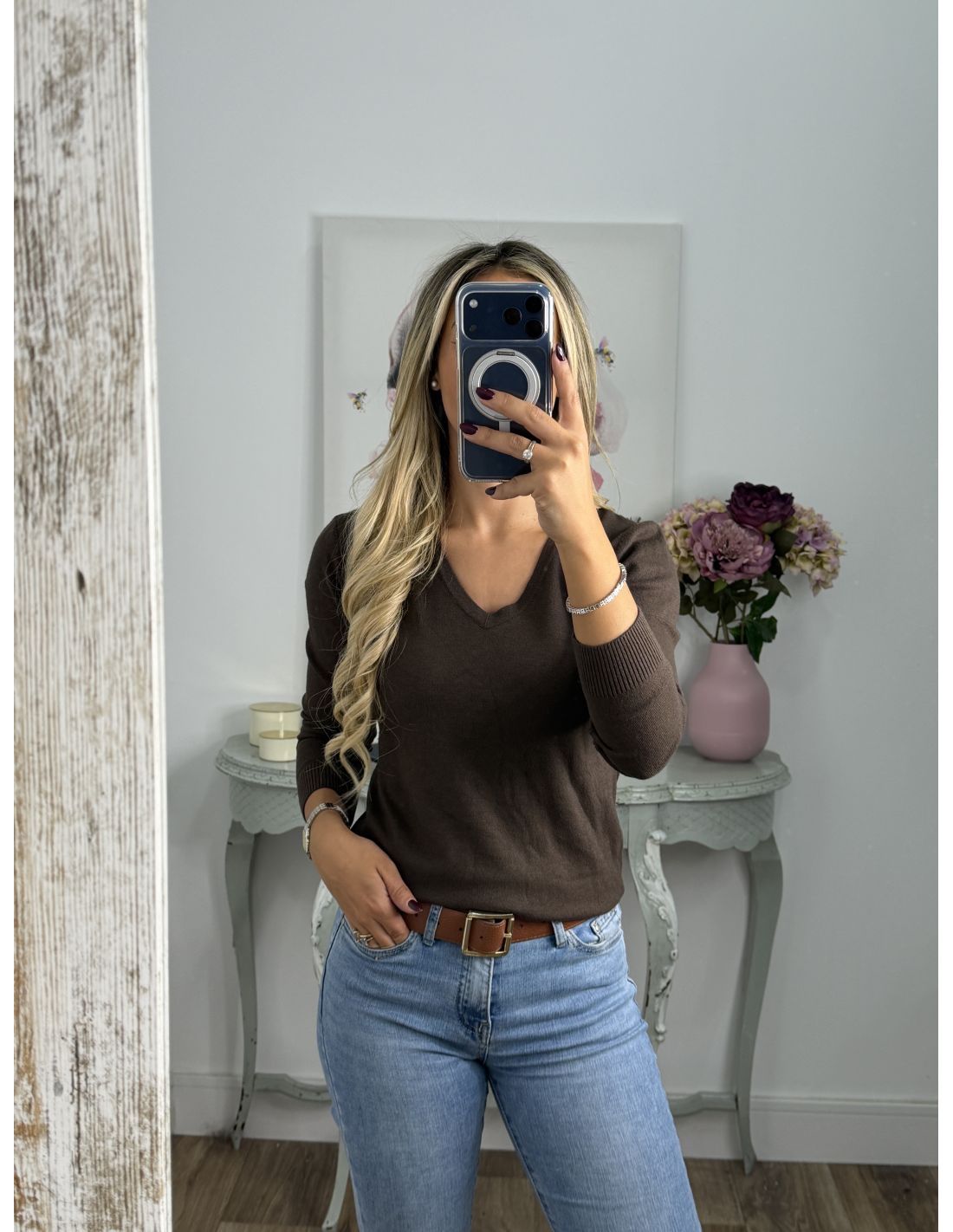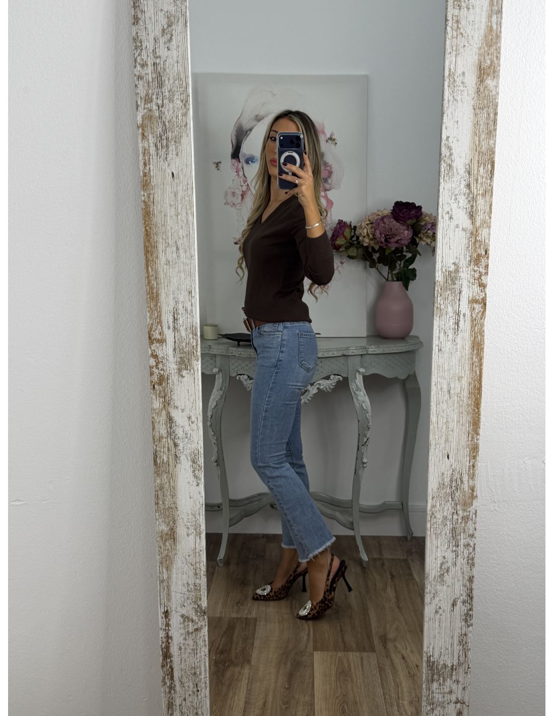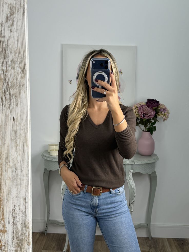 Jersey de cuello de pico de tacto, muy suave y agradable no pica nada. Es ajustado.