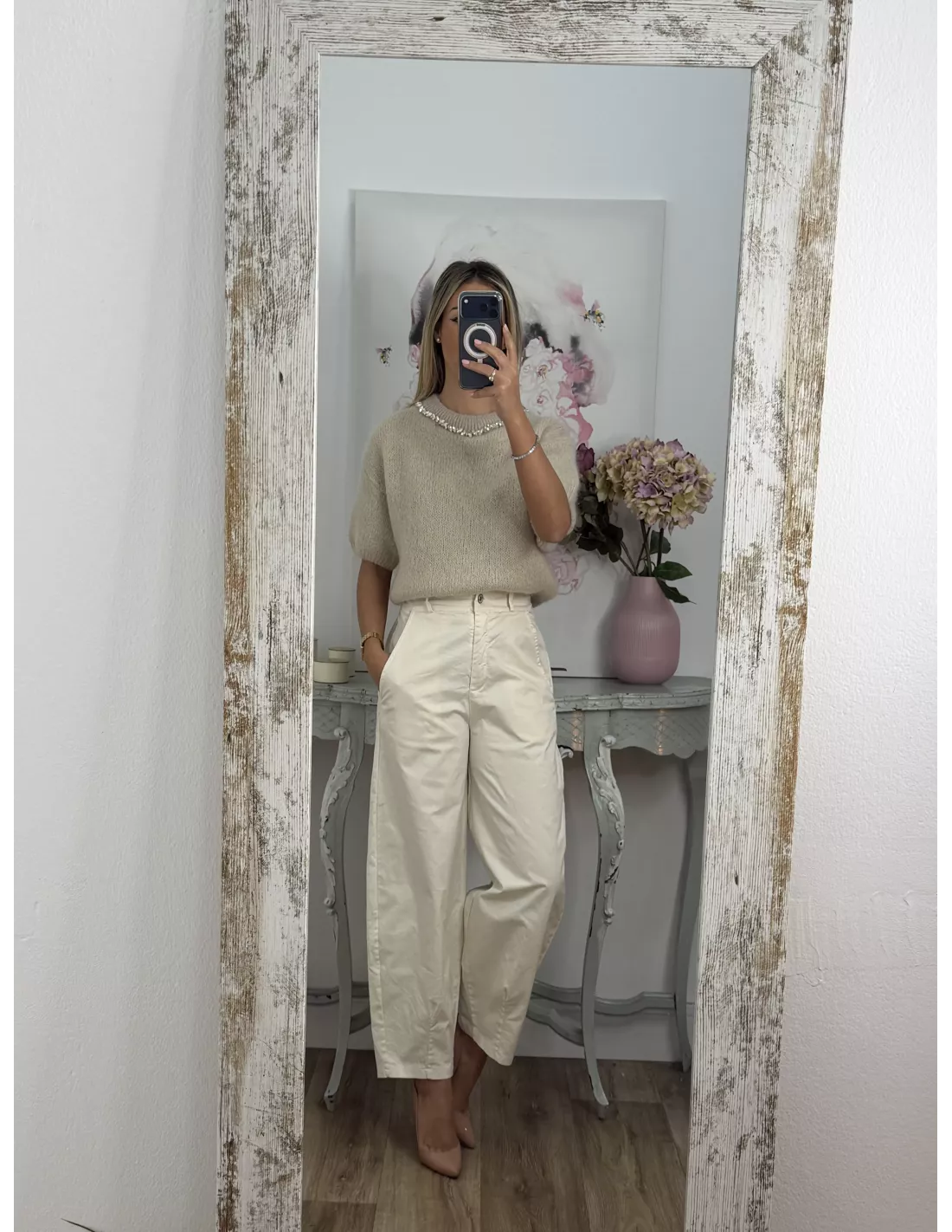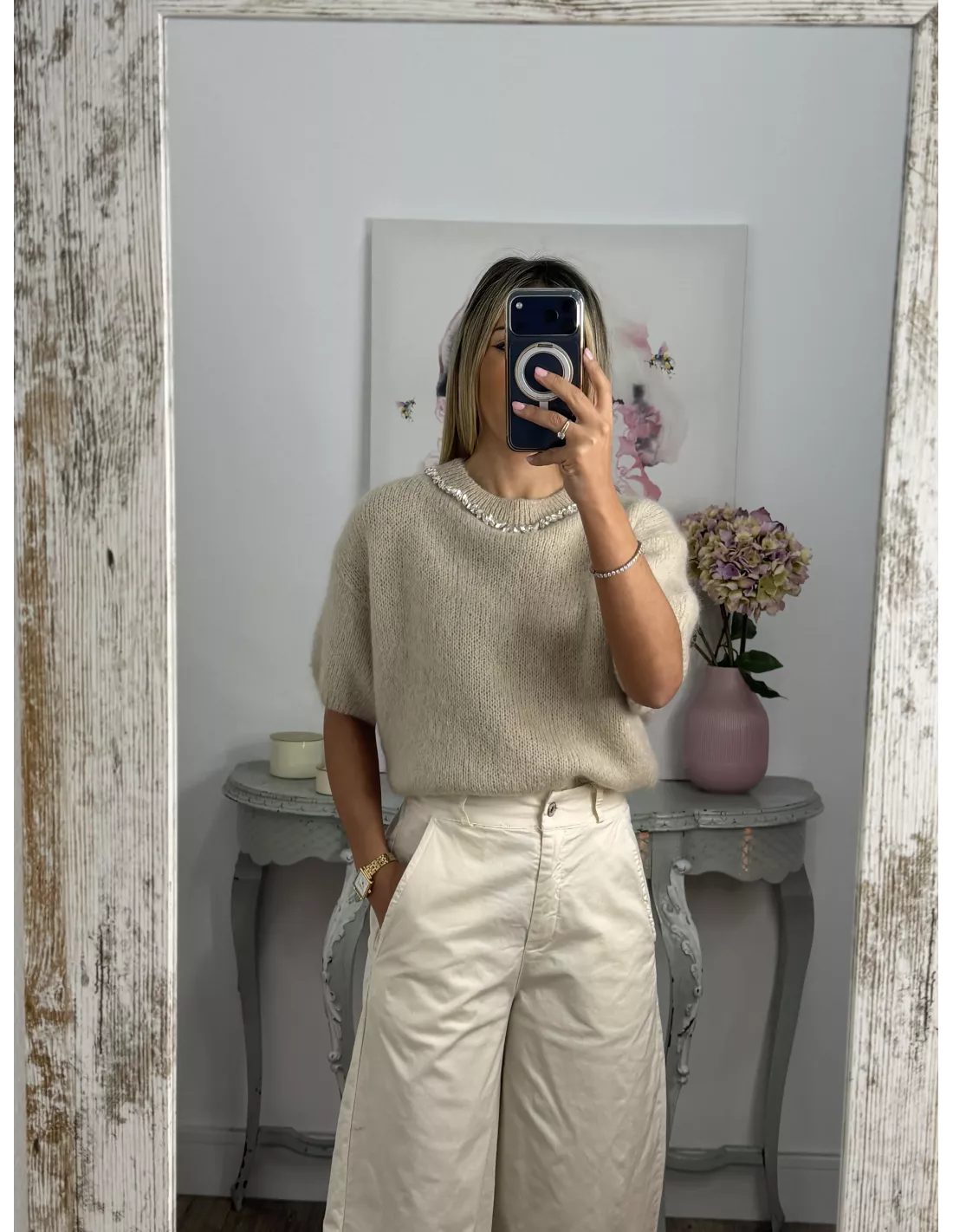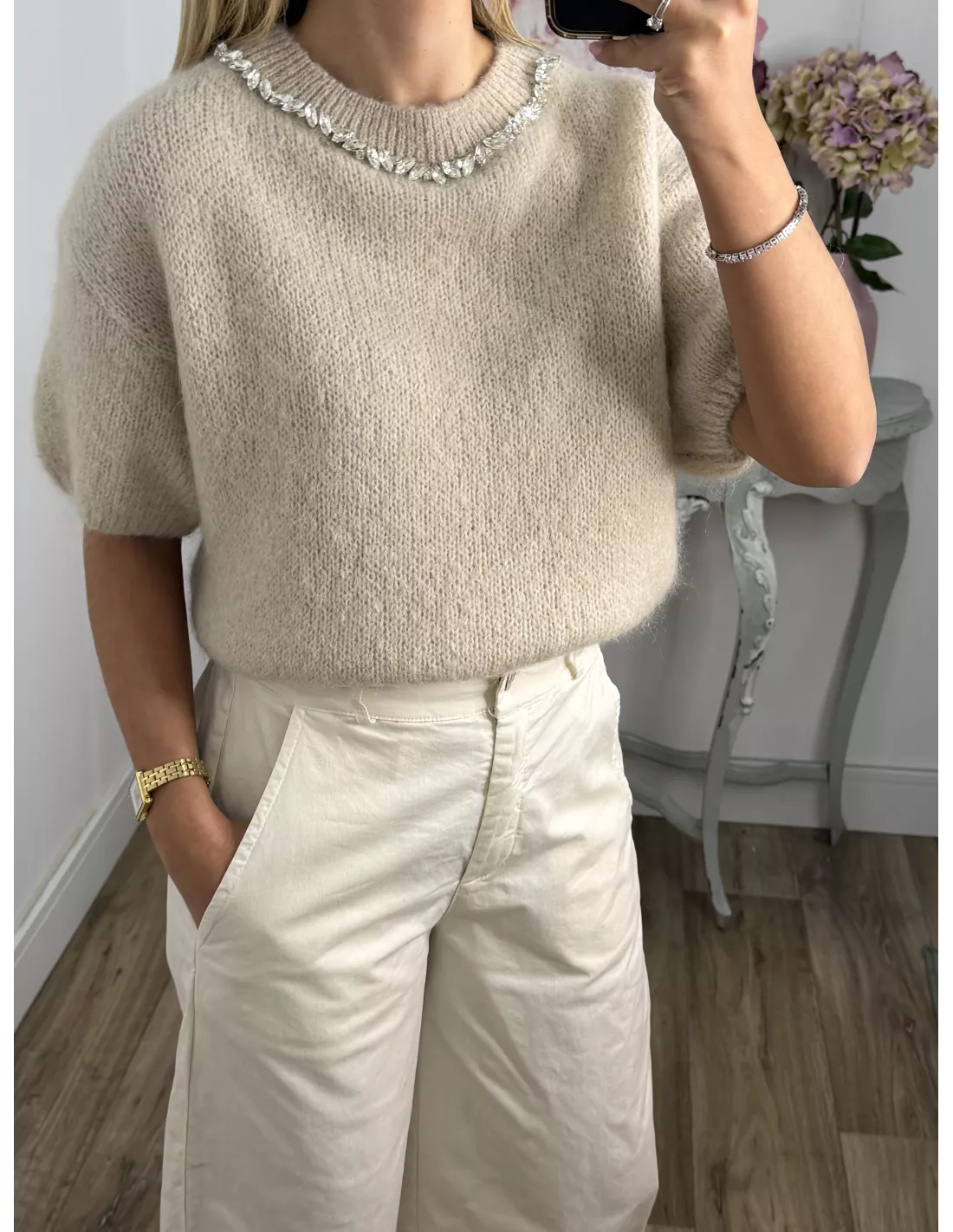 Jersey beige manga corta con cuello de piedras