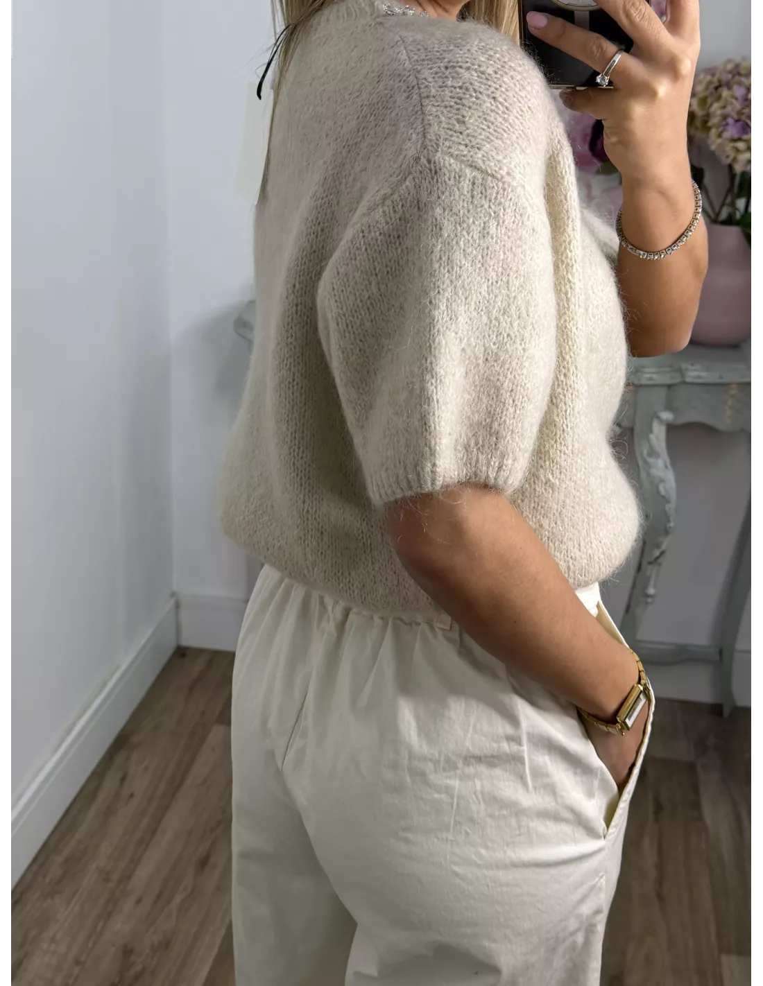 Jersey de cuello a la caja que en la zona del cuello lleva cocido unas piedras. Es de manga corta, efecto globo. ¡Ojo Eres un poquito sensible a que te piquen las prendas cuidado con este jersey te puede picar un poco!