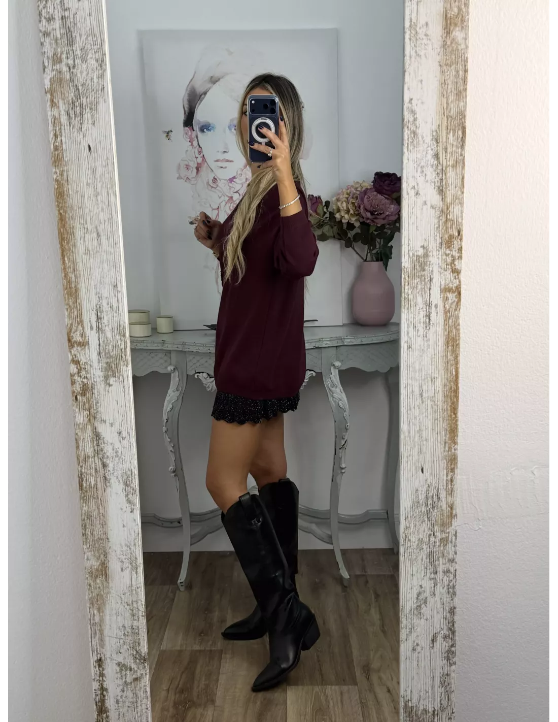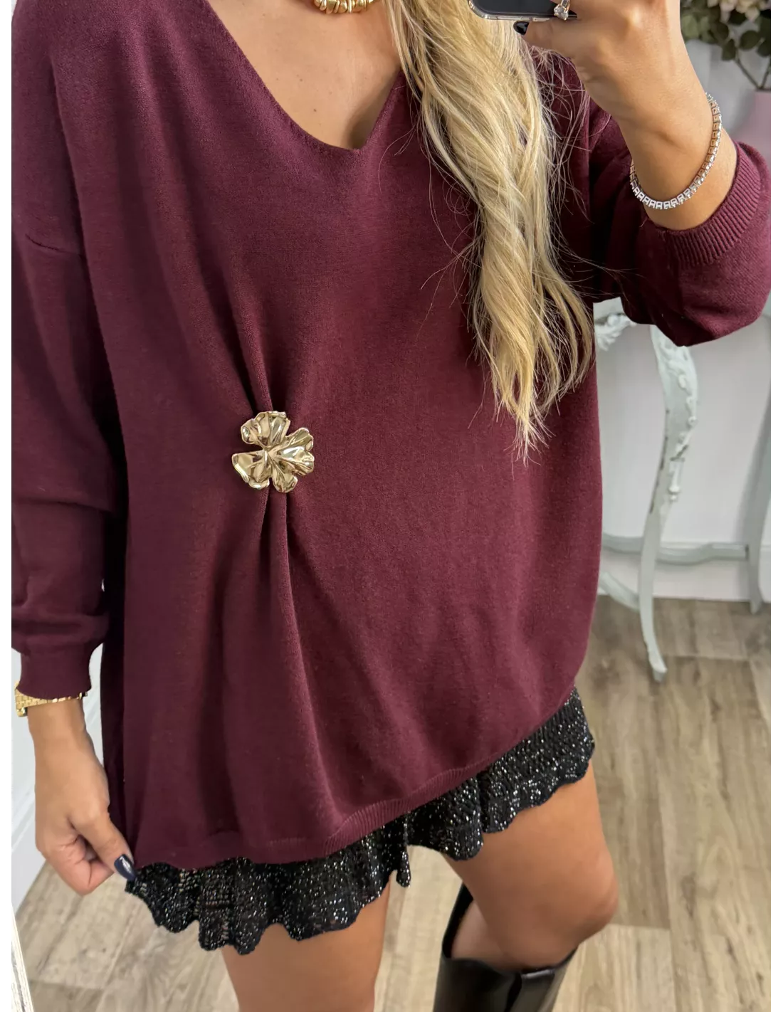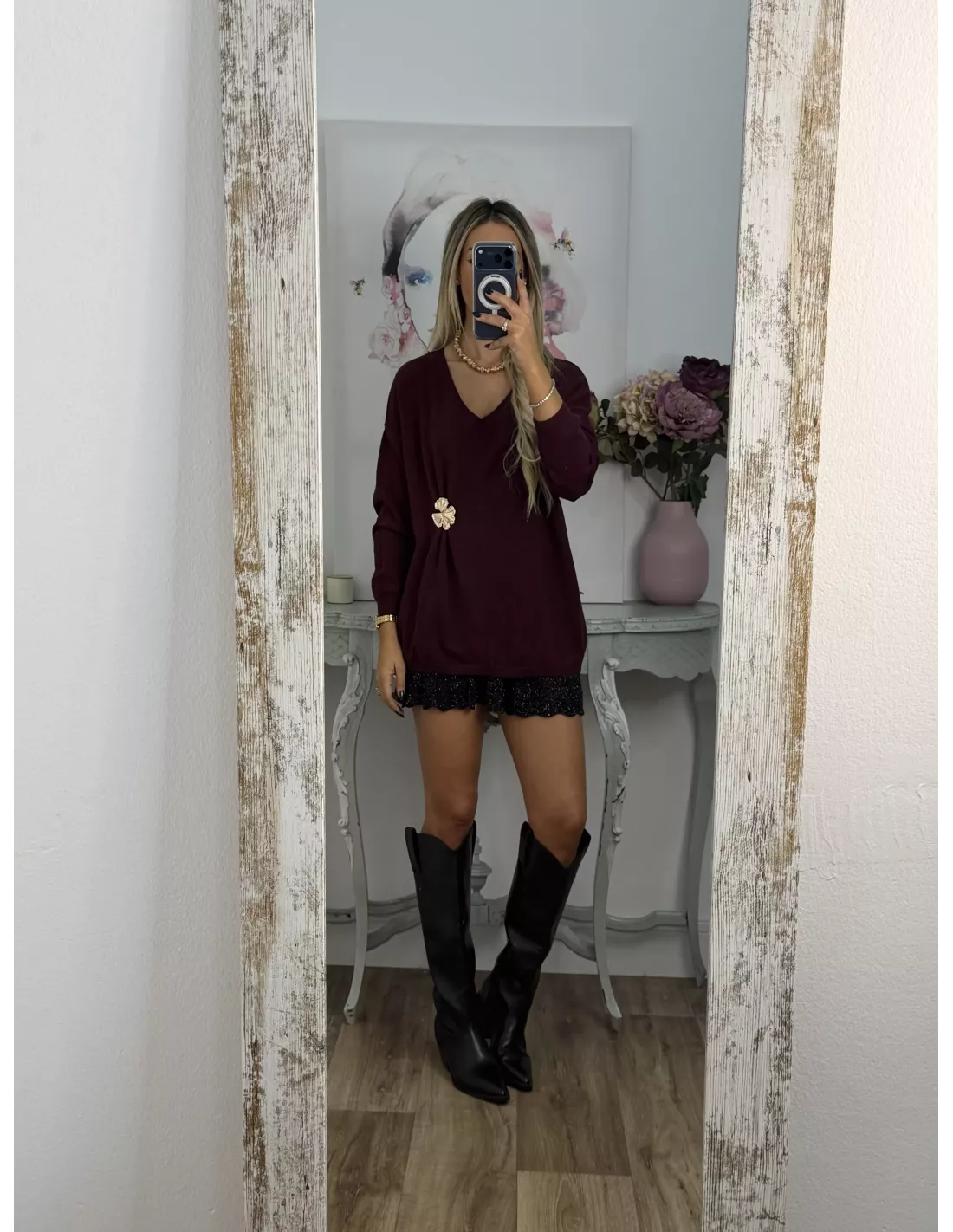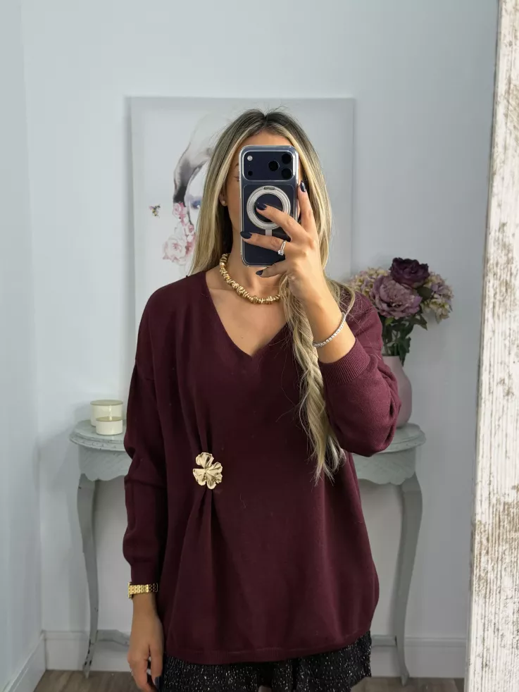 Jersey de punto de tacto, muy suave con cuello de pico de corte amplio y que llevo un broche en la parte de abajo, que se puede quitar que es dorado y es una flor.