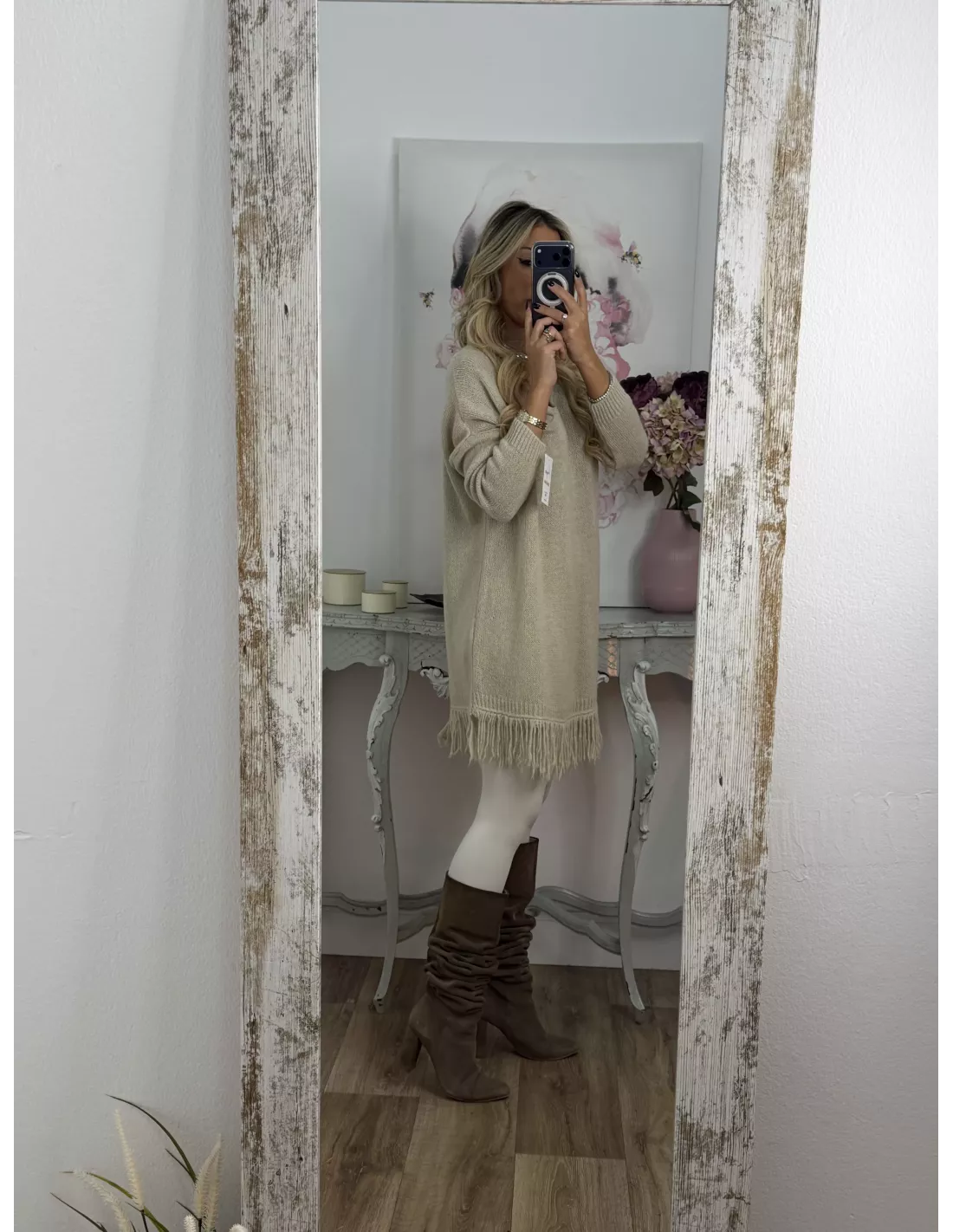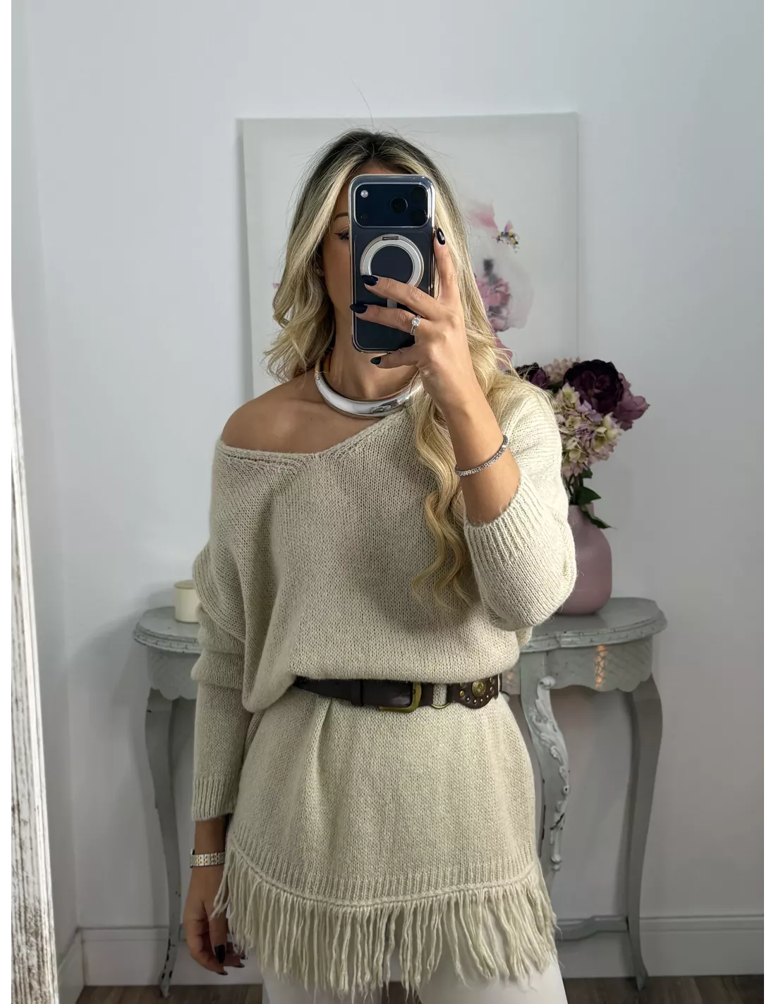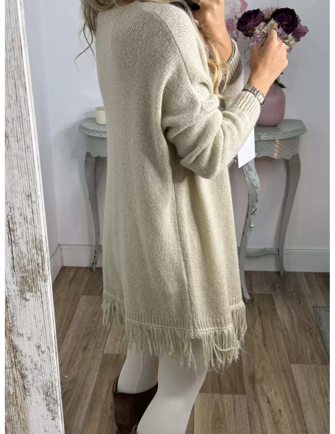 Medidas: hombro oversize, pecho 64 cm, largo, incluyendo los flecos 80 cm