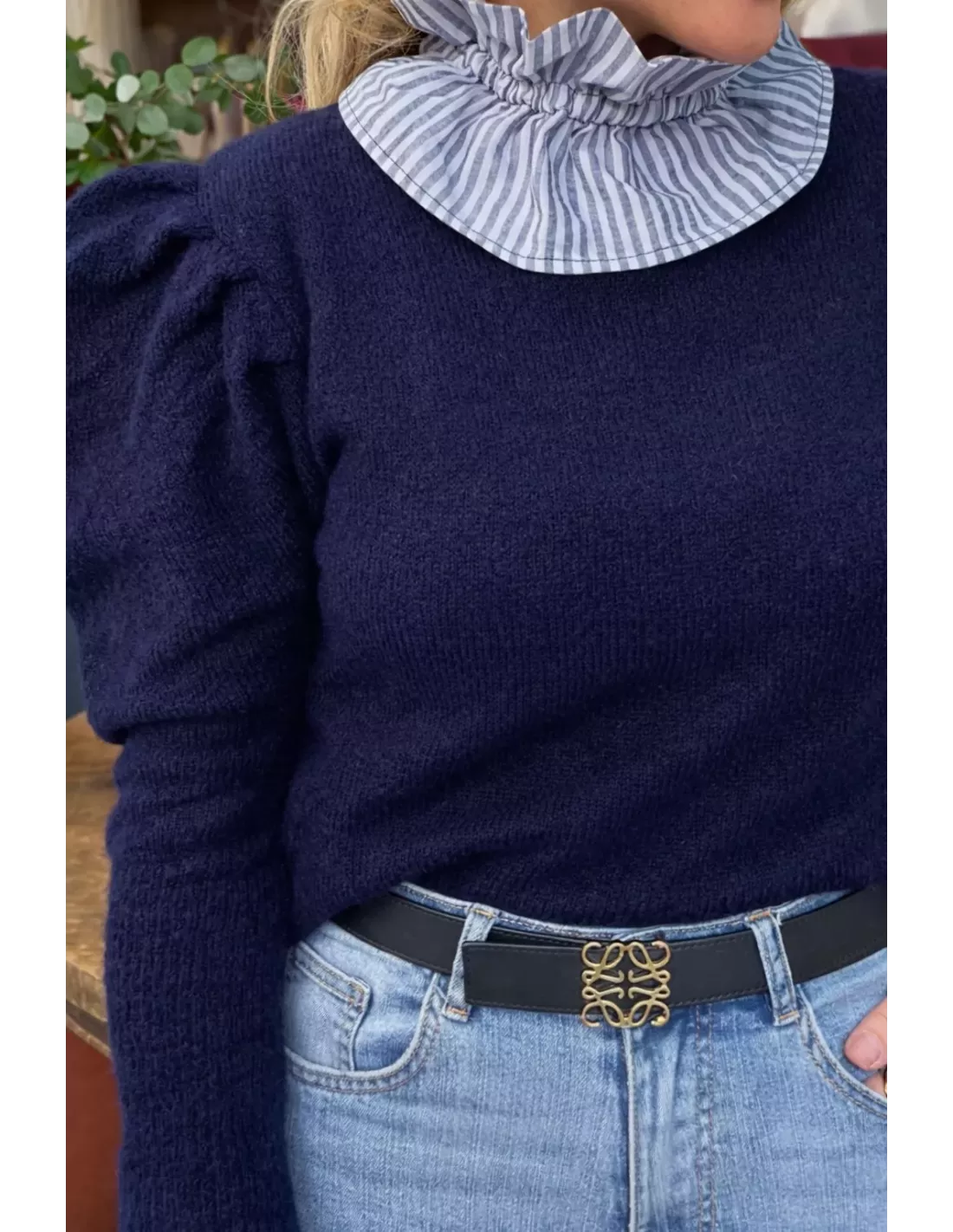 Jersey de cuello a la caja con manga farol. No incluye el cuello y los puños de cuadros vichy, se venden por separado, disponibles sección accesorios.