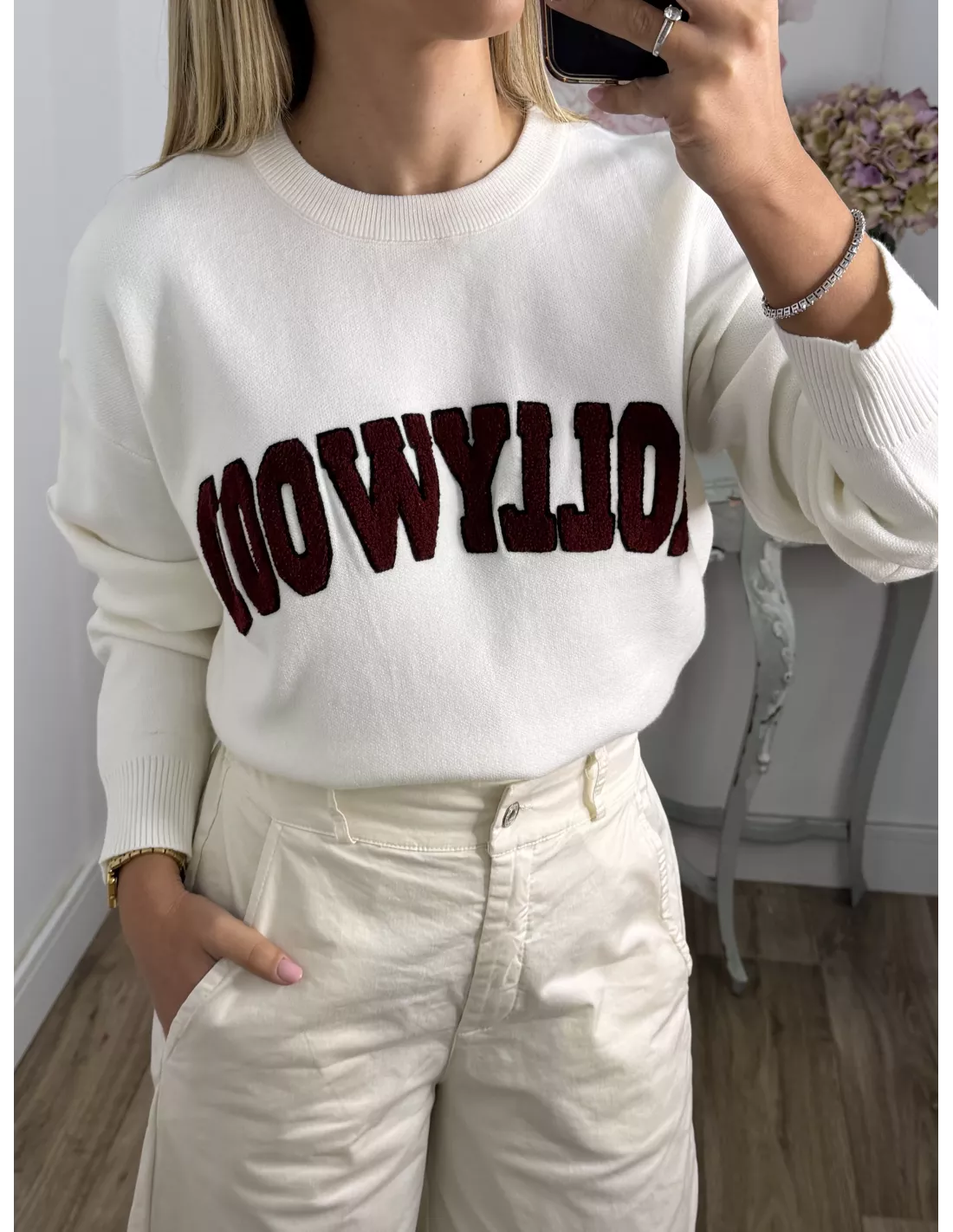 Jersey de cuello la caja de tacto muy suave. Lleva unas letras bordadas donde pone “Hollywood”.