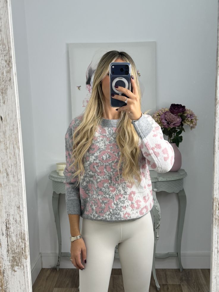 Jersey de cuello la caja de corte recto con dibujo de Animal print lleva una lentejuela muy pequeña por todo el jersey. No pica nada